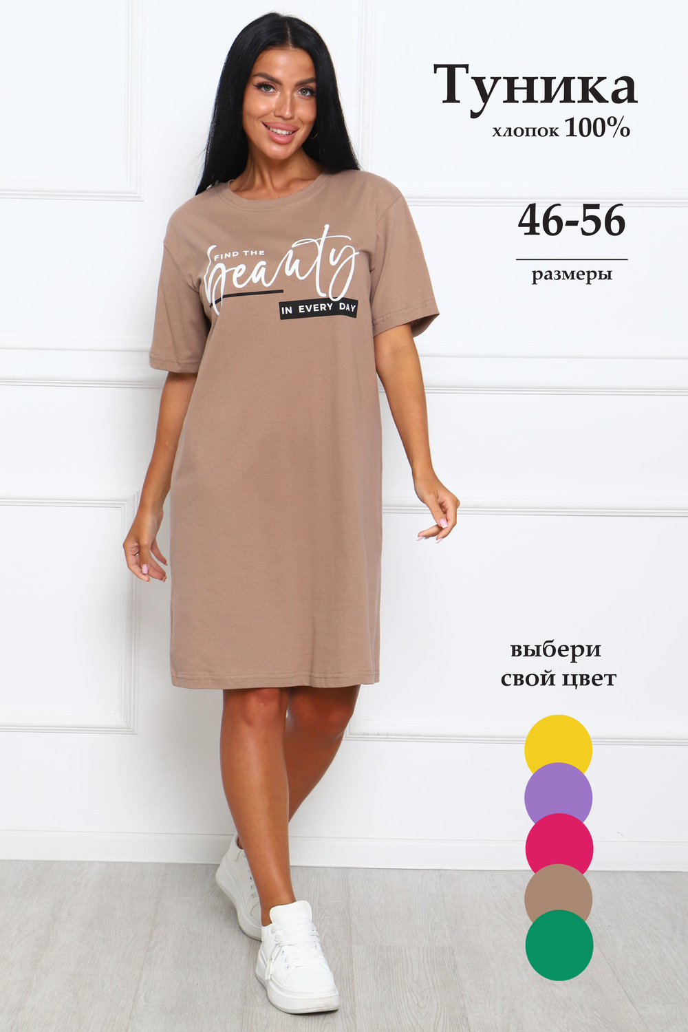 Туника женская прямого силуэта. Низ изделия прямой. Длинна выше колена, плечо спущенное, рукав короткий. Горловина круглой формы, обработана планкой с отделочной строчкой по шву притачивания. Принт (шелкография) располагается по центру переда.