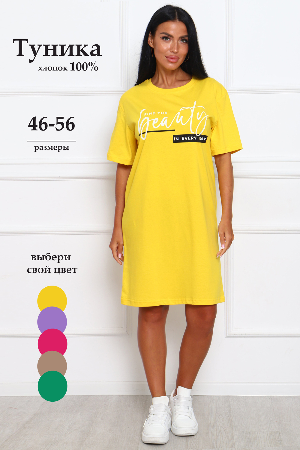 Туника женская прямого силуэта. Низ изделия прямой. Длинна выше колена, плечо спущенное, рукав короткий. Горловина круглой формы, обработана планкой с отделочной строчкой по шву притачивания. Принт (шелкография) располагается по центру переда.
