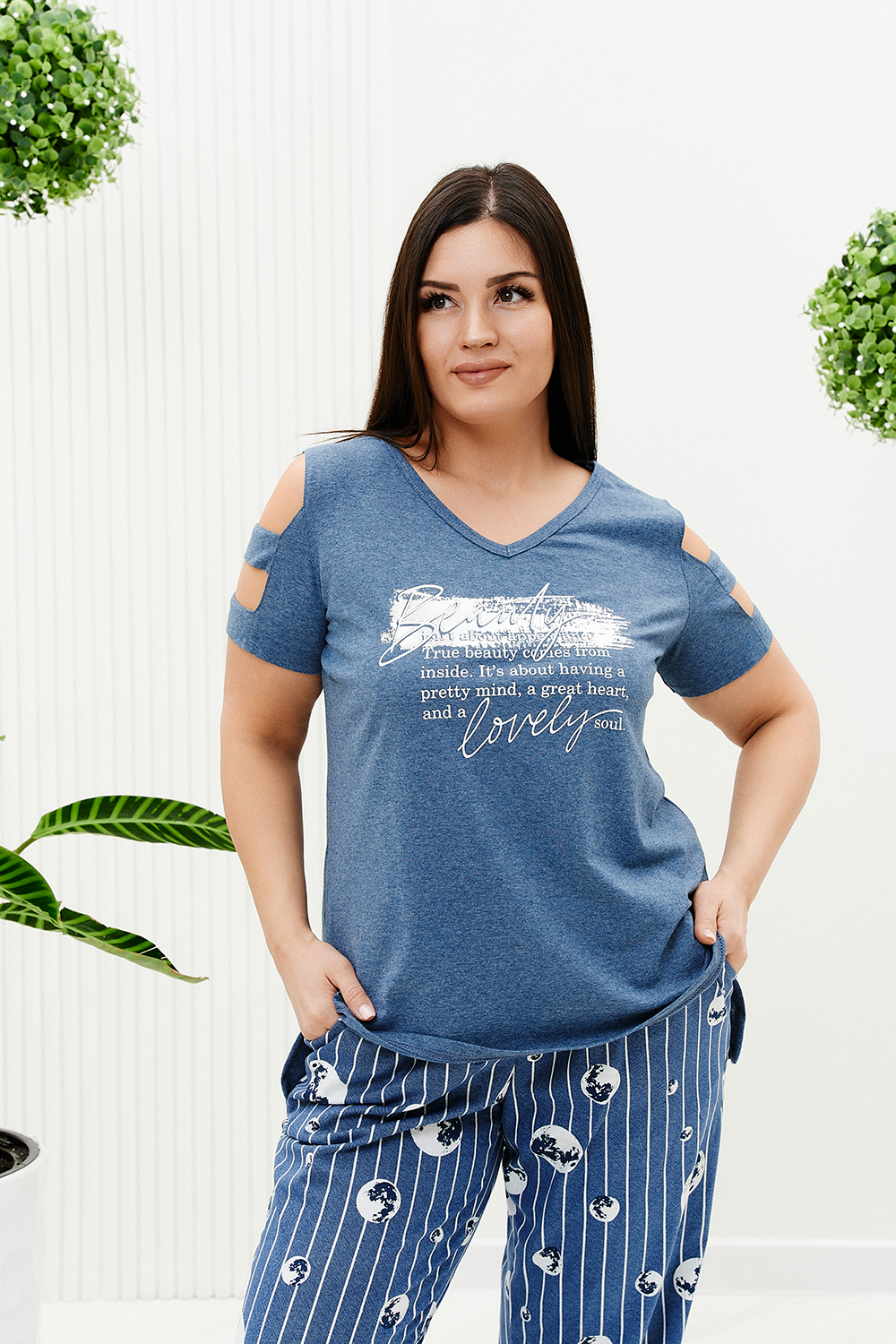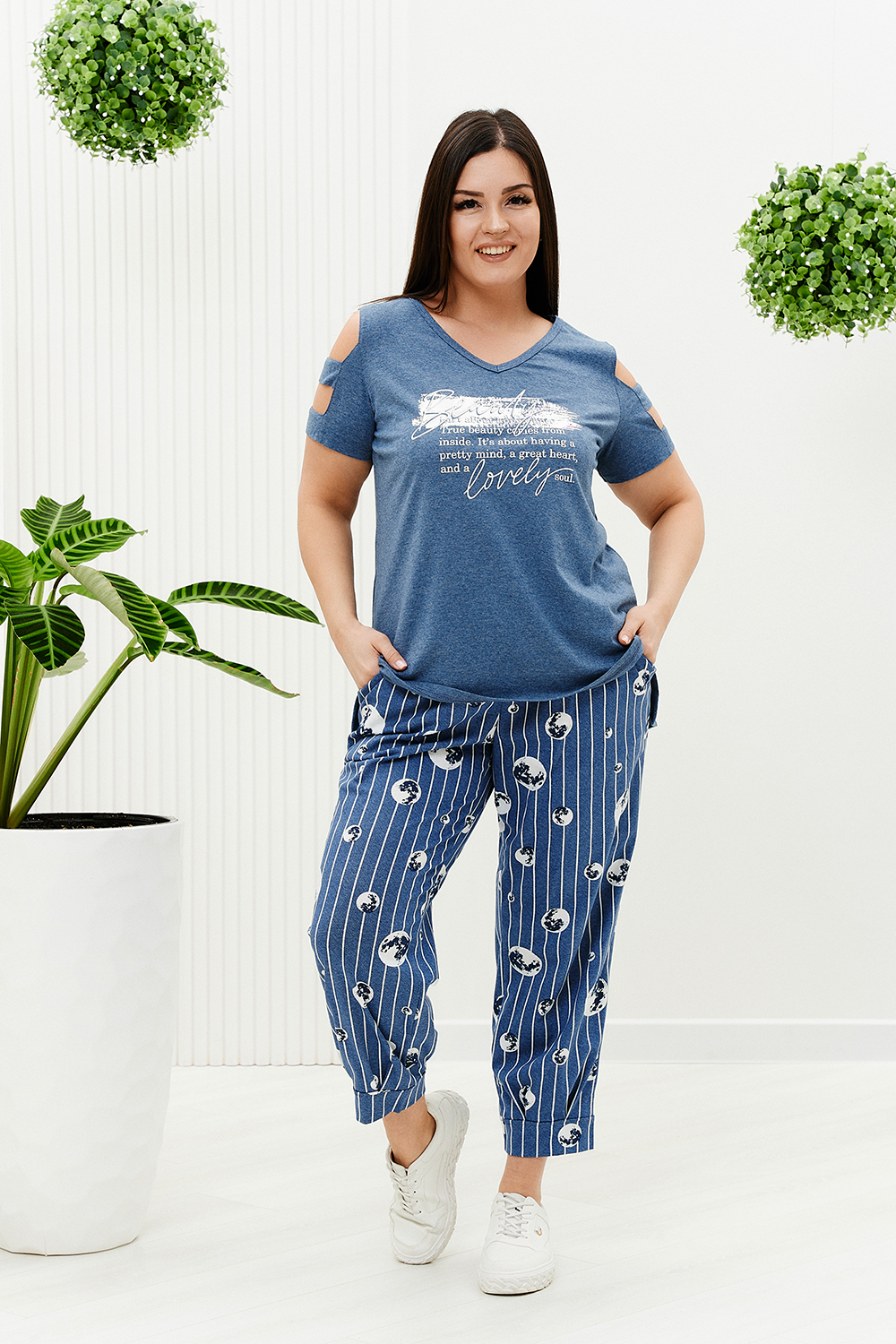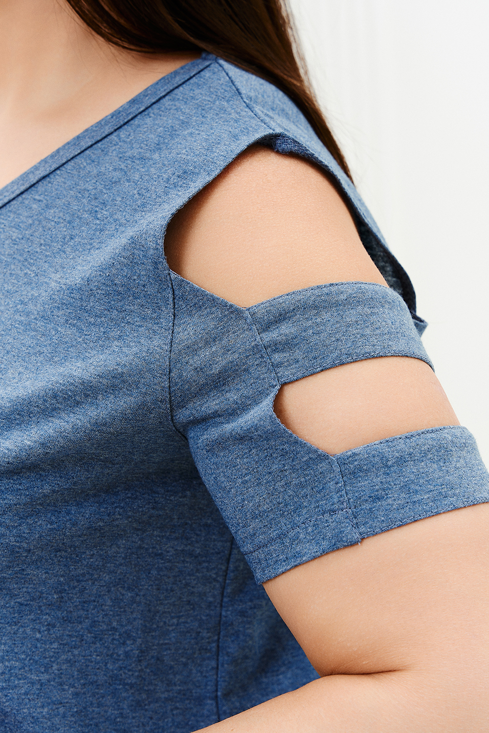 Туника прямого силуэта, вырез Y-образный. Полочка несколько короче спинки, сбоку разрезы. На полочке принт. Рукав не цельный, два хлястика, расположенные через расстояние друг от друга, втачаны в боковые части рукава.