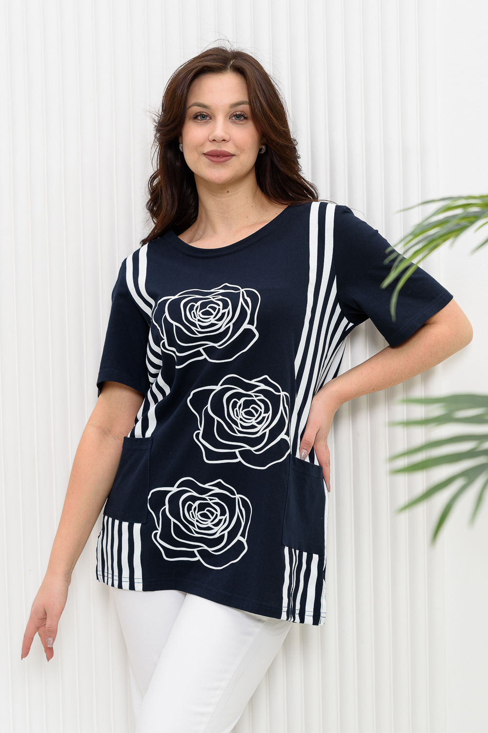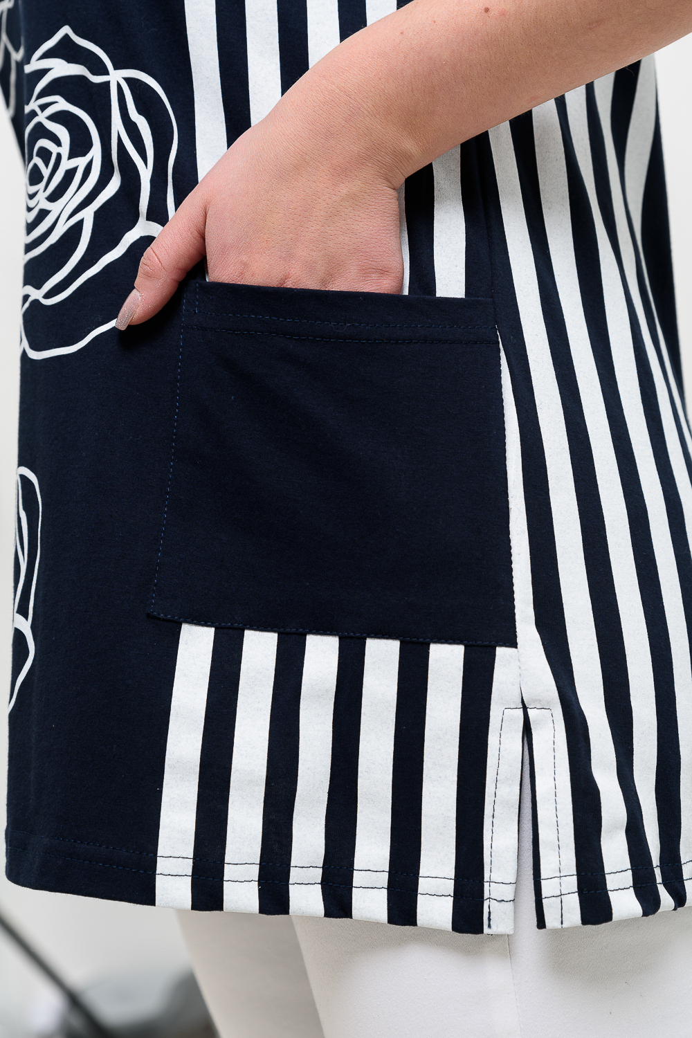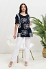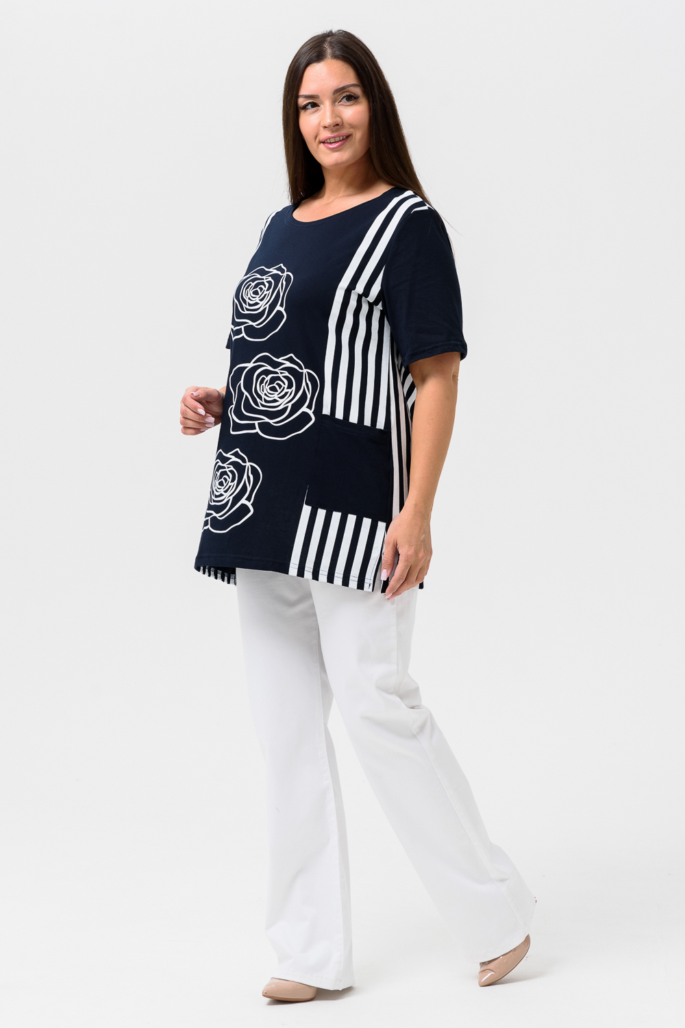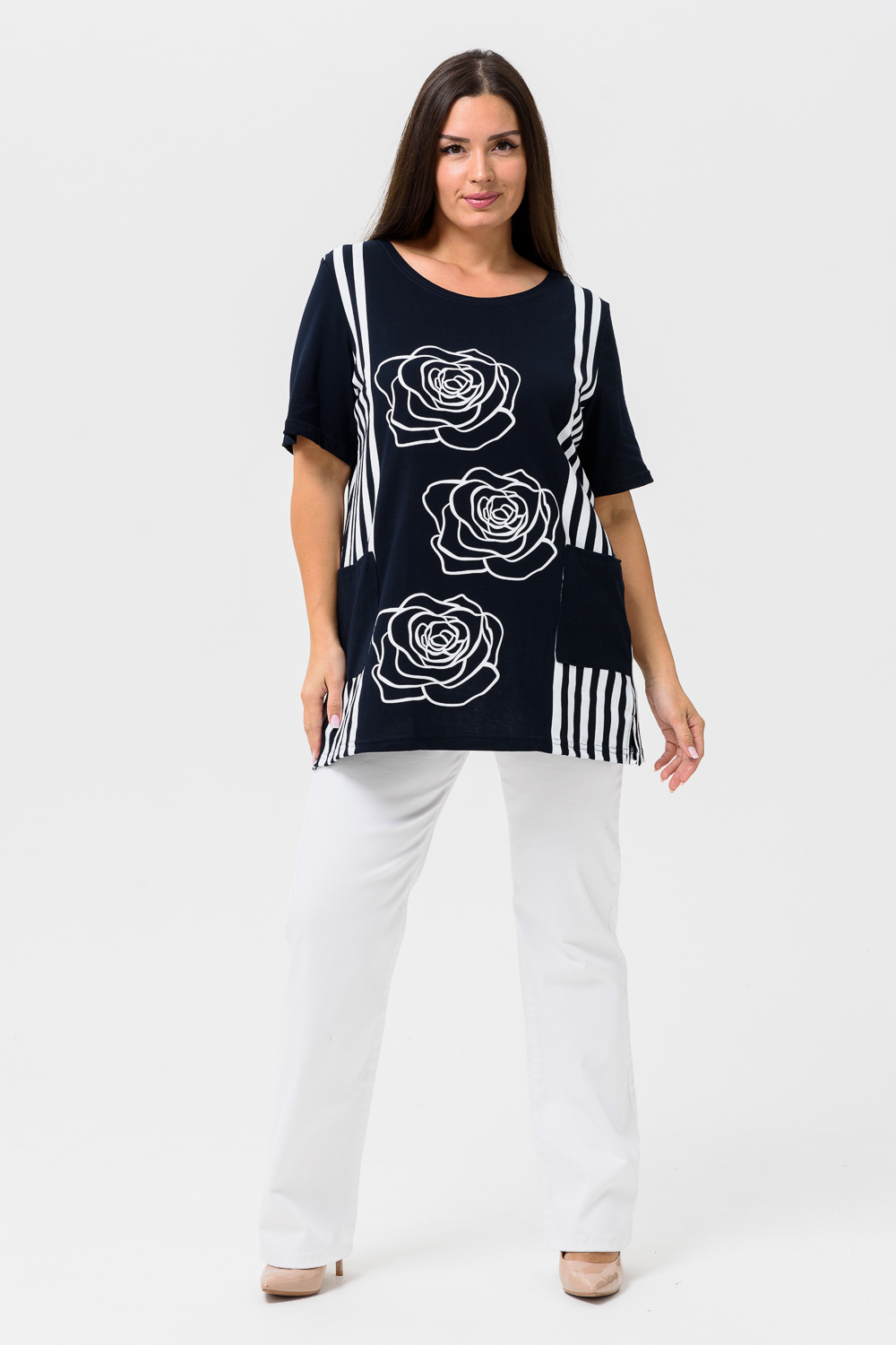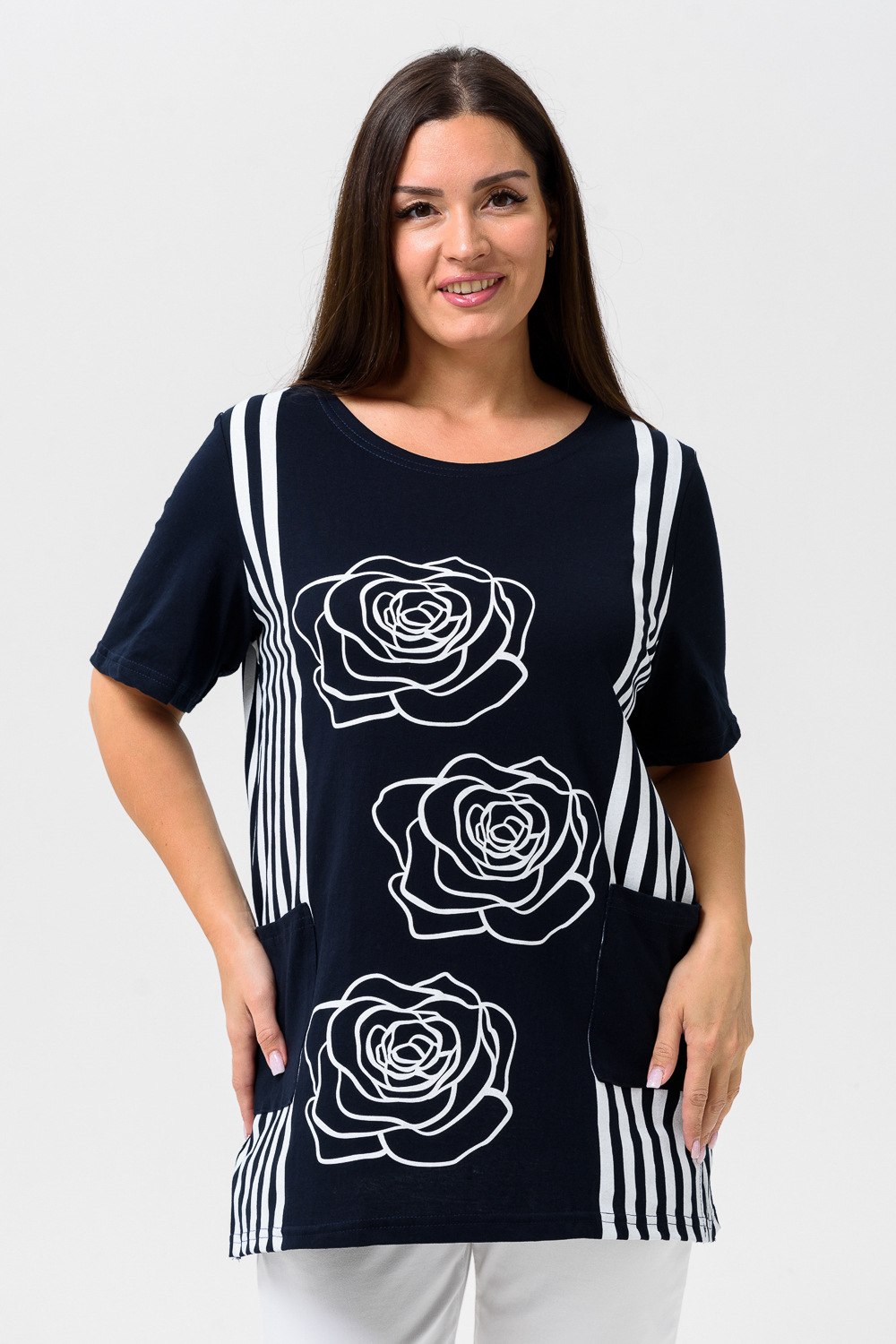 Туника женская полуприлегающего силуэта. Горловина округлая. Рукав цельнокроеный, короткий. На полочке два накладных кармана, в боковых швах разрезы. Принт на полочке и спинке.
