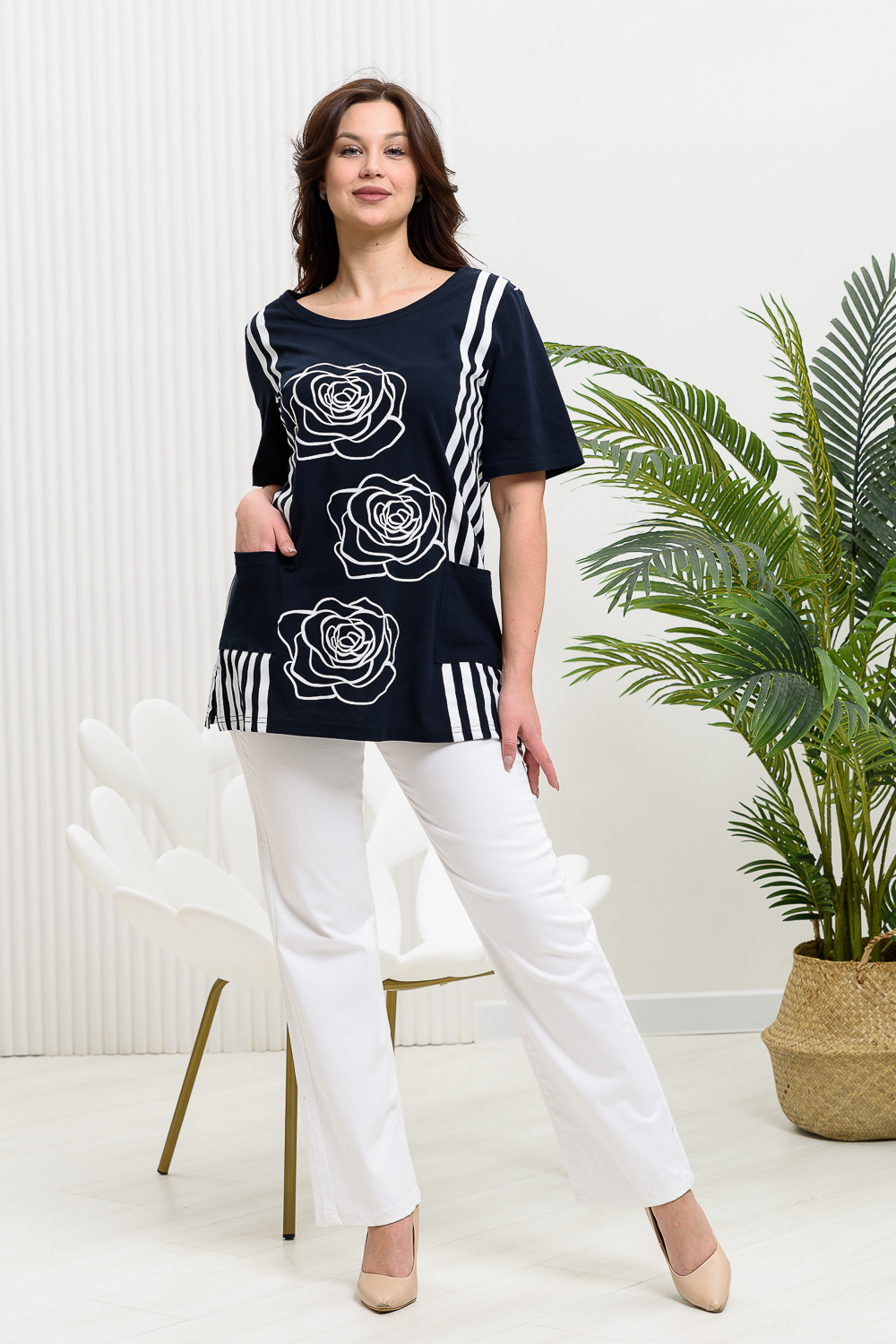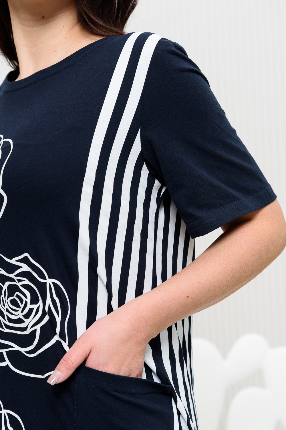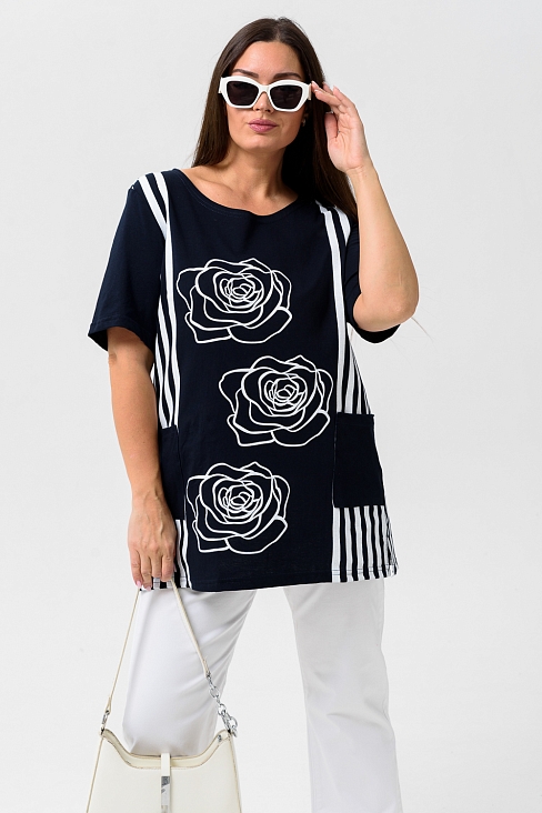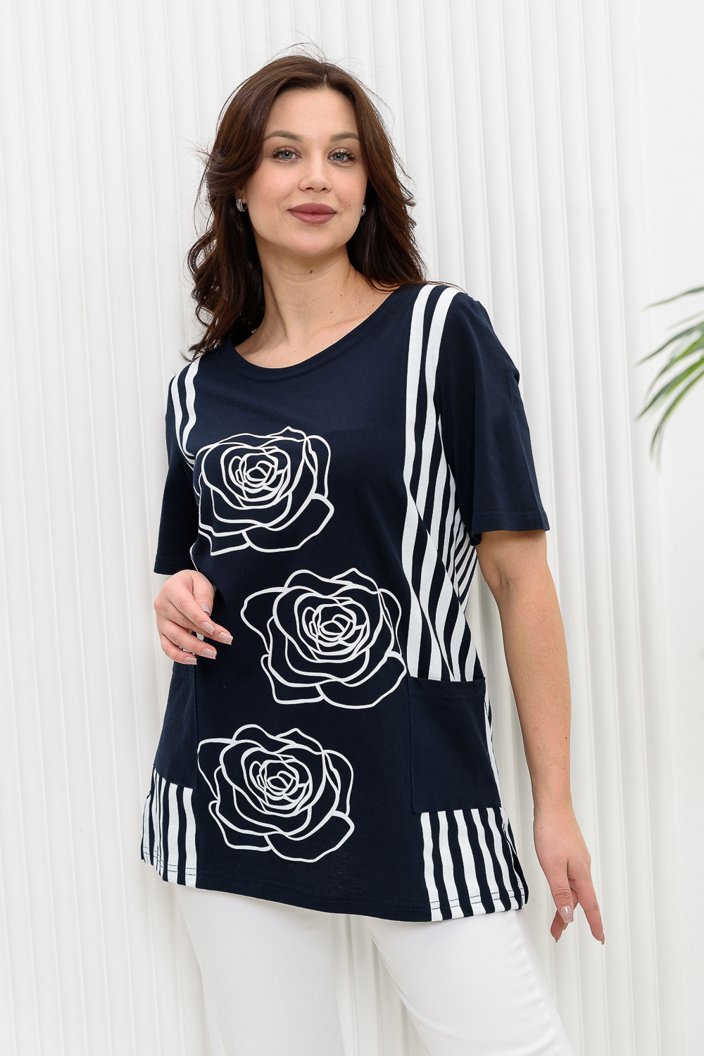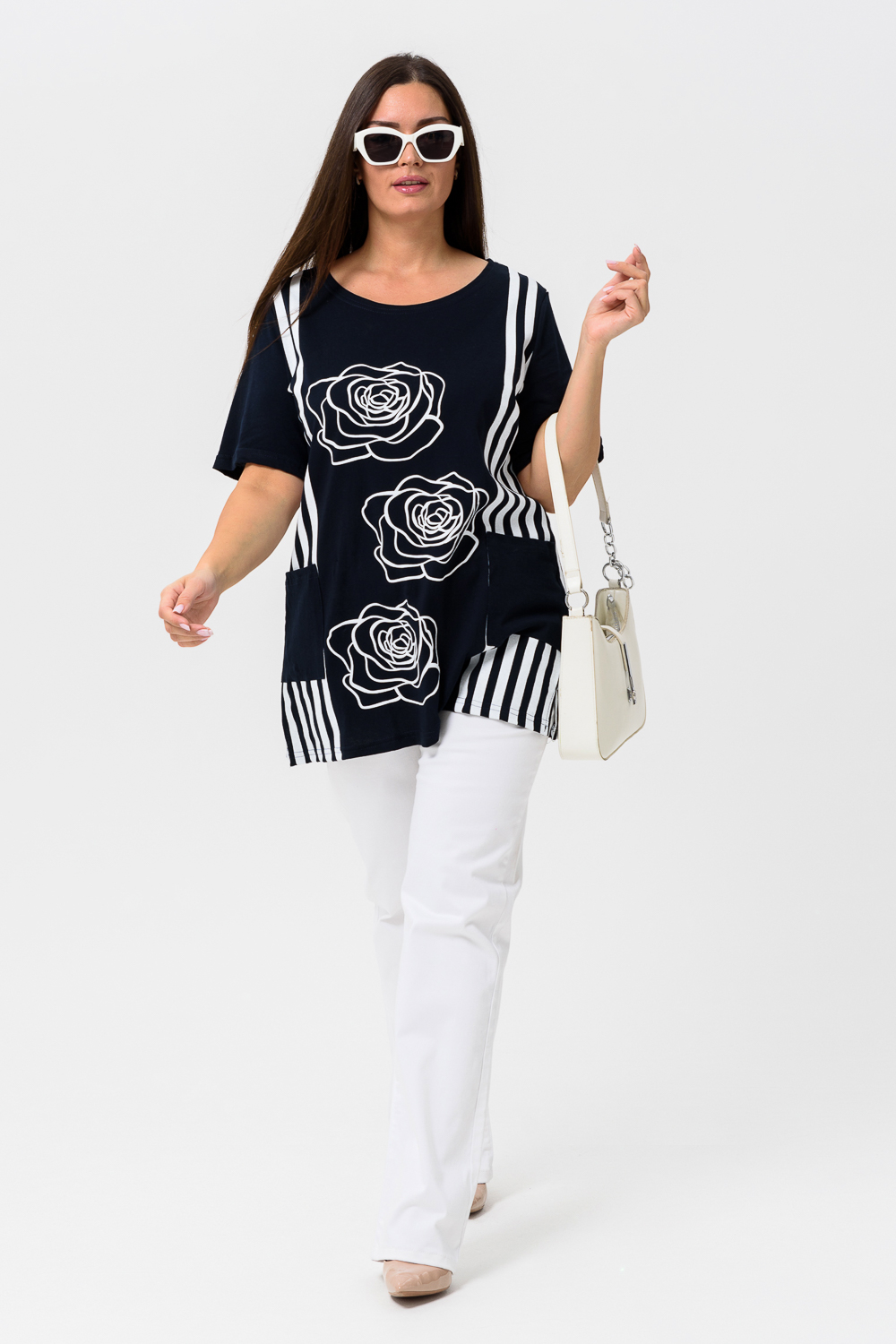 Туника женская полуприлегающего силуэта. Горловина округлая. Рукав цельнокроеный, короткий. На полочке два накладных кармана, в боковых швах разрезы. Принт на полочке и спинке.
