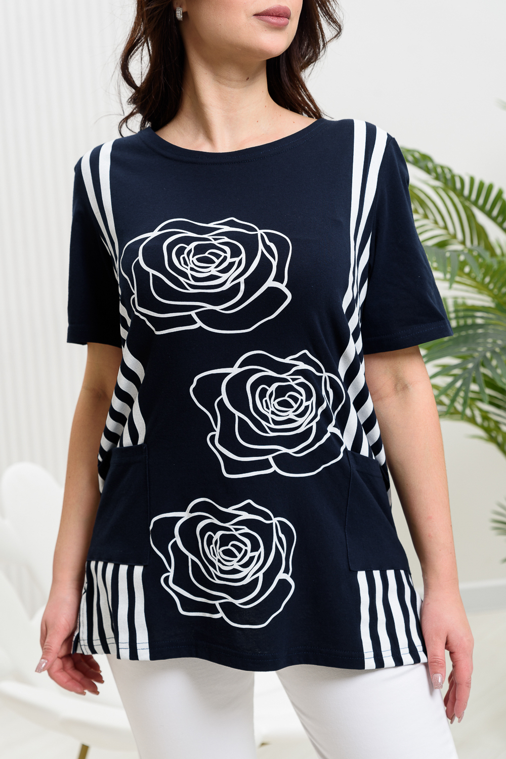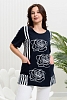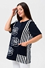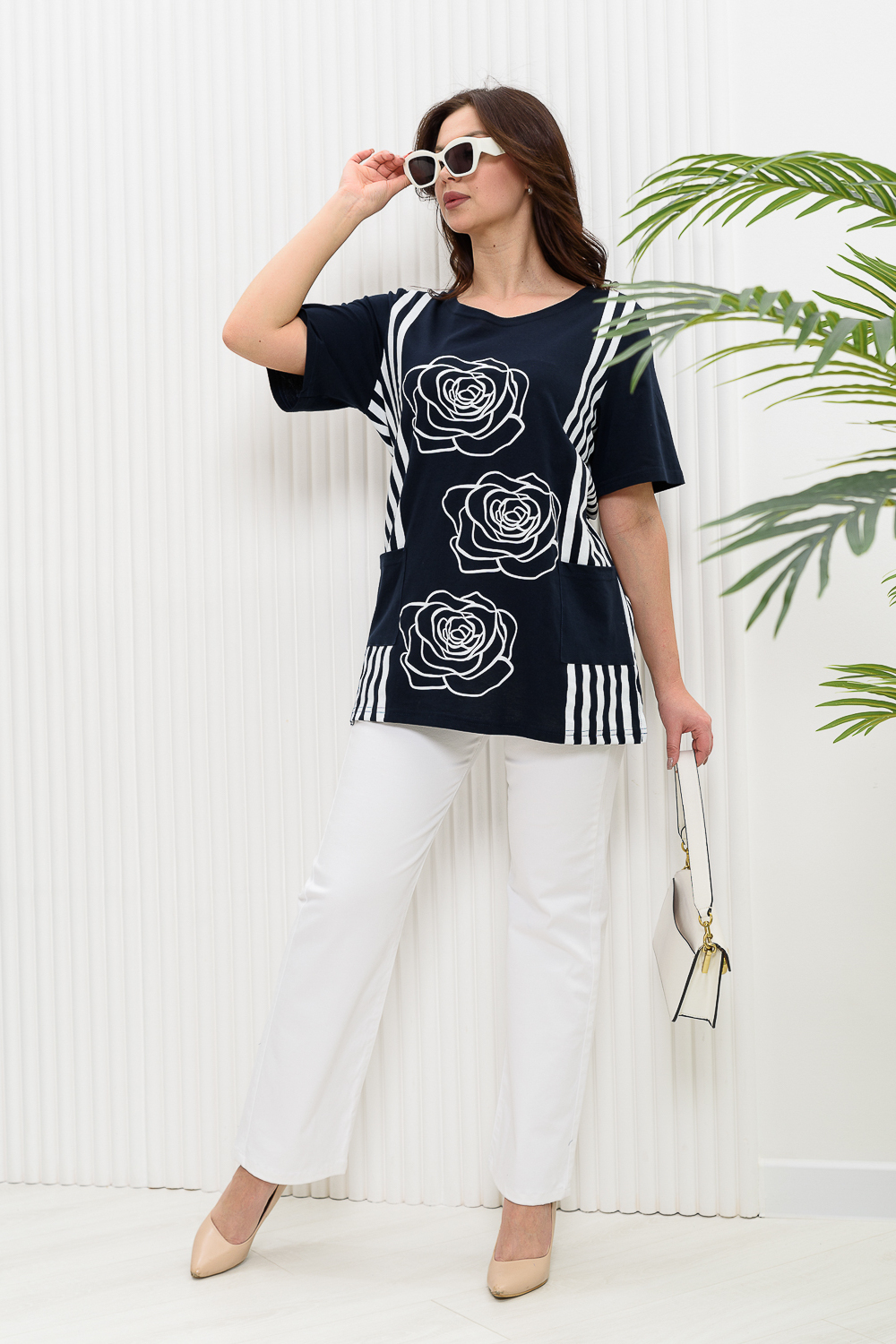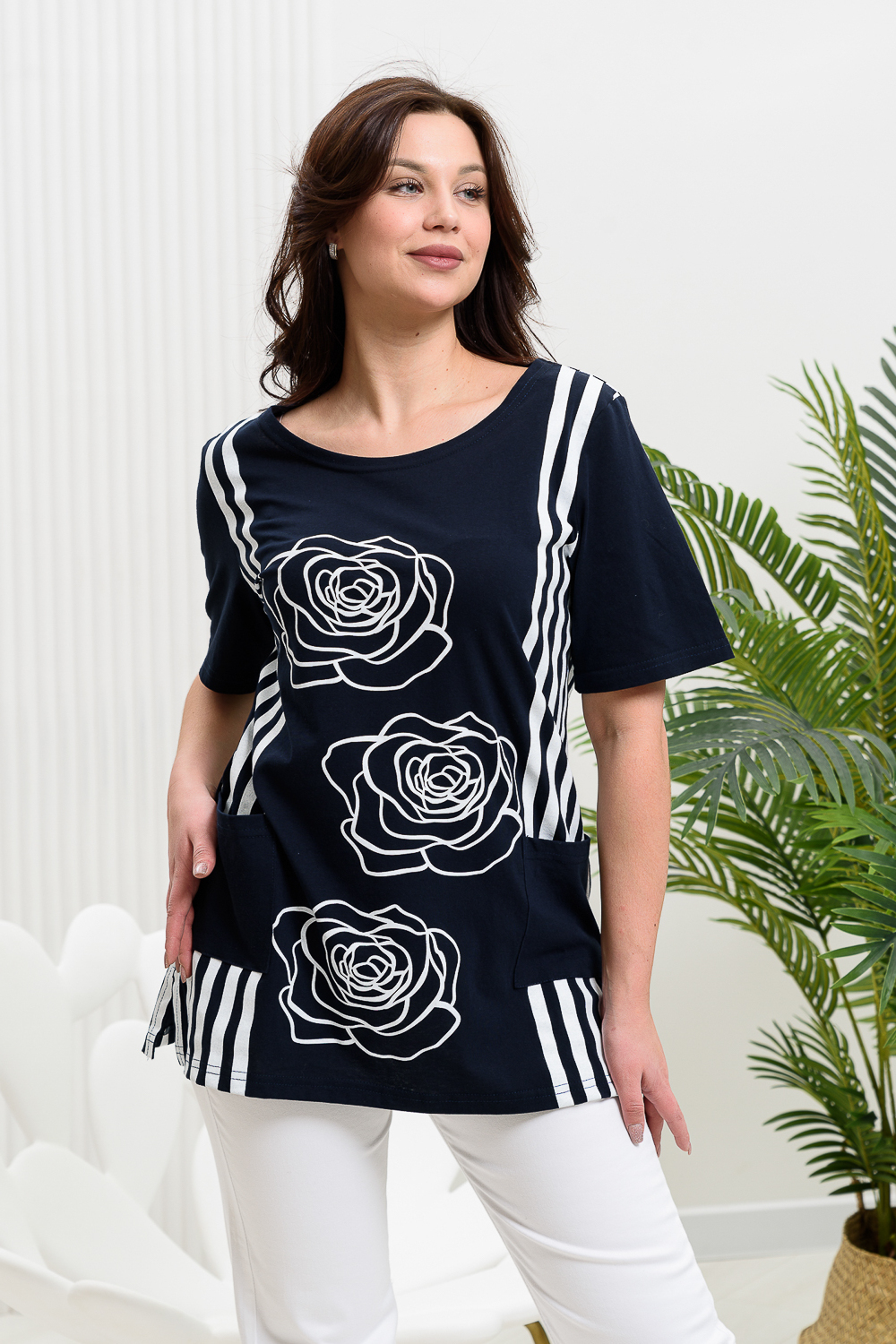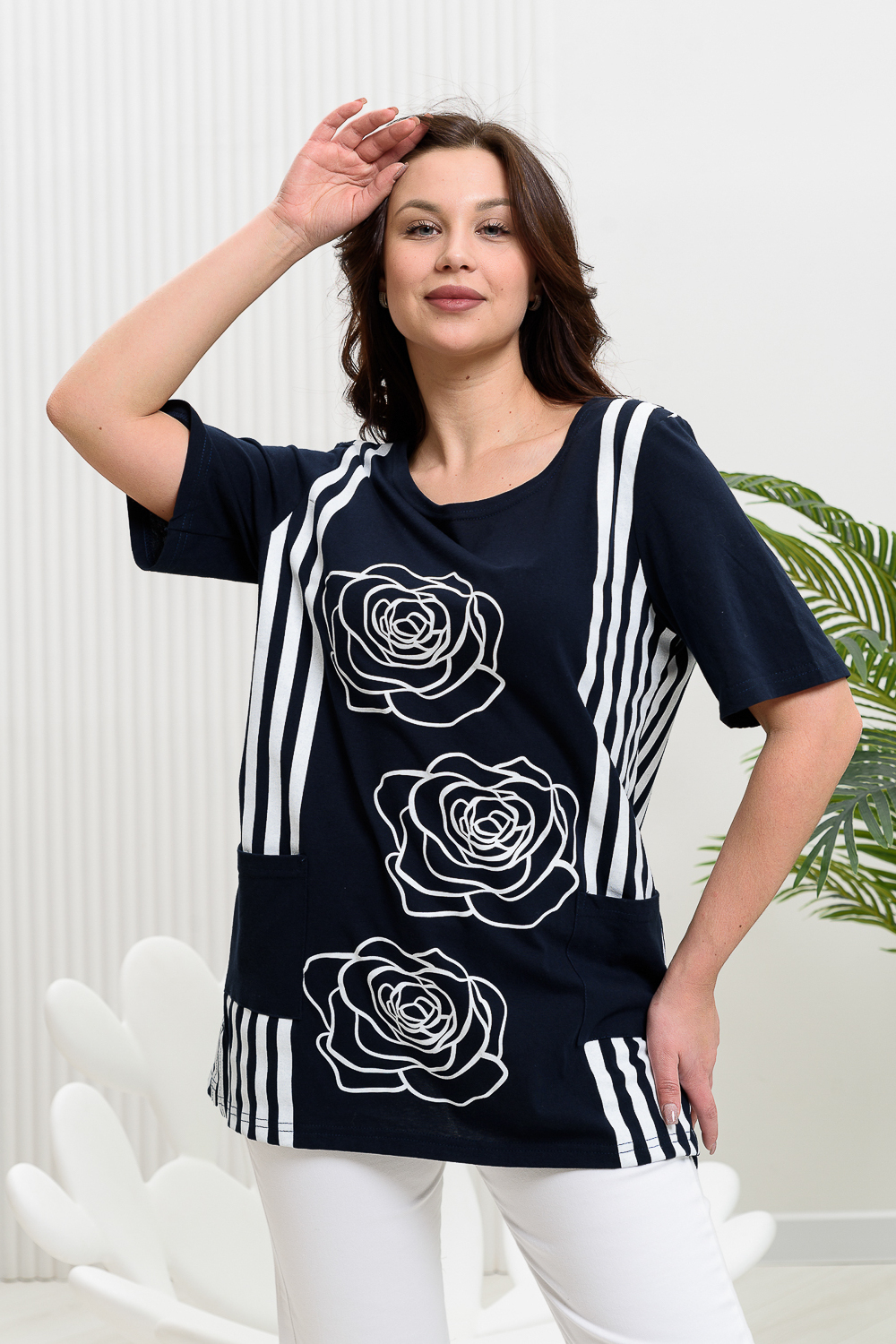 Туника женская полуприлегающего силуэта. Горловина округлая. Рукав цельнокроеный, короткий. На полочке два накладных кармана, в боковых швах разрезы. Принт на полочке и спинке.
