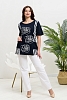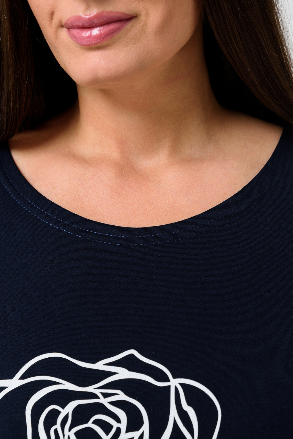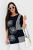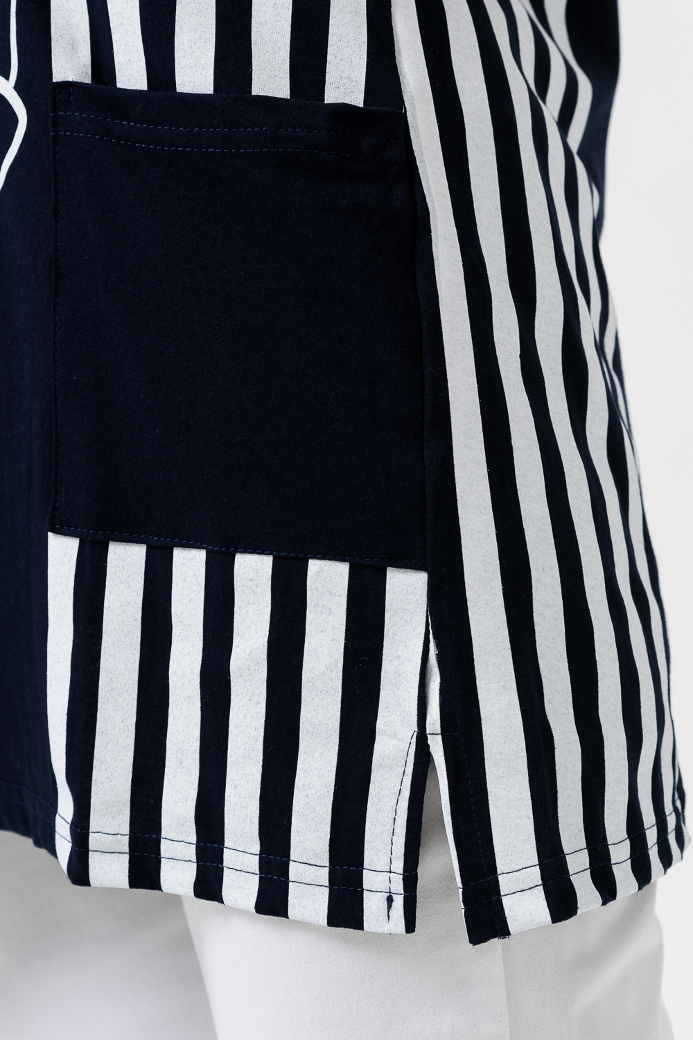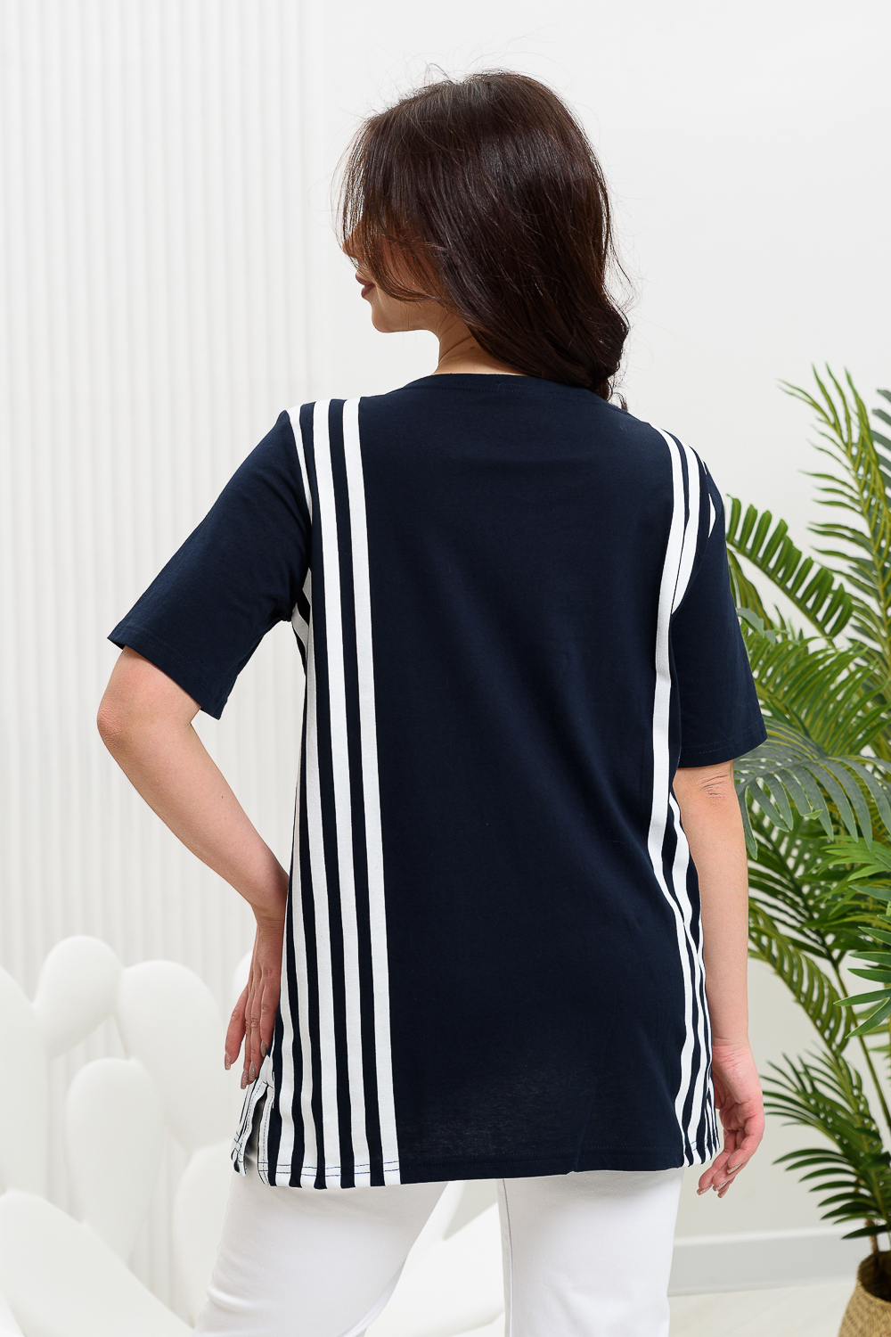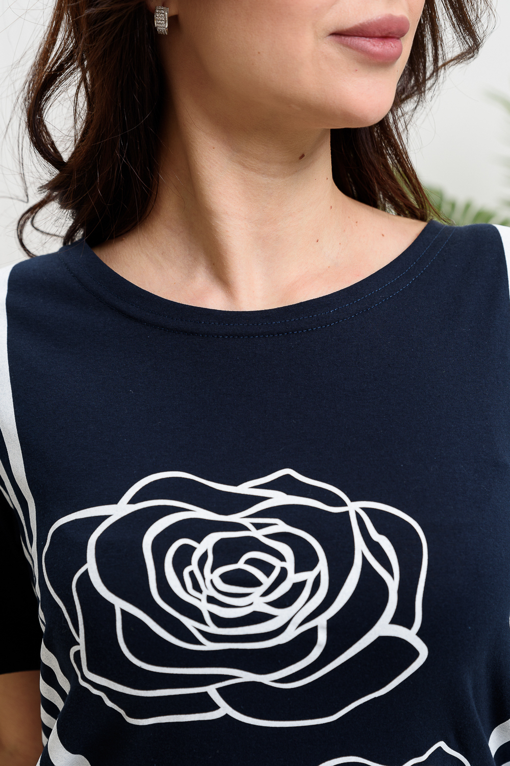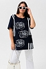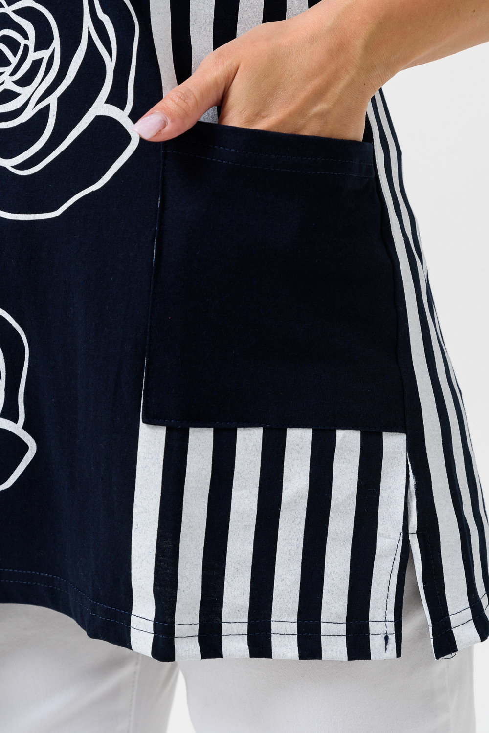 Туника женская полуприлегающего силуэта. Горловина округлая. Рукав цельнокроеный, короткий. На полочке два накладных кармана, в боковых швах разрезы. Принт на полочке и спинке.