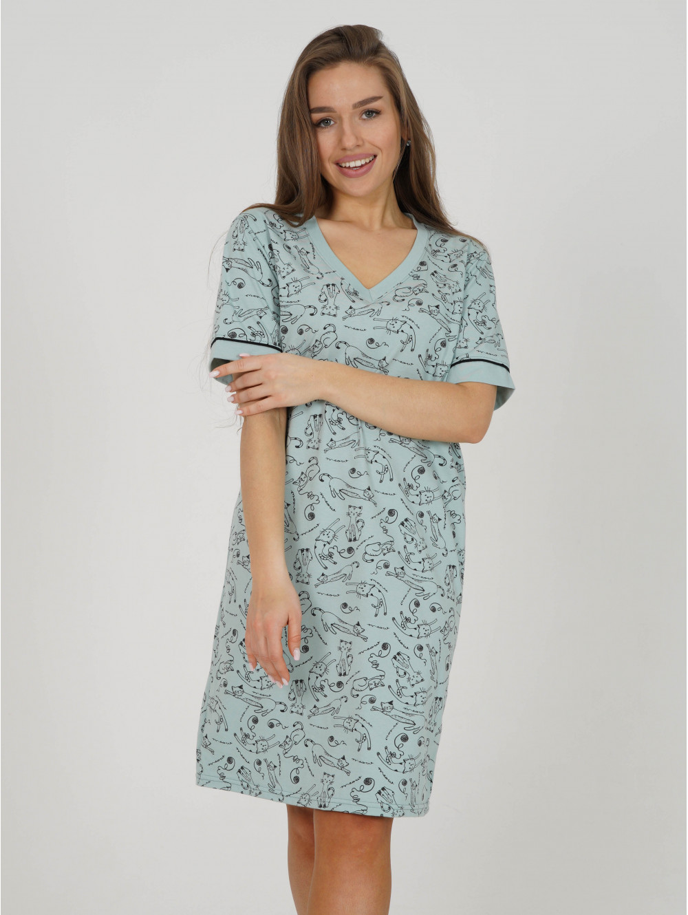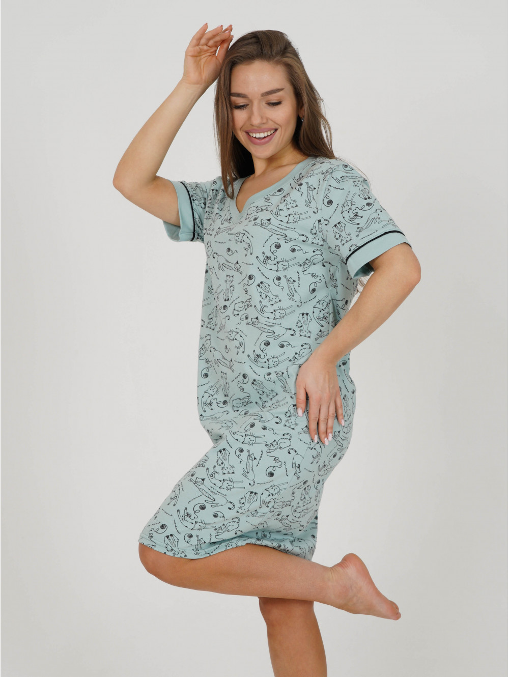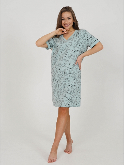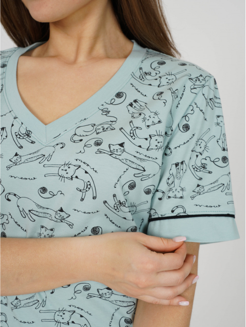 Женская туника Анфиса отличается прямым силуэтом, V-образным вырезом и короткими рукавами с манжетами, декорированными контрастным кантом.