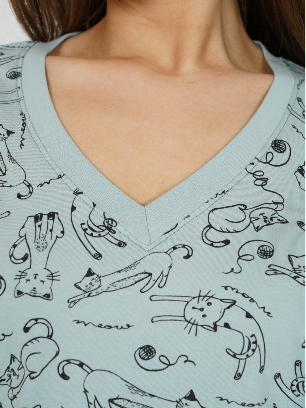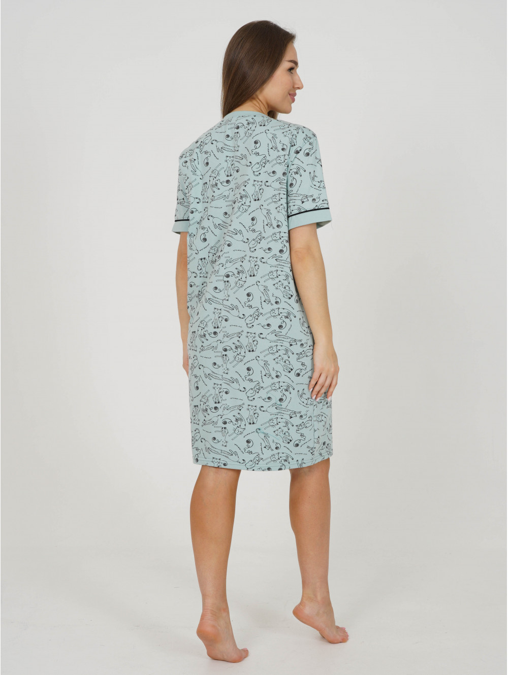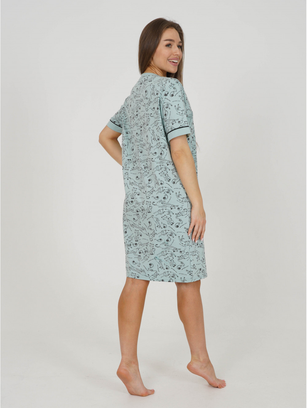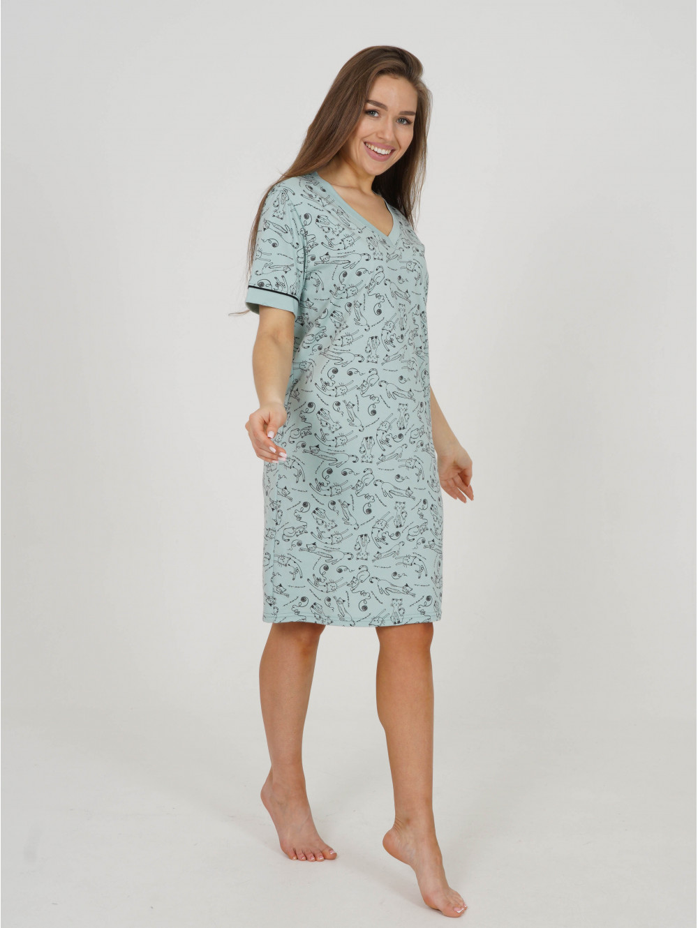 Женская туника Анфиса отличается прямым силуэтом, V-образным вырезом и короткими рукавами с манжетами, декорированными контрастным кантом.