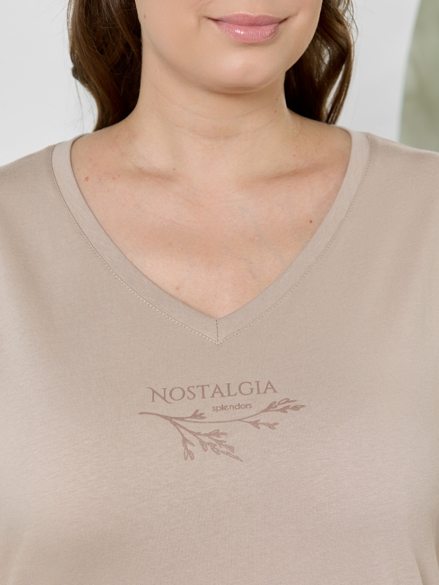 Туника женская из гладкокрашеного трикотажного полотна «кулирка», прямого силуэта, с цельнокроеными рукавами, горловиной V- образной формы, обработанной втачной планкой из основного материала, с разрезами в боковых швах. На полочке выполнена печать в технике "шелкографии".