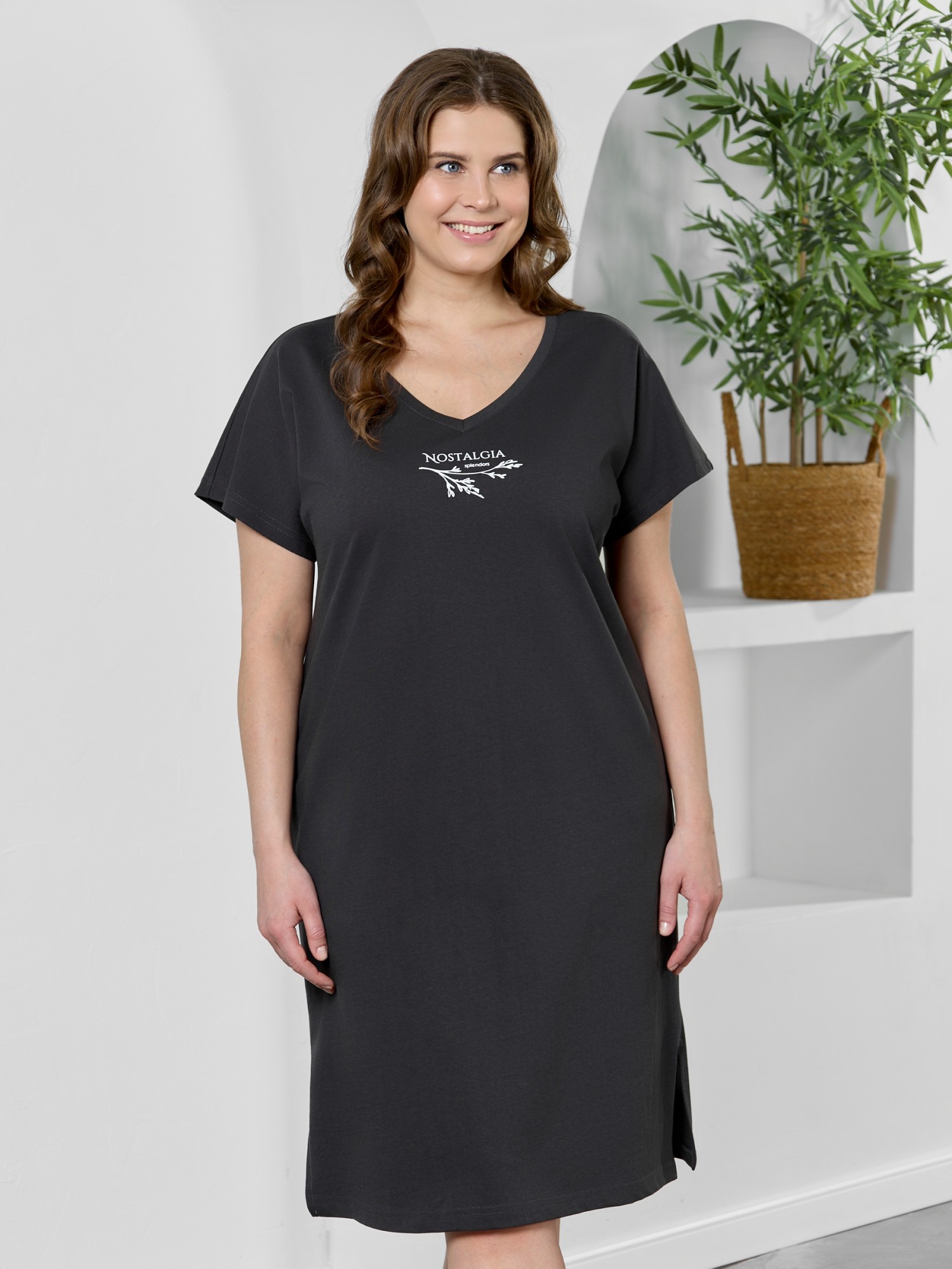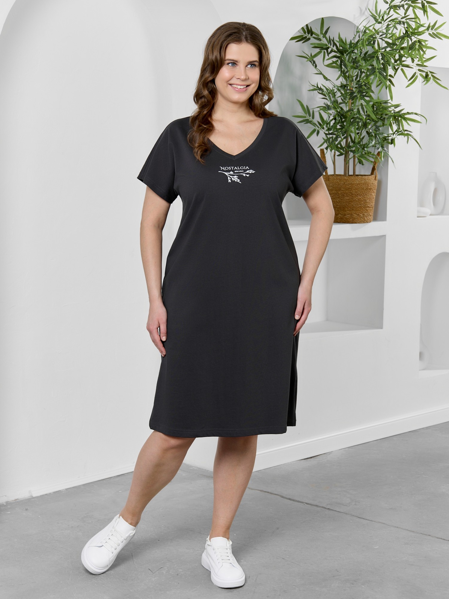 Туника женская из гладкокрашеного трикотажного полотна «кулирка», прямого силуэта, с цельнокроеными рукавами, горловиной V- образной формы, обработанной втачной планкой из основного материала, с разрезами в боковых швах. На полочке выполнена печать в технике "шелкографии".
