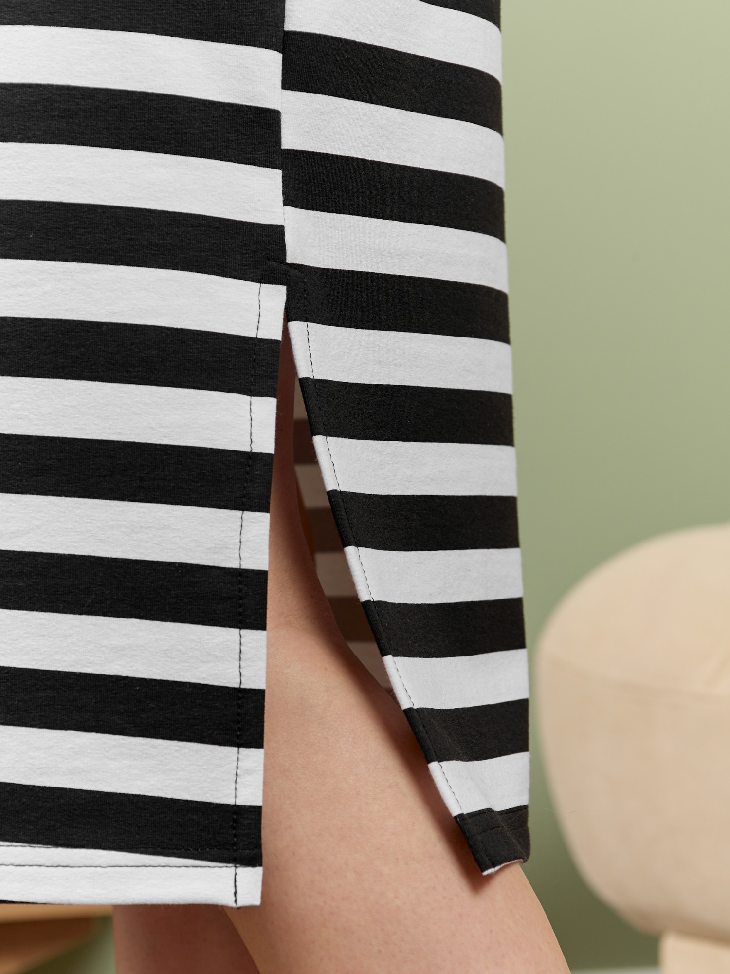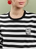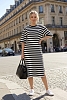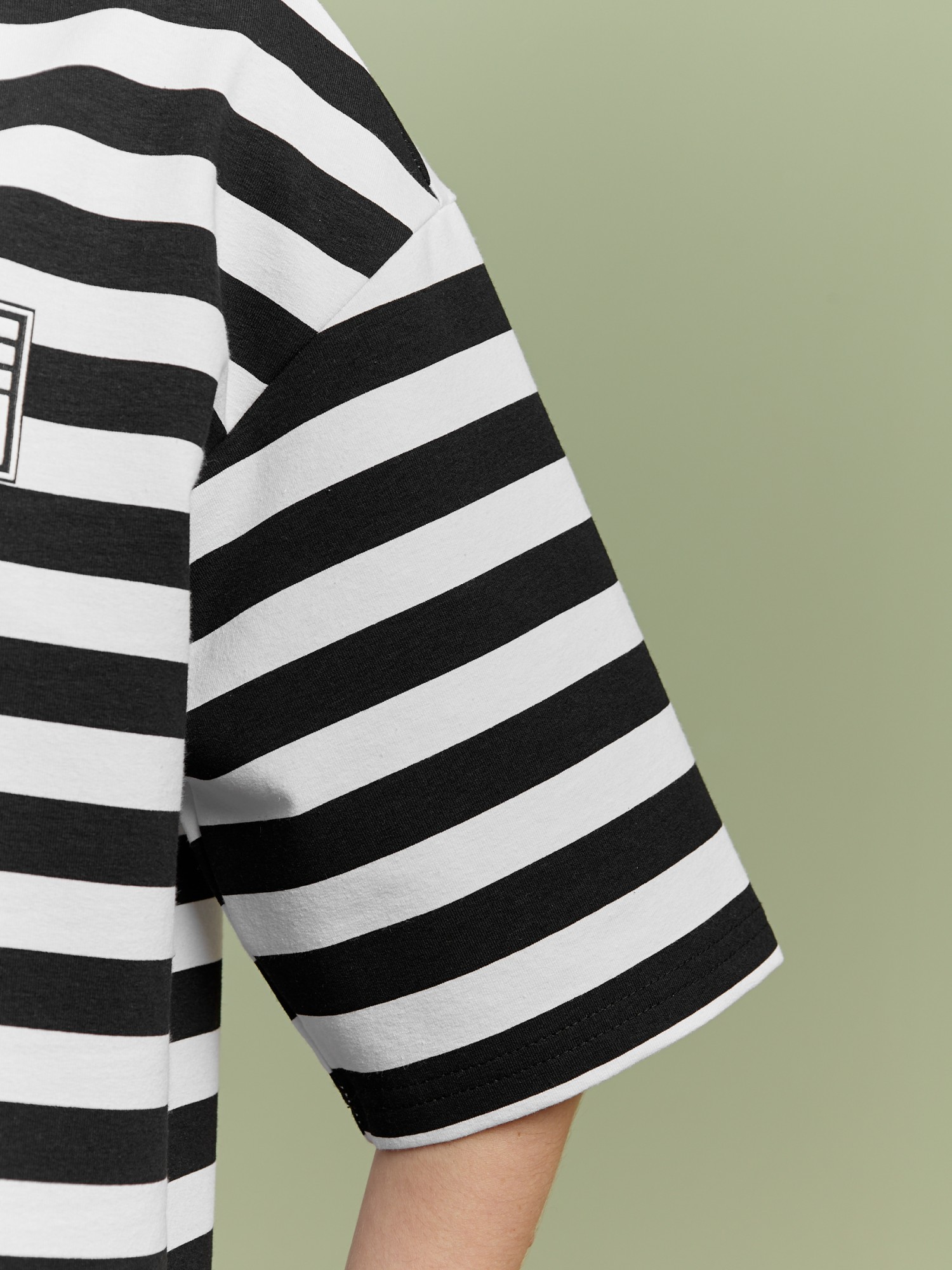 Туника женская из трикотажного полотна «футер двунитка» с набивным рисунком «полоса», свободного покроя, с короткими втачными рукавами, горловиной овальной формы, обработанной втачной планкой и разрезами в боковых швах. На полочке выполнен принт в технике «шелкографии».