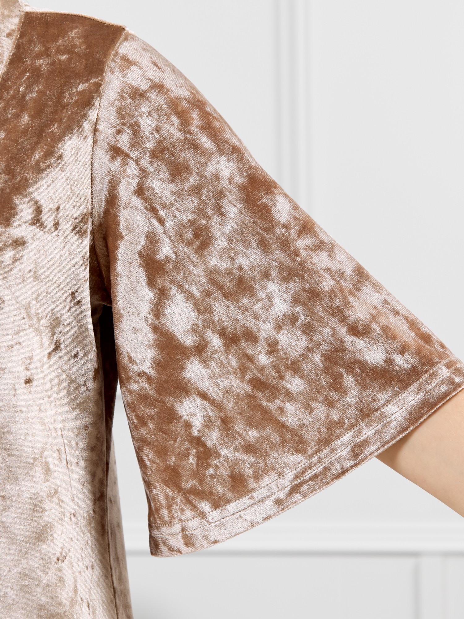 Туника молодежная из гладкокрашенного полотна «велюр стрейч» с мраморным эффектом, прямого силуэта слегка расширенная книзу, с горловиной V-образной формы, обработанной втачной планкой, с рукавами длиной до локтя, расширенные книзу в форме «конуса».