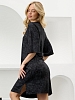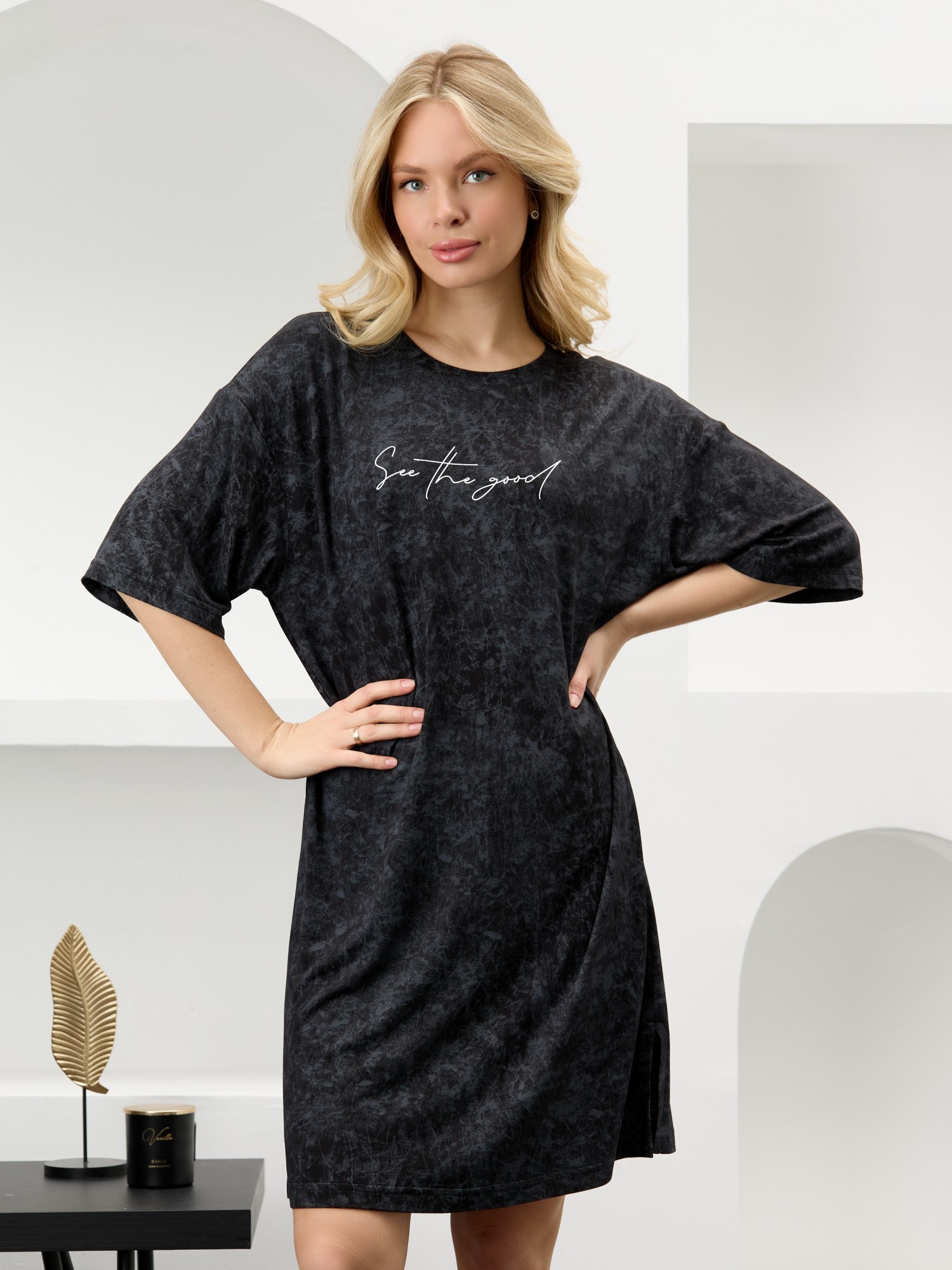 Туника женская из гладкокрашенного вискозного полотна с эффектом «варенка», свободного покроя, с втачными рукавами длиной до локтя, горловиной овальной формы, обработанной втачной планкой и разрезами в боковых швах. На полочке принт, выполненный в технике «шелкографии».