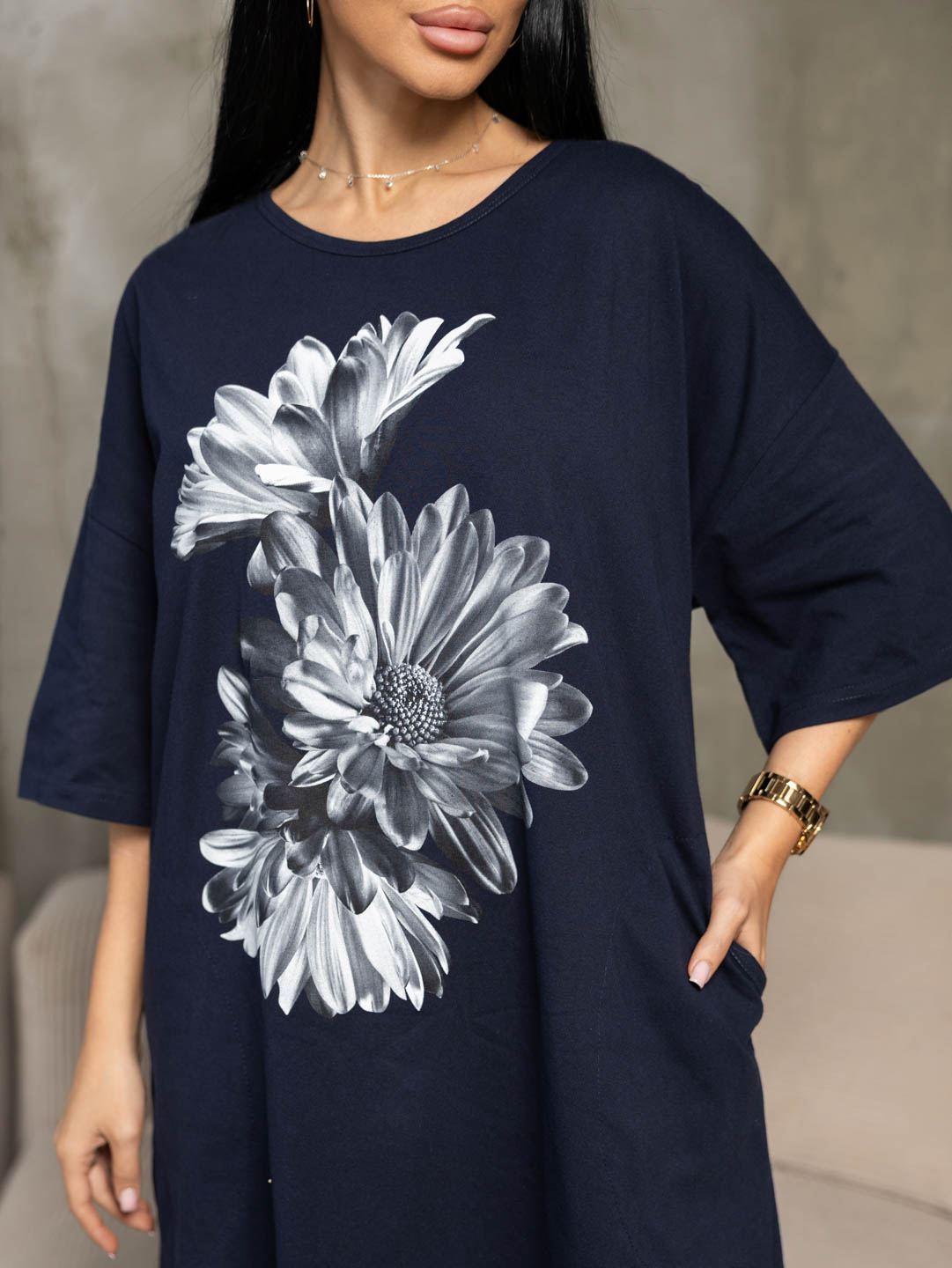 Туника женская трикотажная со спущенным коротким рукавом и округлым вырезом горловины. Уникальность данной модели заключается в расхождении длин передней и задней части изделия, что придает тунике современный дизайн и создает ощущение неповторимого чувства стиля у ее владельца. Боковой шов имеет удобные карманы и вырез в нижней части платья. На полочке печатный рисунок.