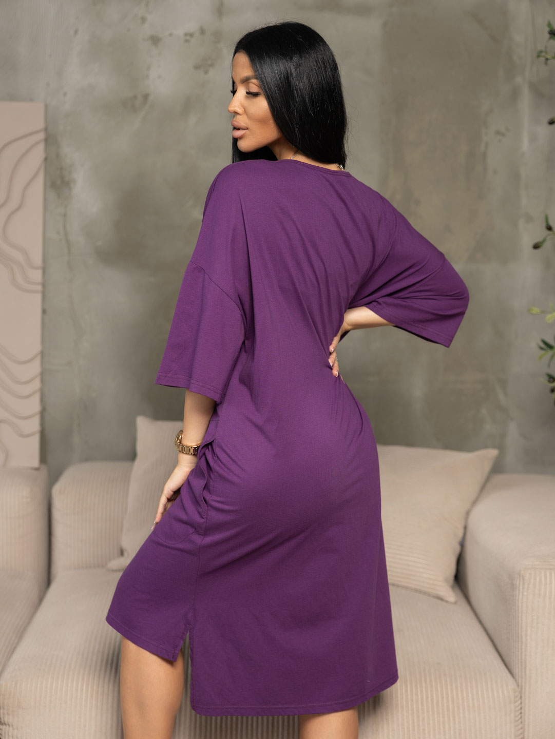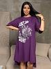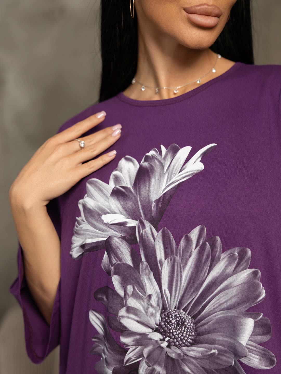 Туника женская трикотажная со спущенным коротким рукавом и округлым вырезом горловины. Уникальность данной модели заключается в расхождении длин передней и задней части изделия, что придает тунике современный дизайн и создает ощущение неповторимого чувства стиля у ее владельца. Боковой шов имеет удобные карманы и вырез в нижней части платья. На полочке печатный рисунок.