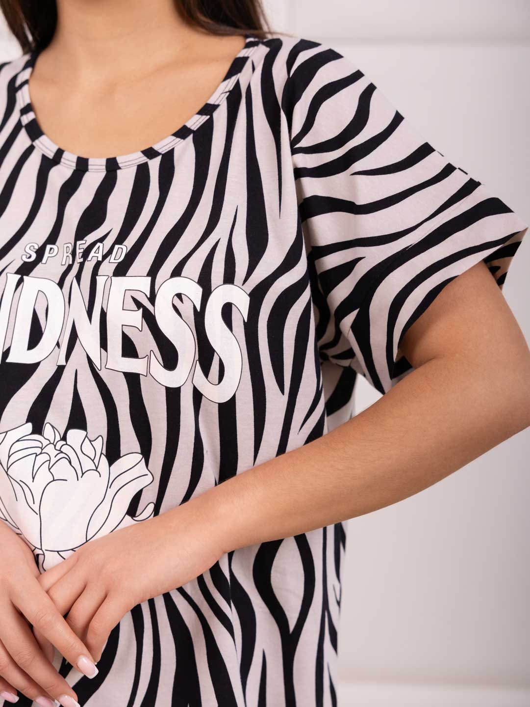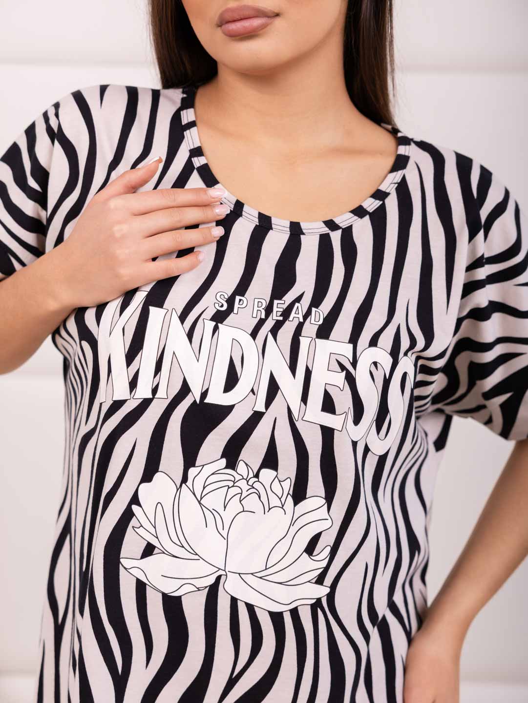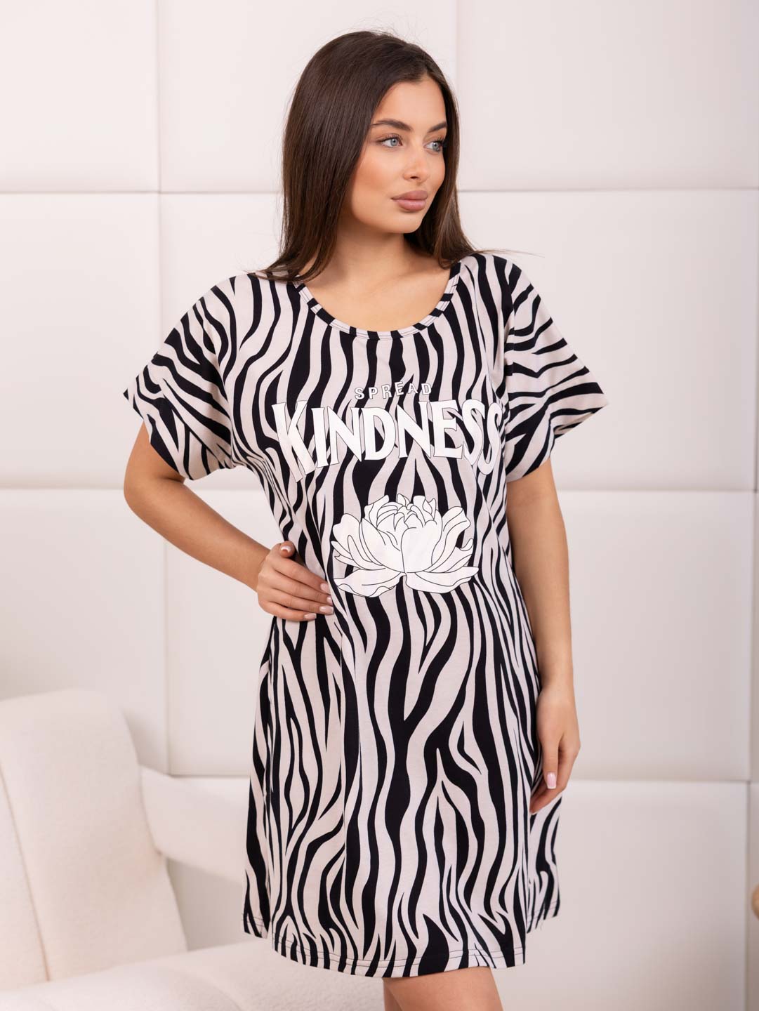 Женская туника из хлопка c универсальным принтом. Туника длиной чуть выше колена, с О-образной горловиной, цельнокроеным рукавом и манжетой, по боковым швам небольшие разрезы.