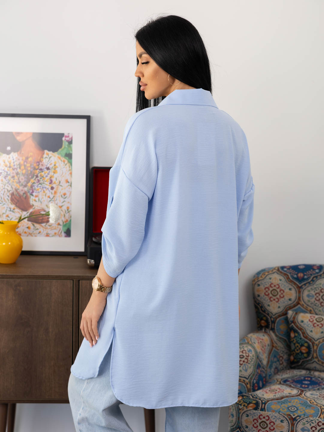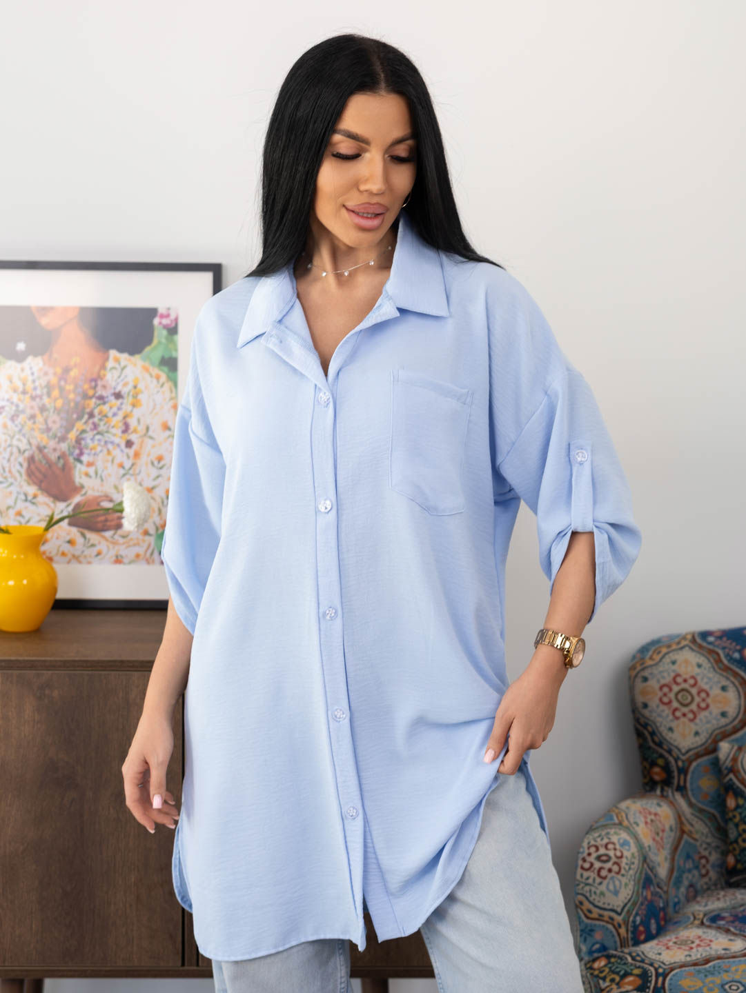 Женская туника из легкого, воздушного полотна с мятым эффектом. Рубашка с отложным воротником, рукавом 3/4 с патой, разрезами по боковым швам, накладным нагрудным карманом и застежкой на пуговицы. Рост модели 165см.