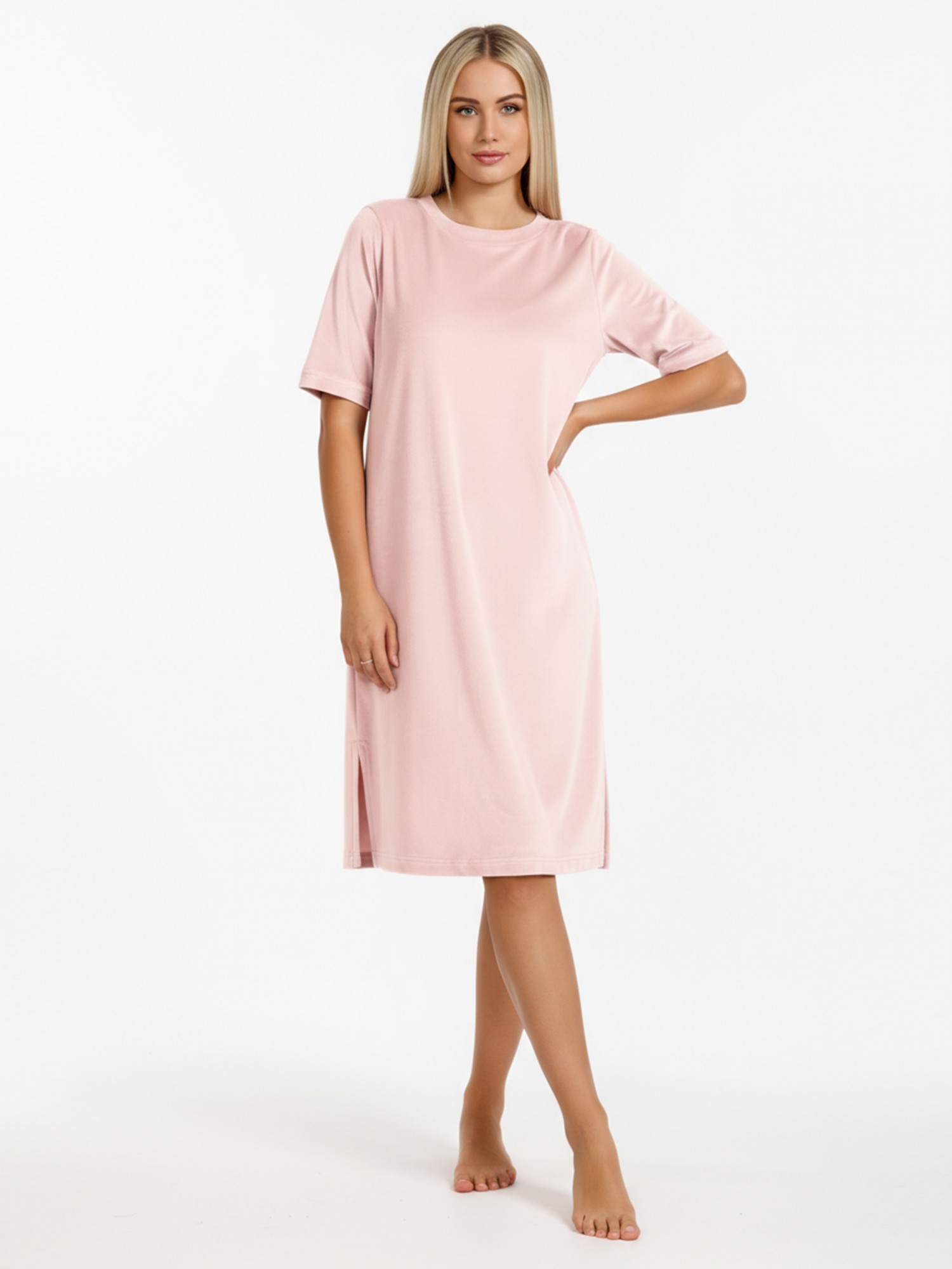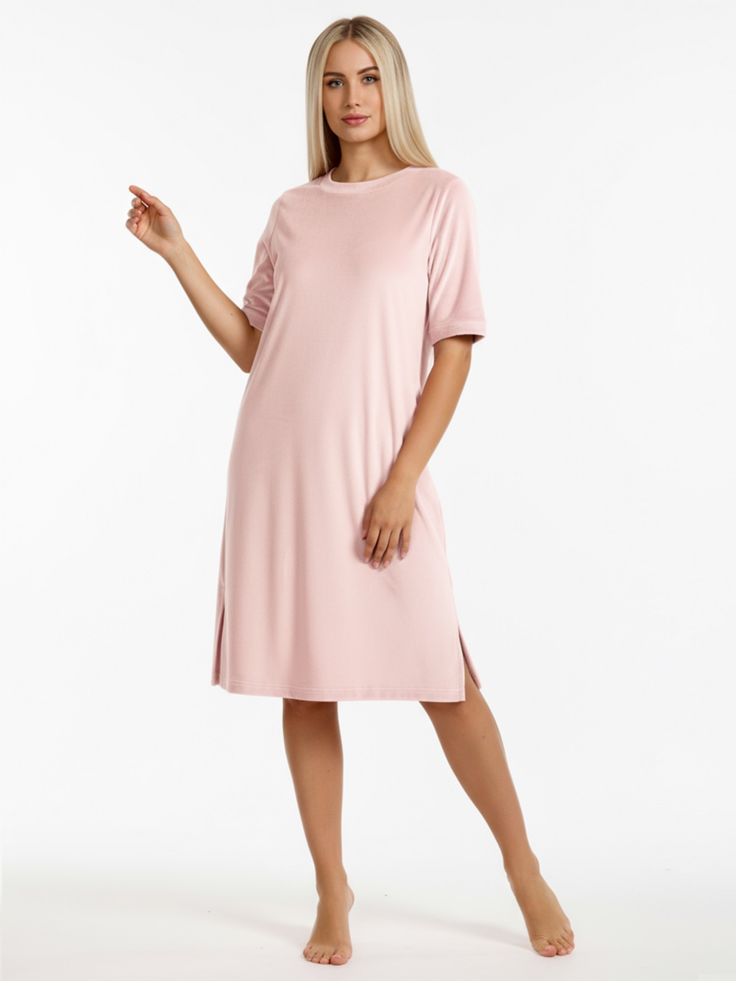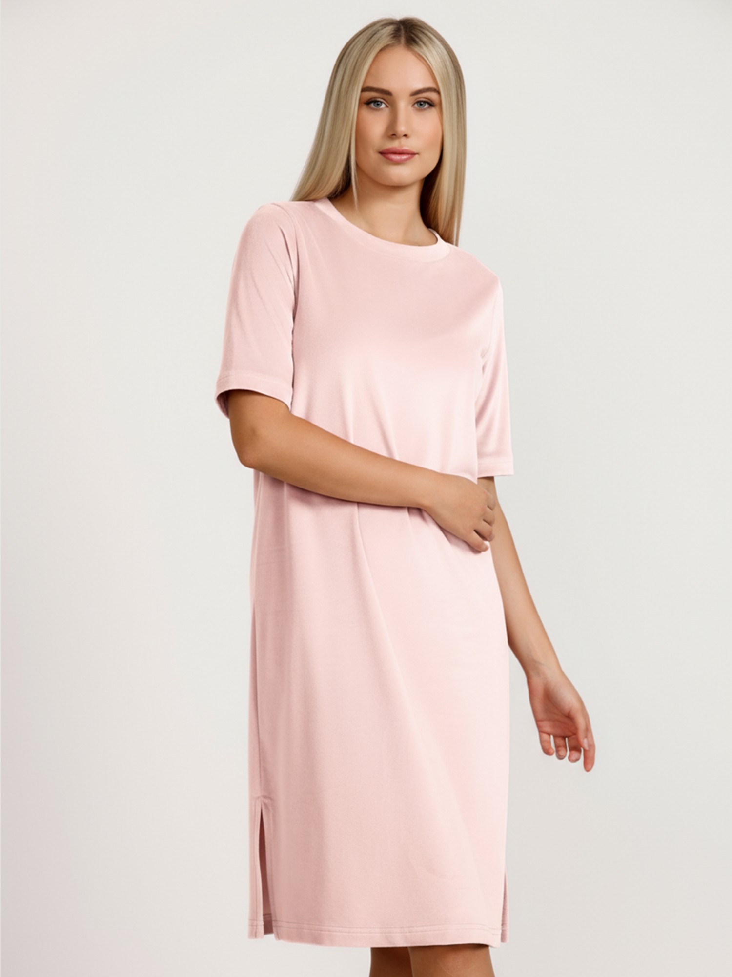 Туника женская из гладкокрашенного полотна «велюр стрейч», свободного покроя, с короткими втачными рукавами, горловиной овальной формы, обработанной втачной планкой и разрезами в боковых швах.