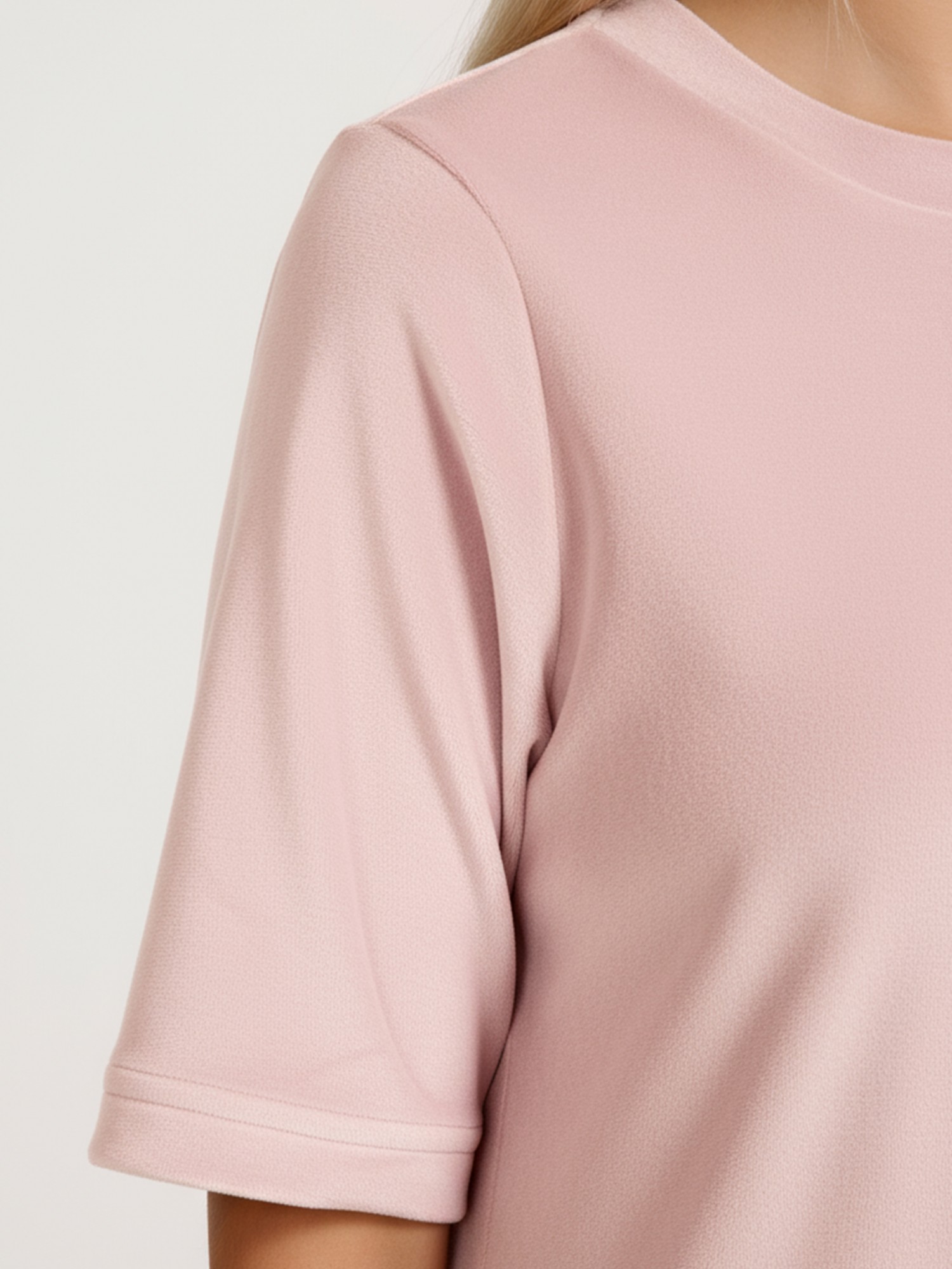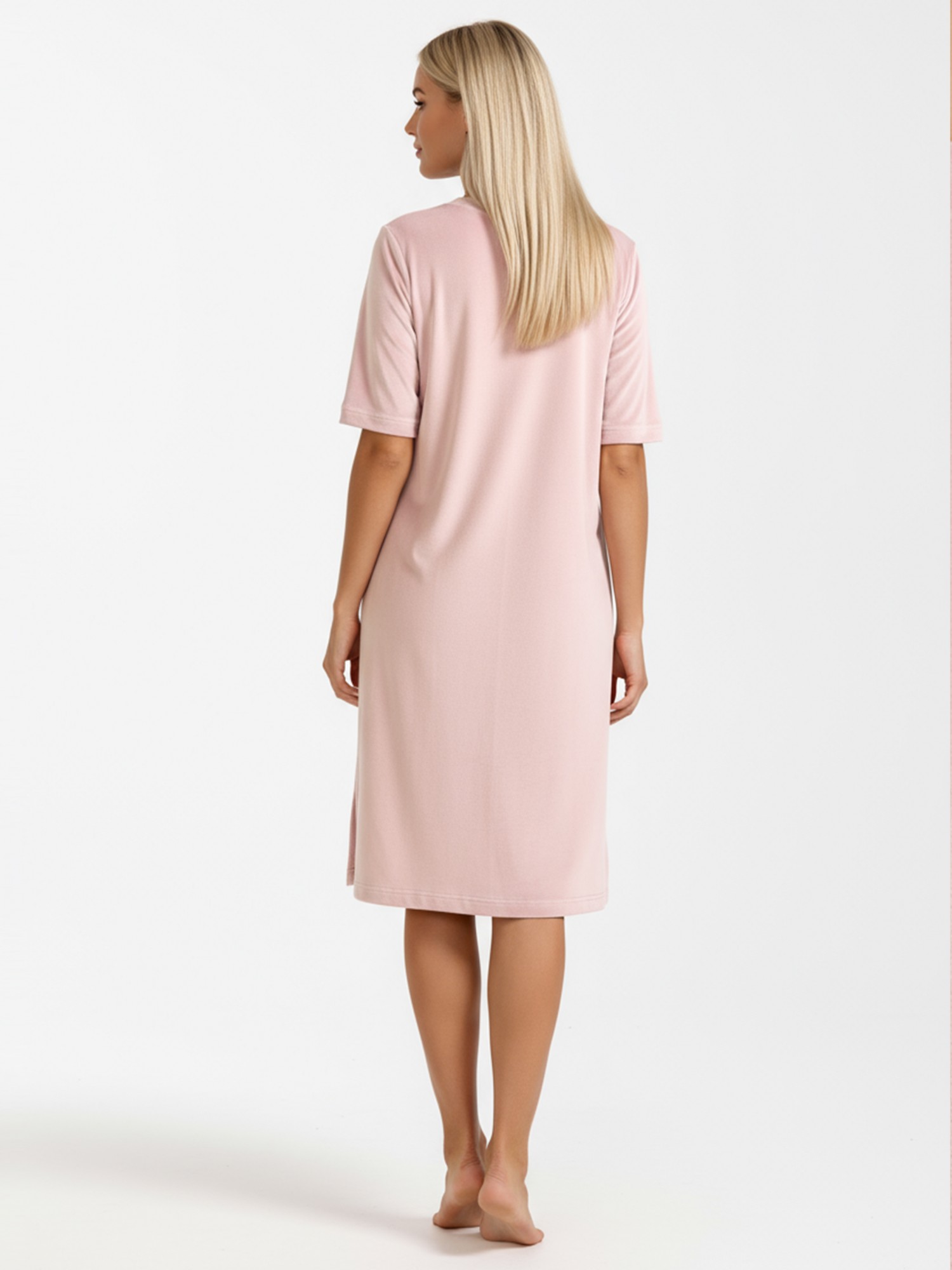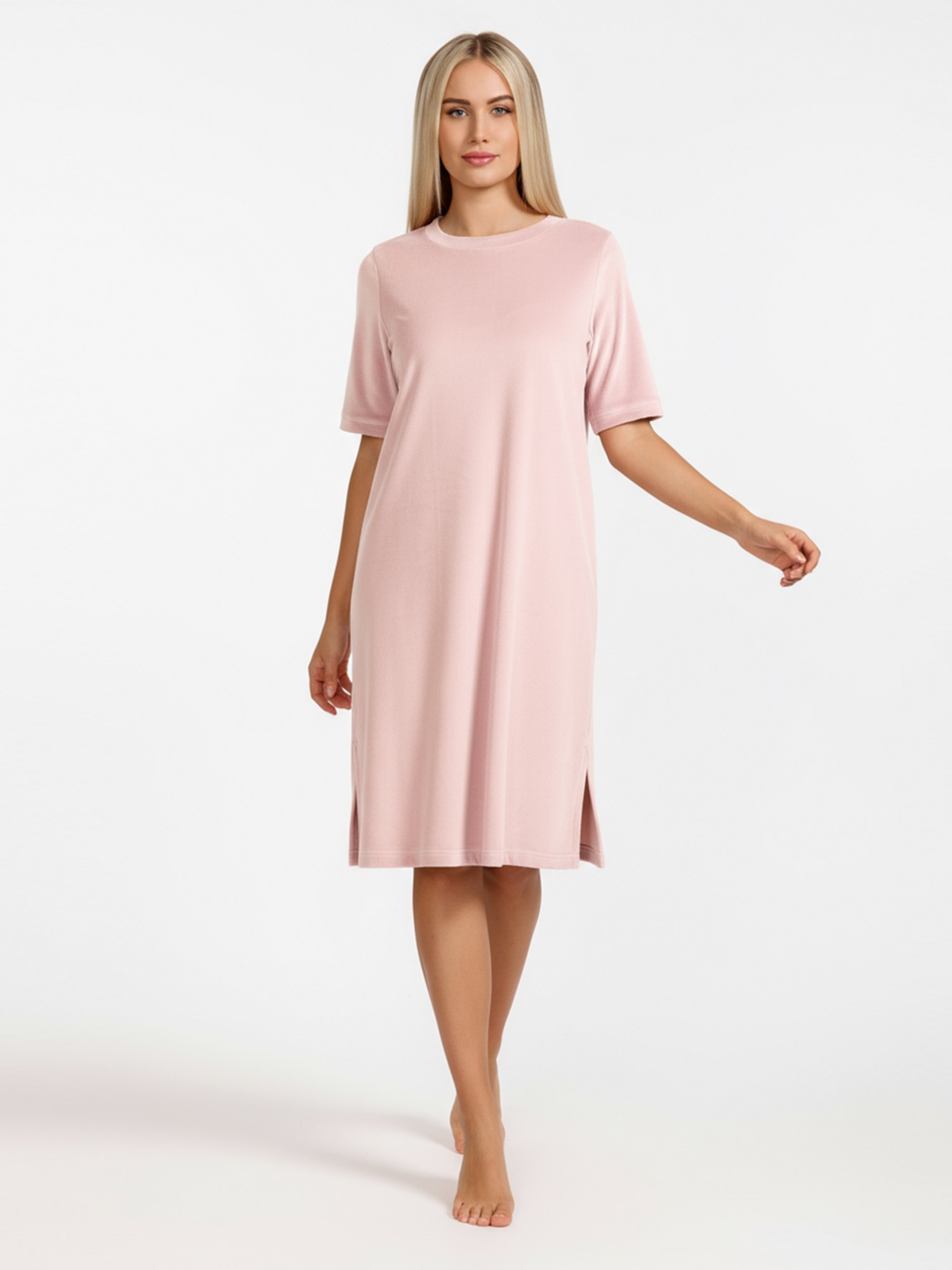 Туника женская из гладкокрашенного полотна «велюр стрейч», свободного покроя, с короткими втачными рукавами, горловиной овальной формы, обработанной втачной планкой и разрезами в боковых швах.