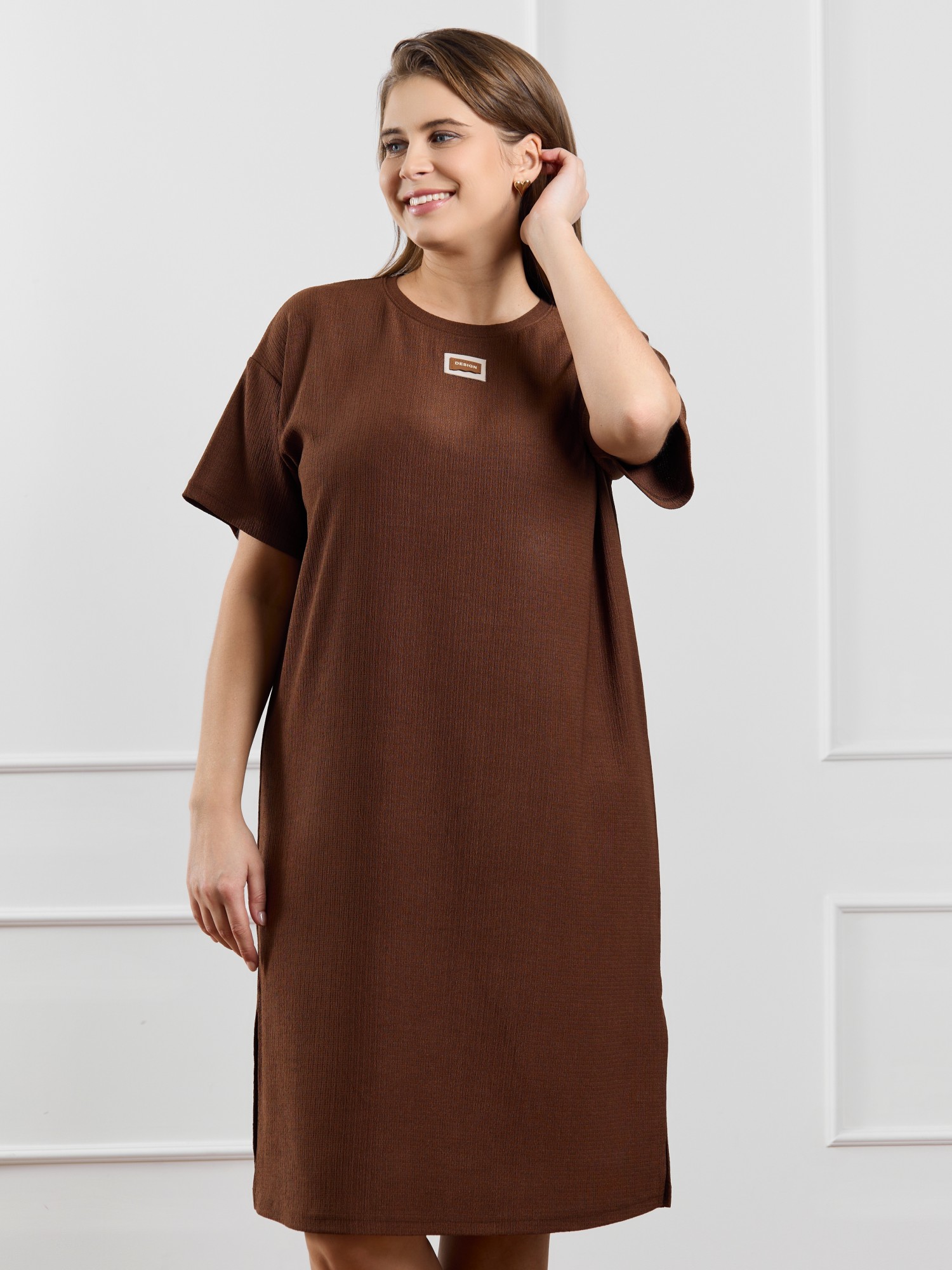 Туника женская из гладкокрашенного трикотажного полотна «бурумчук», прямого силуэта, с короткими втачными рукавами, горловиной овальной формы, обработанной втачной планкой, с разрезами в боковых швах. По центру полочки ниже горловины - настрочен декоративный элемент-нашивка.