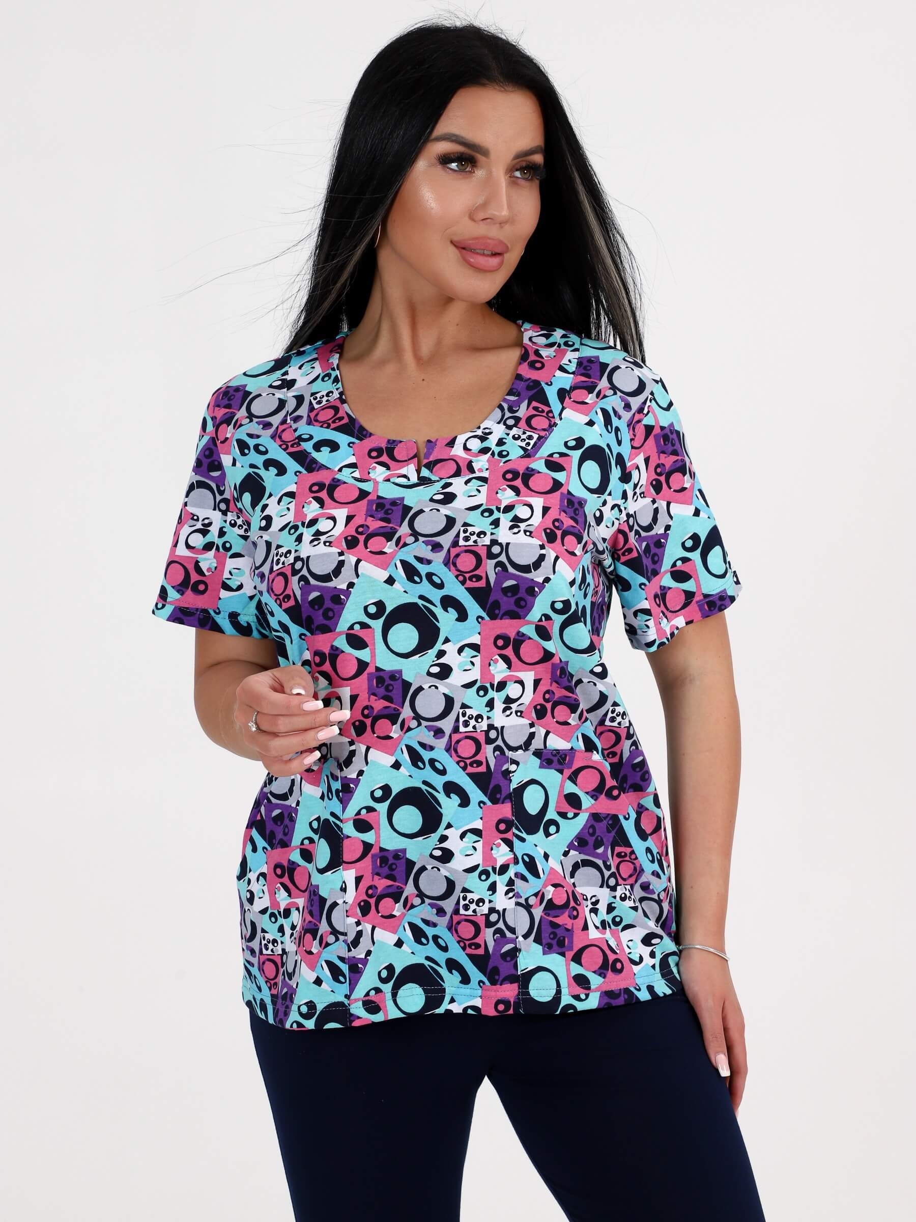 Туника / футболка трикотажная ТК-562-ФУТ / Кругозор бирюзовый с двойной кокеткой с фигурным вырезом (даже при многократных стирках не будет вытягиваться). Для удобства и практичности мы предусмотрели 2 кармана, которые позволяют положить не только мелочь, ключи, но и так всегда необходимый мобильный телефон. Трикотажная туника / футболка сшита из кулирки, это натуральная, хлопковая ткань, которая позволяет телу дышать. Футболка больших размеров абсолютно комфортна в носке, мягкая и приятная к телу. Футболка трикотажная больших размеров для женщин отлично подойдет для отдыха, дома, дачи, прогулки и т.п.