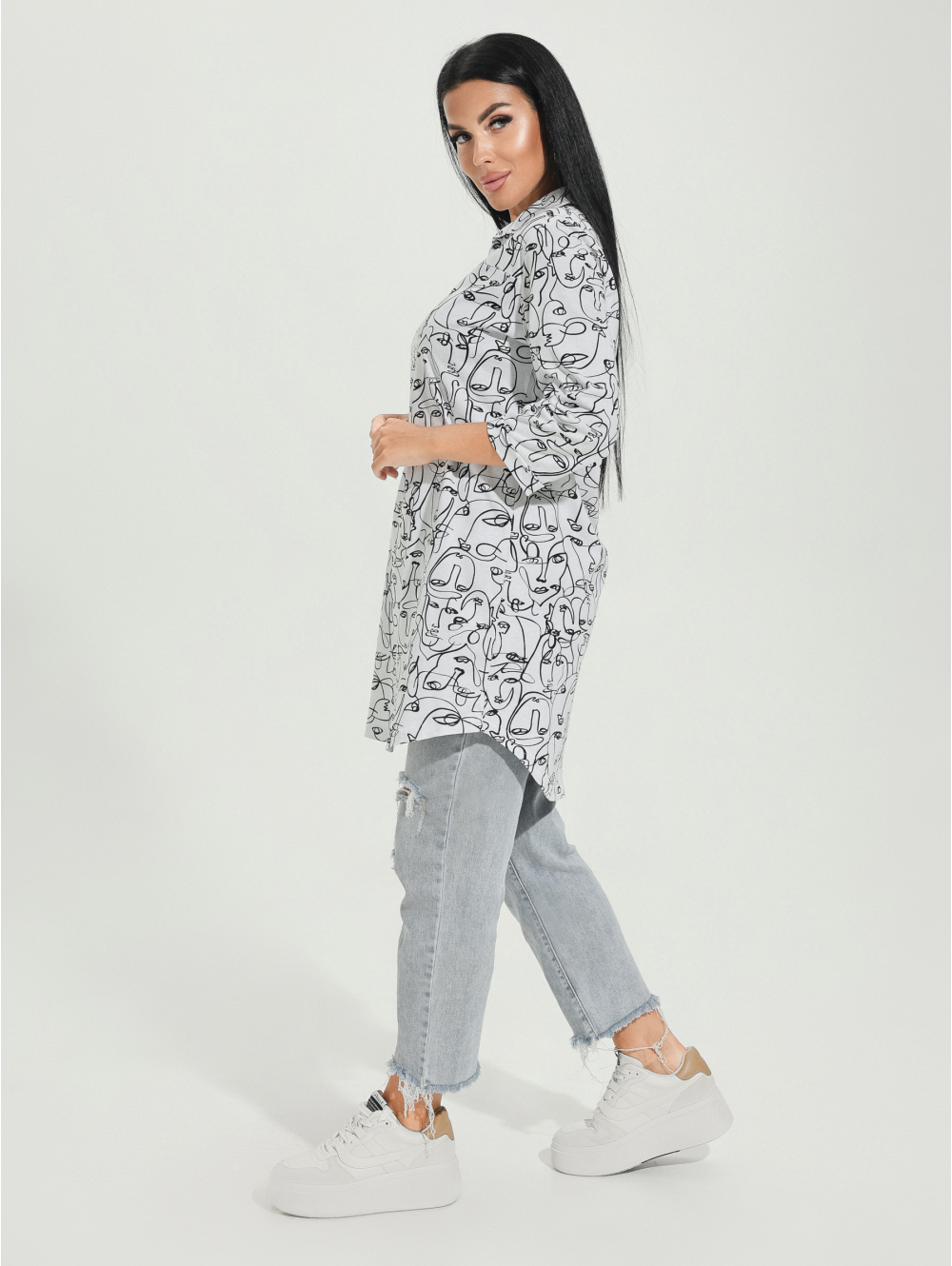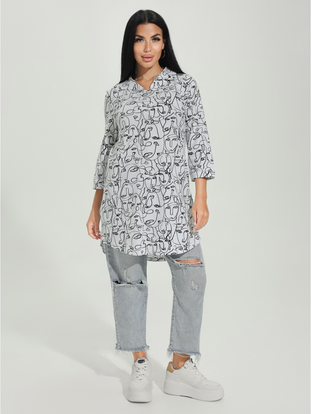 Туники из кулирки свободно облегают фигуру, позволяют коже дышать, не прилипают к телу и не требуют особого ухода. Поэтому, среди одежды должно быть что-то лёгкое, свободное, натуральное. Представляем Вам нашу тунику ТЭФФИ, выполненную из хлопковой ткани кулирка .Туника с отложным воротником. На полочке кокетка с разрезом. Рукав три четверти с манжетой, оформление низа изделия фигурное. Оригинальный рисунок на ткани выделит Вас из толпы. Вы всегда будете в центре внимания. Легкая и комфортная, она станет любимой вещью Вашего гардероба.