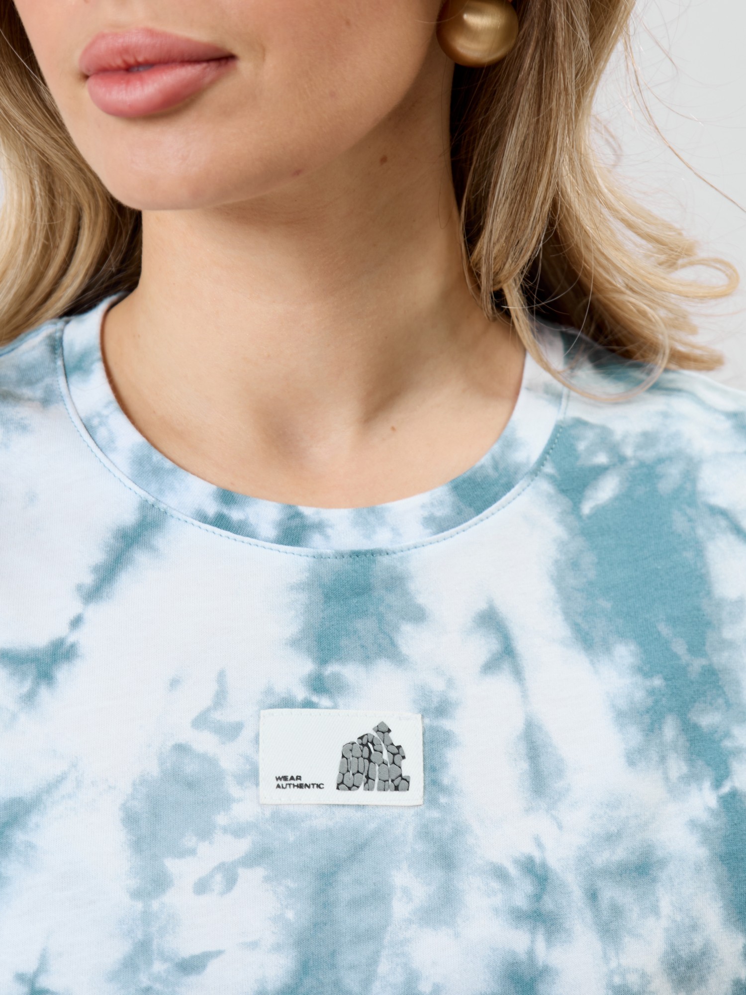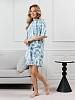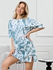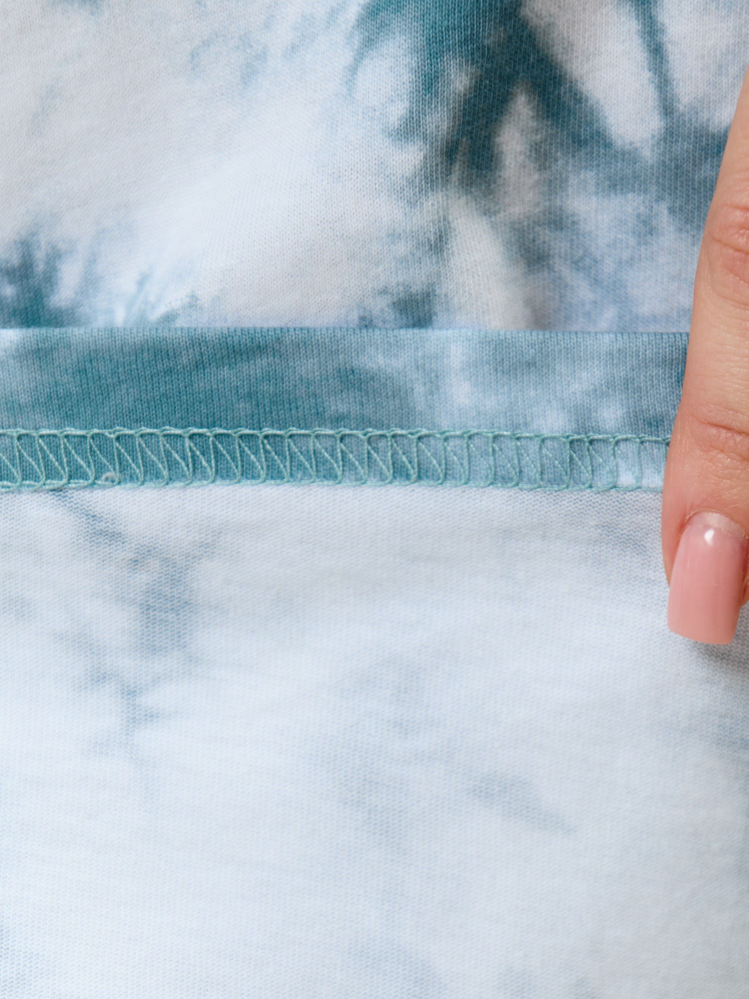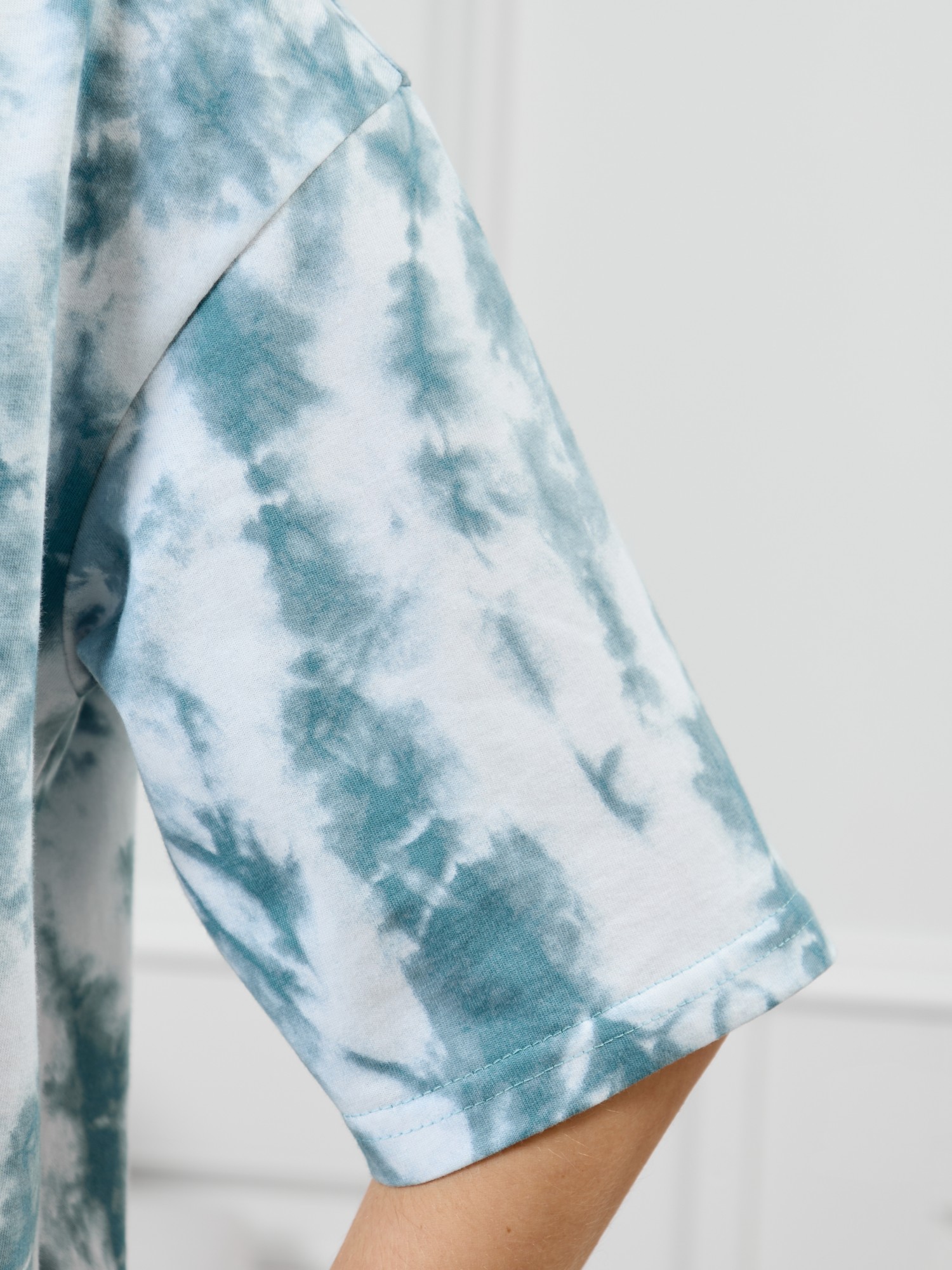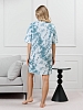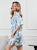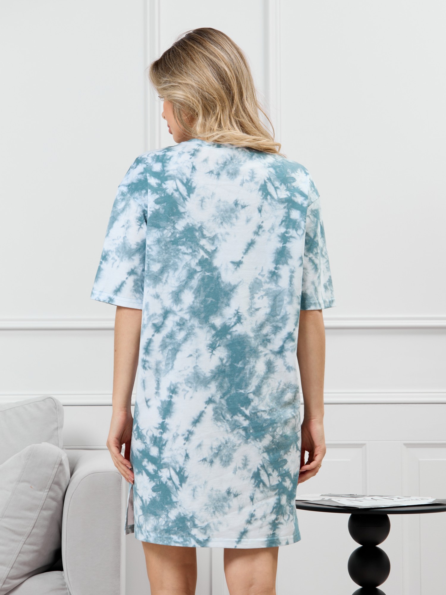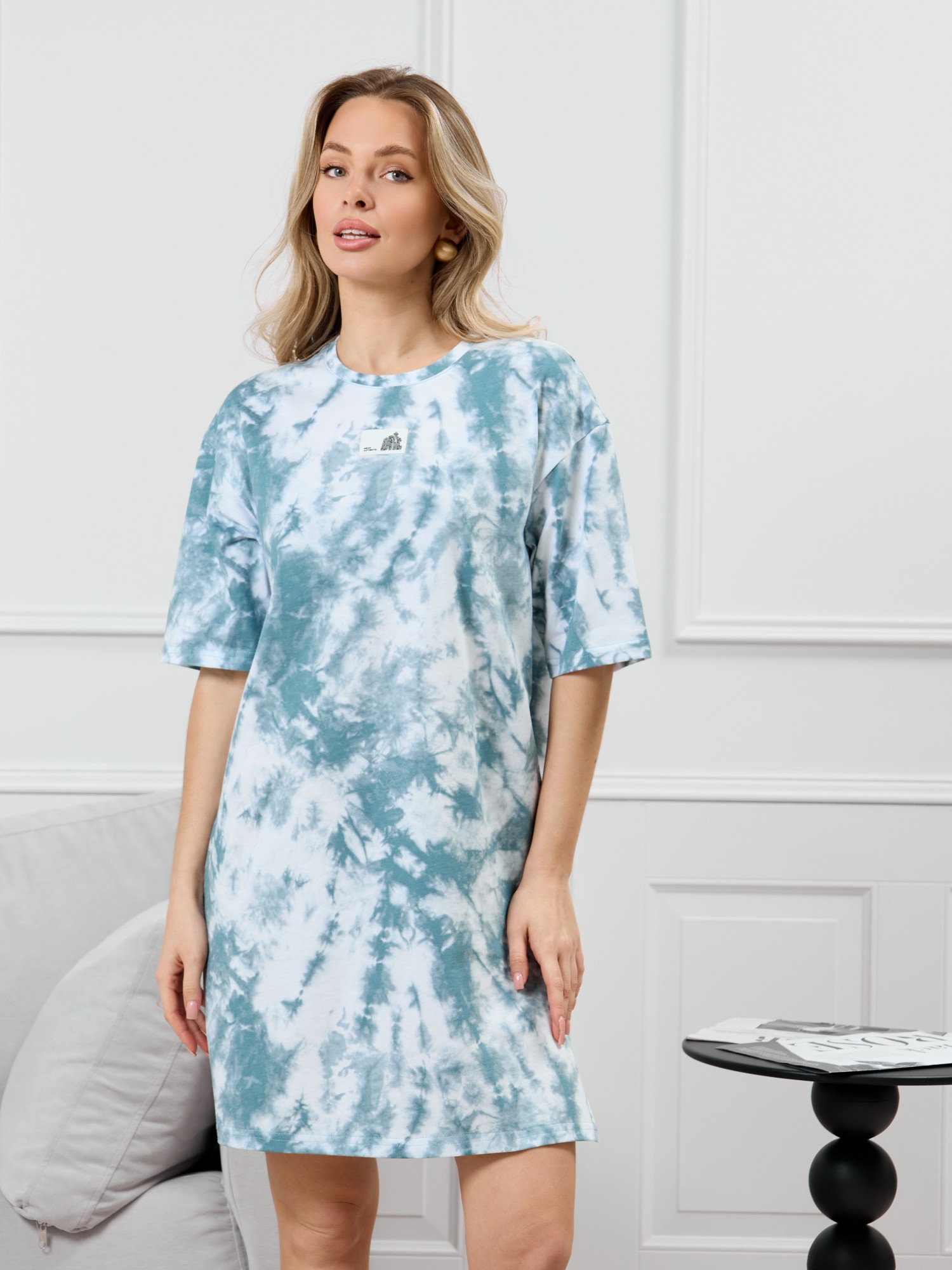 Туника молодежная из трикотажного полотна «кулирка» с набивным рисунком, прямого силуэта, с короткими втачными рукавами, горловиной овальной формы, обработанной притачной бейкой из основного материала, с разрезами в боковых швах. По центру полочки рядом с горловиной настрочен декоративный элемент-нашивка.
