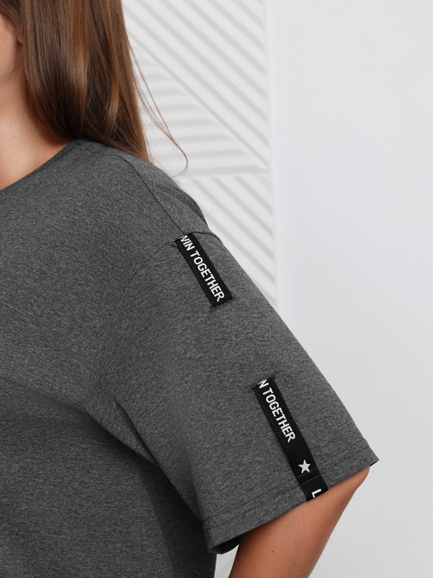 Туника женская из гладкокрашеного «меланжированного» трикотажного полотна «кулирка» прямого силуэта, горловиной овальной формы, обработанной втачной планкой, короткими втачными рукавами и фигурным низом. На рукавах модным элементом является отделка декоративной лентой, продетой в две обметанные петли. На полочке выполнен принт в технике «шелкографии».