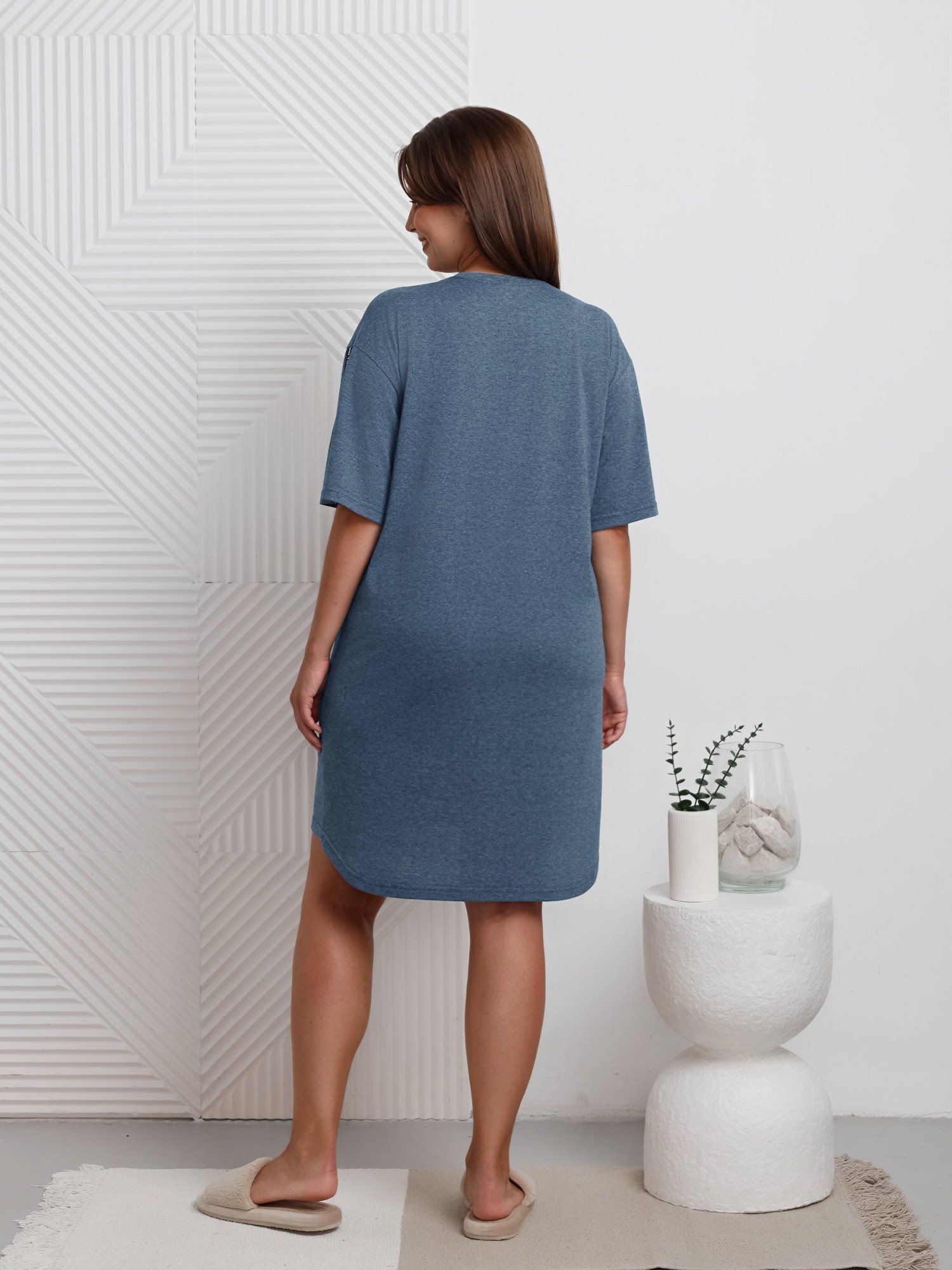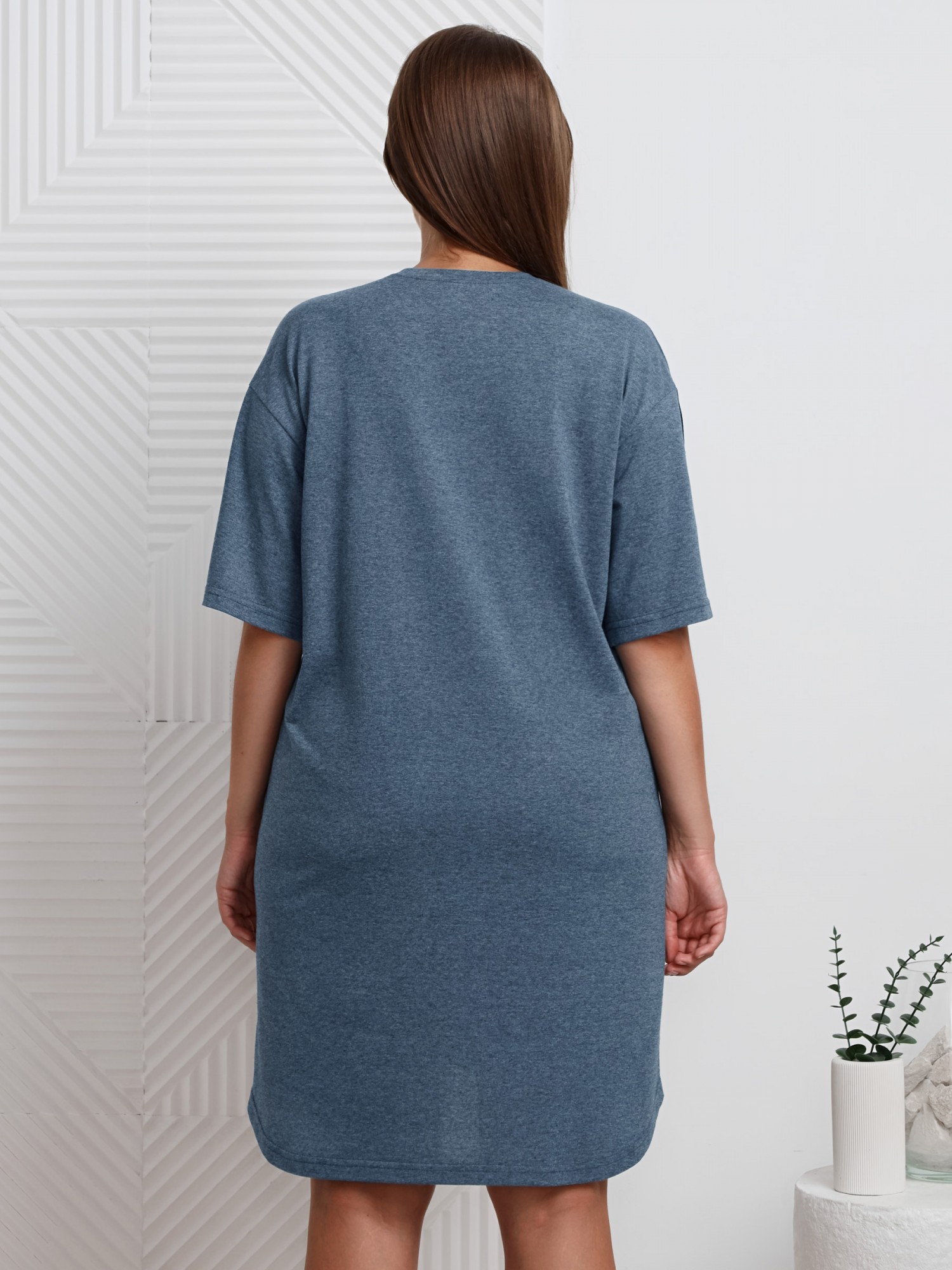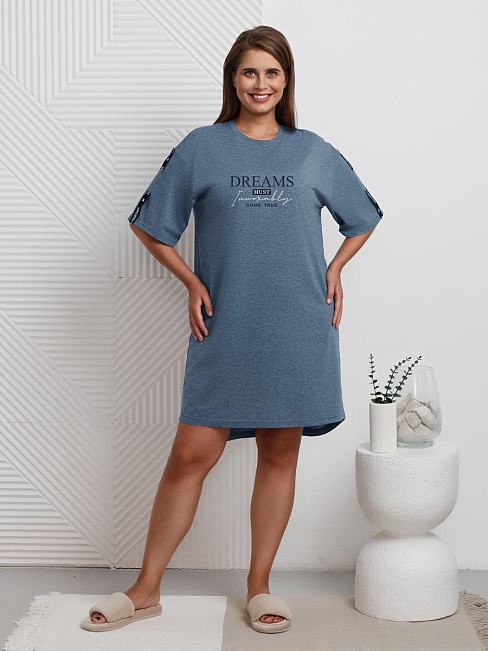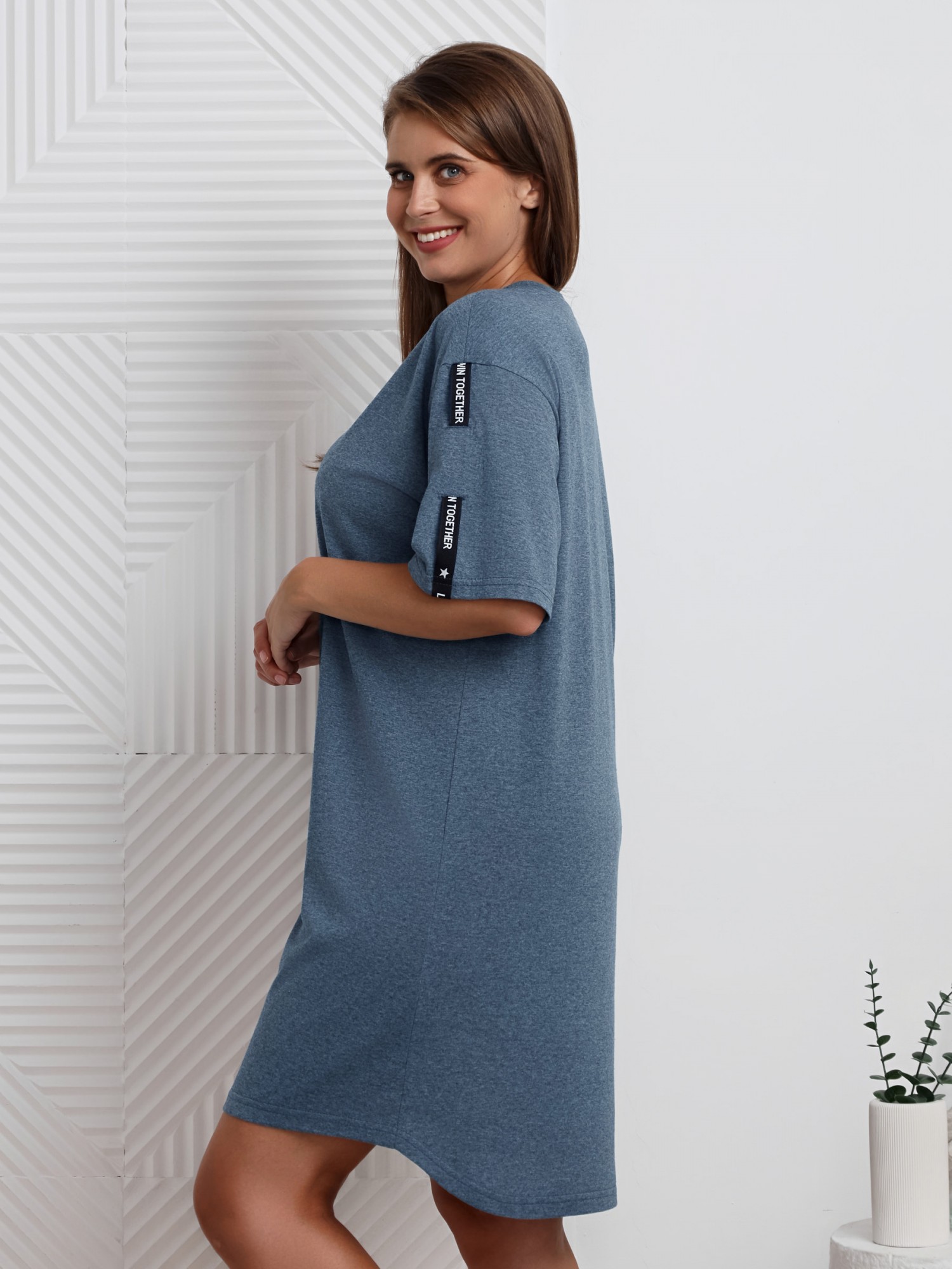Туника женская из гладкокрашеного «меланжированного» трикотажного полотна «кулирка» прямого силуэта, горловиной овальной формы, обработанной втачной планкой, короткими втачными рукавами и фигурным низом. На рукавах модным элементом является отделка декоративной лентой, продетой в две обметанные петли. На полочке выполнен принт в технике «шелкографии».