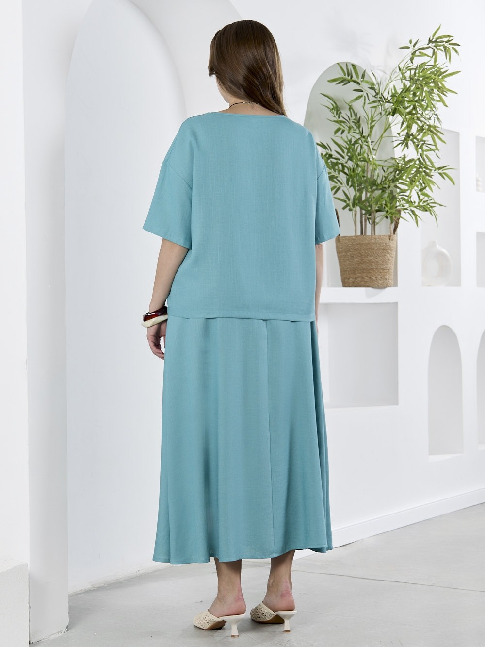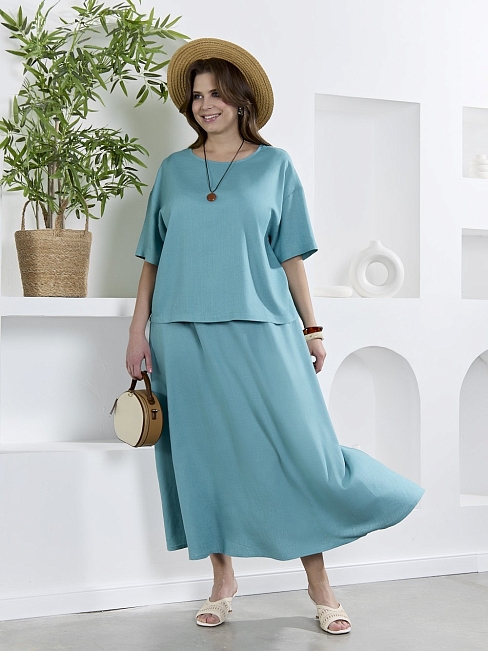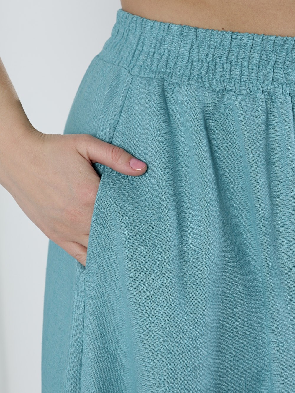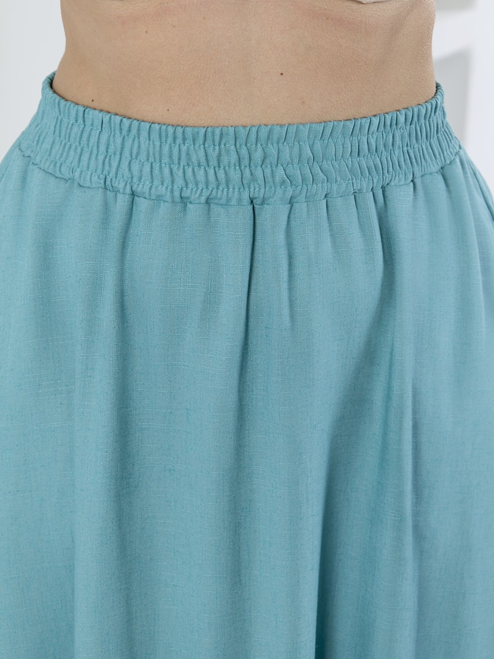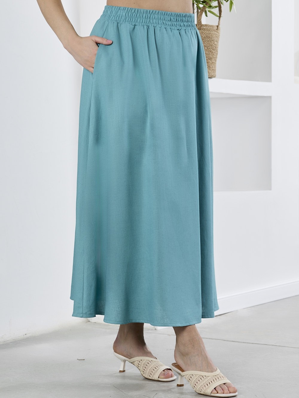 Юбка женская из гладкокрашеного тканого полотна, удлиненная, свободная, с карманами в боковых швах, на притачном поясе с эластичной тесьмой внутри.