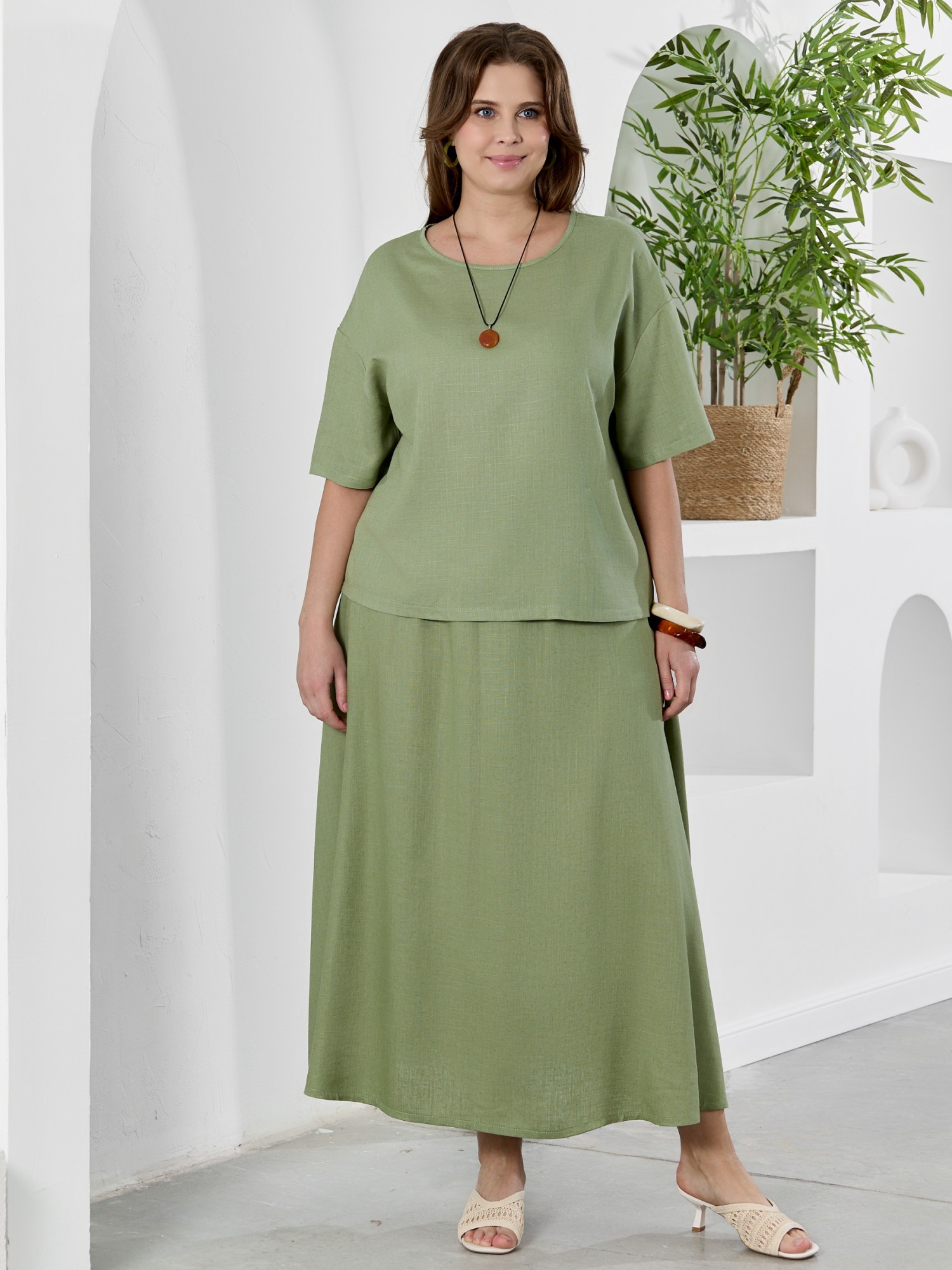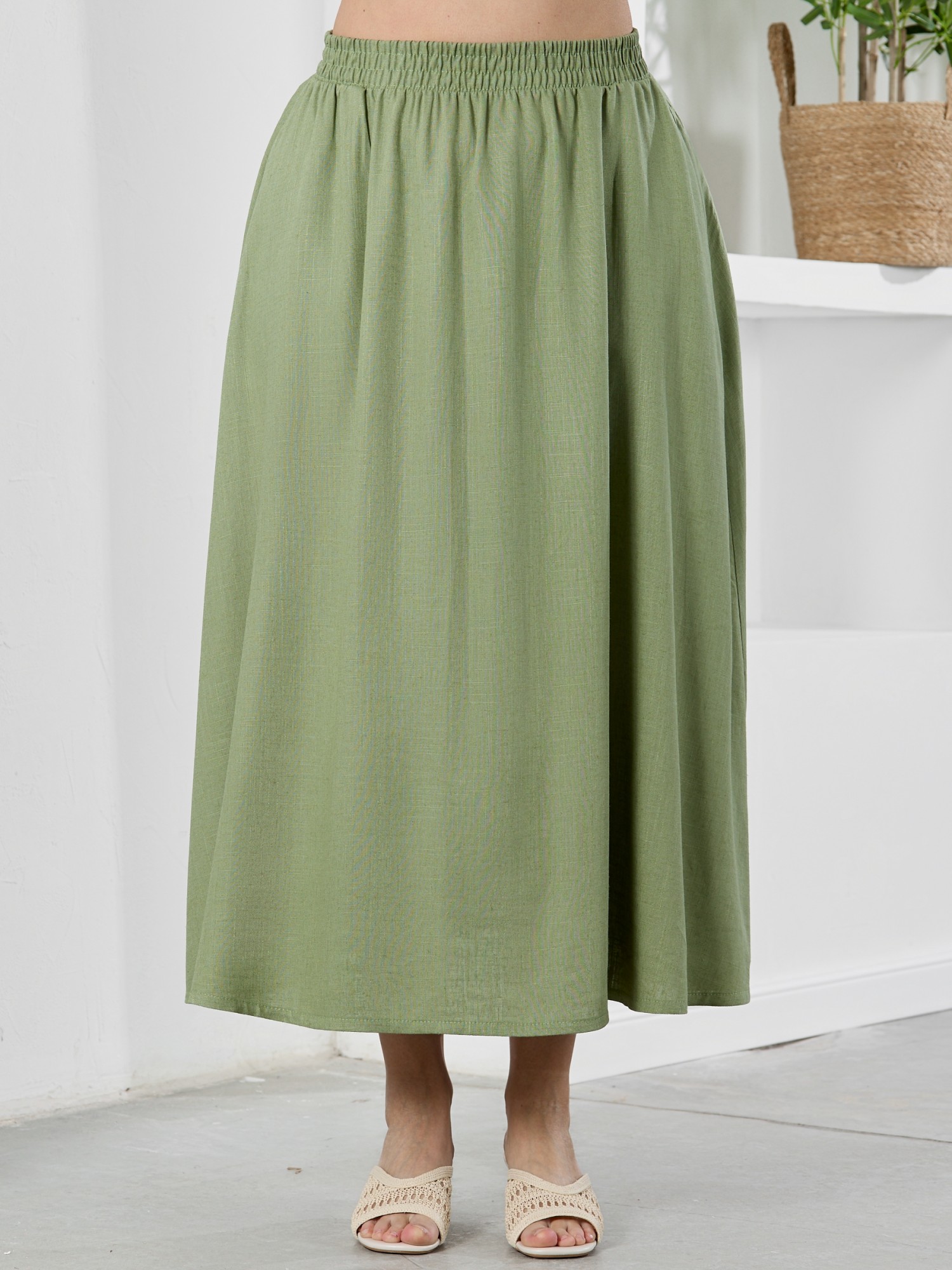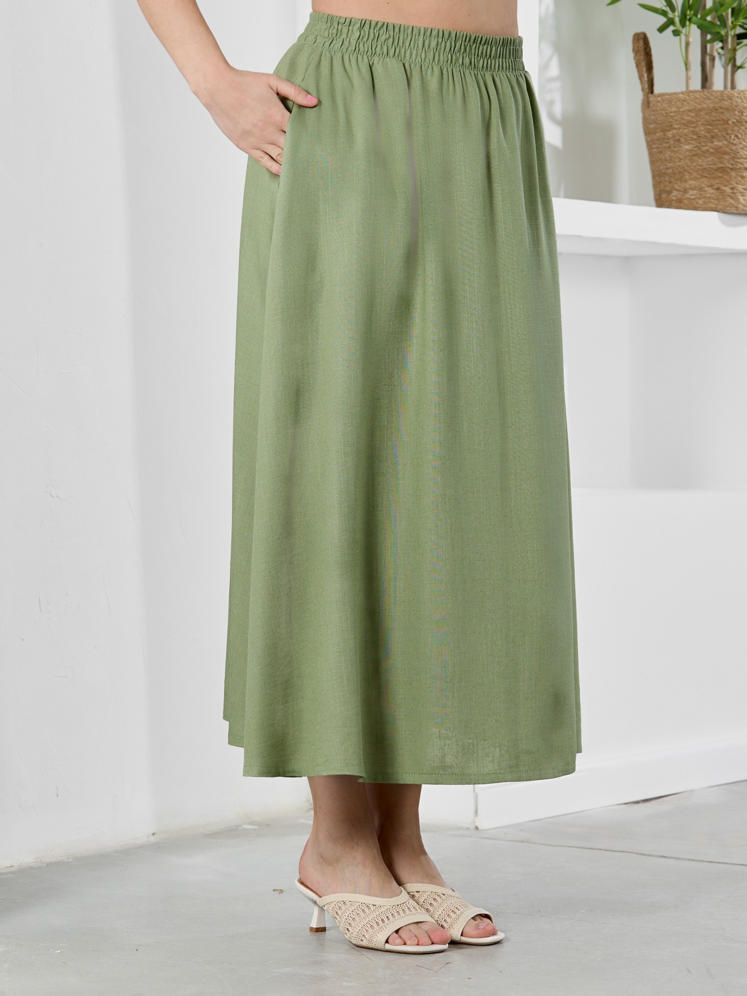 Юбка женская из гладкокрашеного тканого полотна, удлиненная, свободная, с карманами в боковых швах, на притачном поясе с эластичной тесьмой внутри.