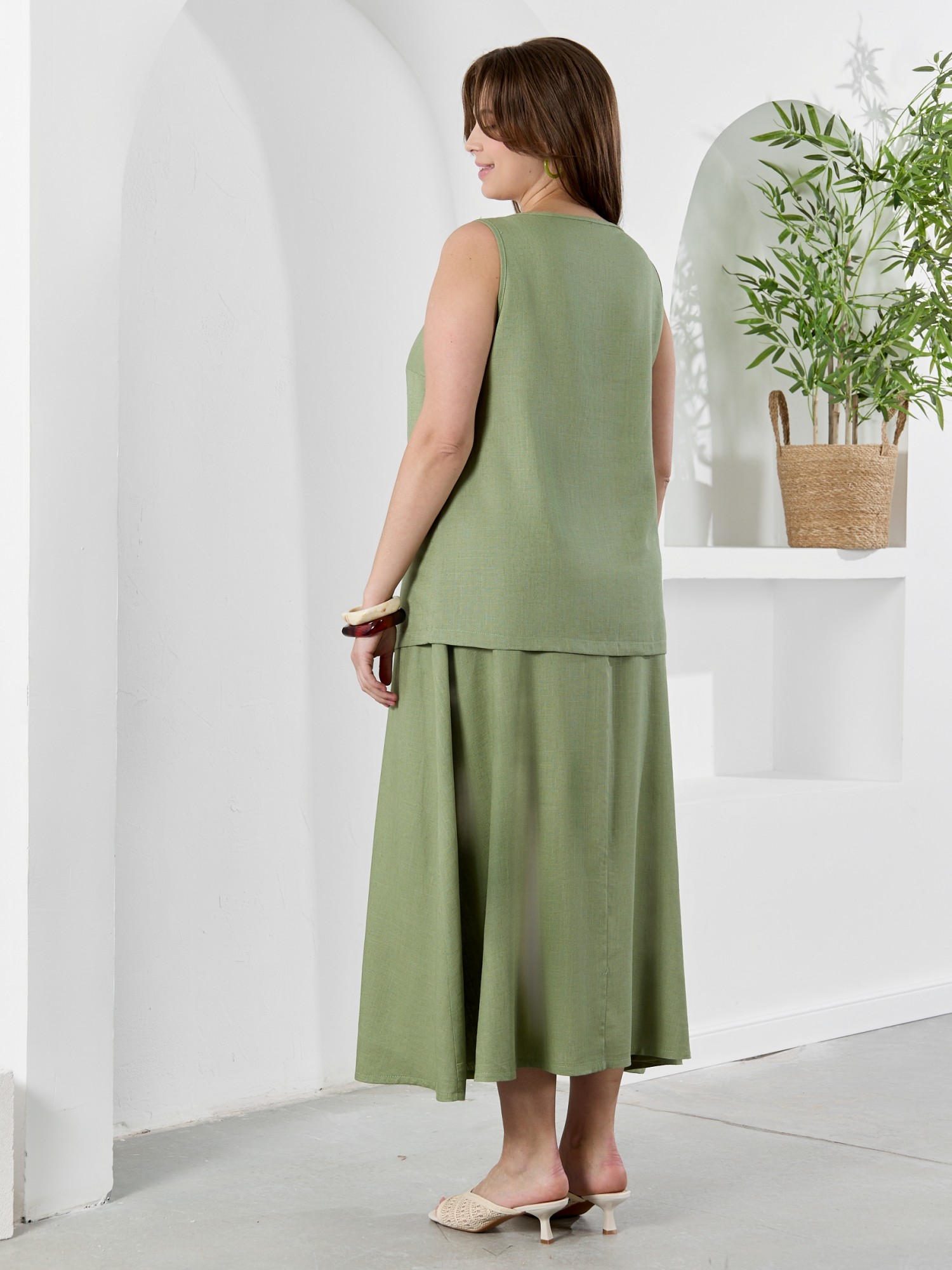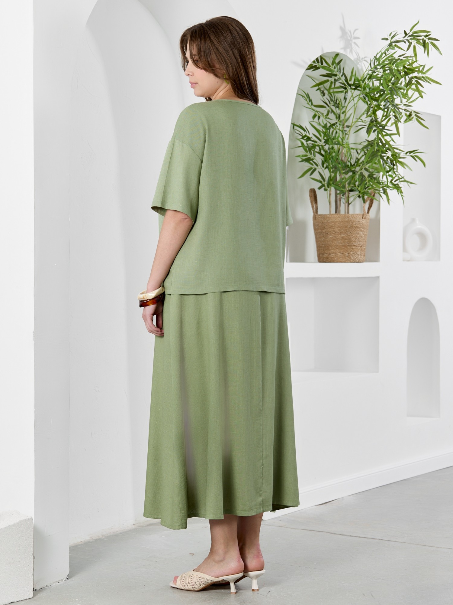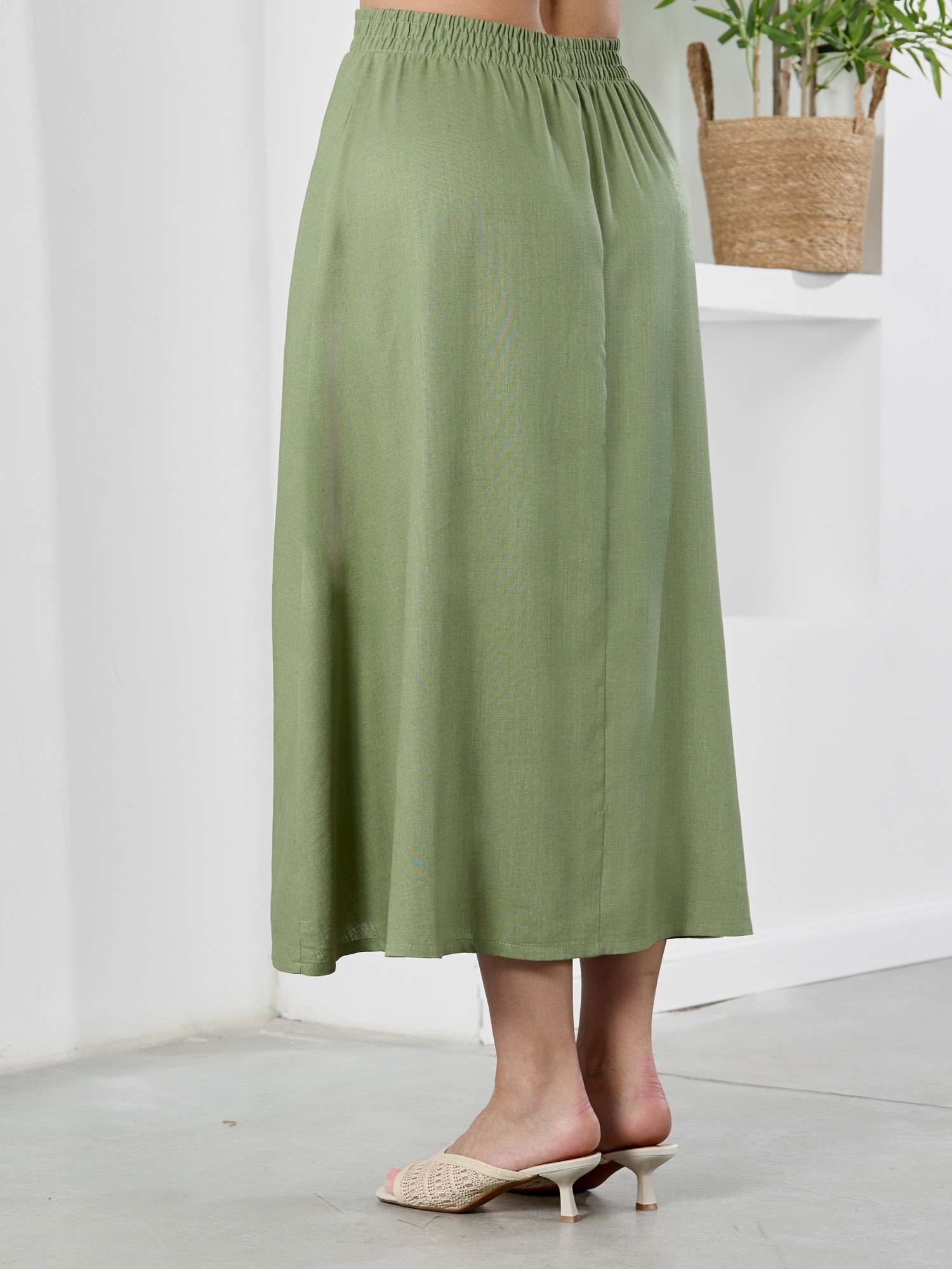 Юбка женская из гладкокрашеного тканого полотна, удлиненная, свободная, с карманами в боковых швах, на притачном поясе с эластичной тесьмой внутри.