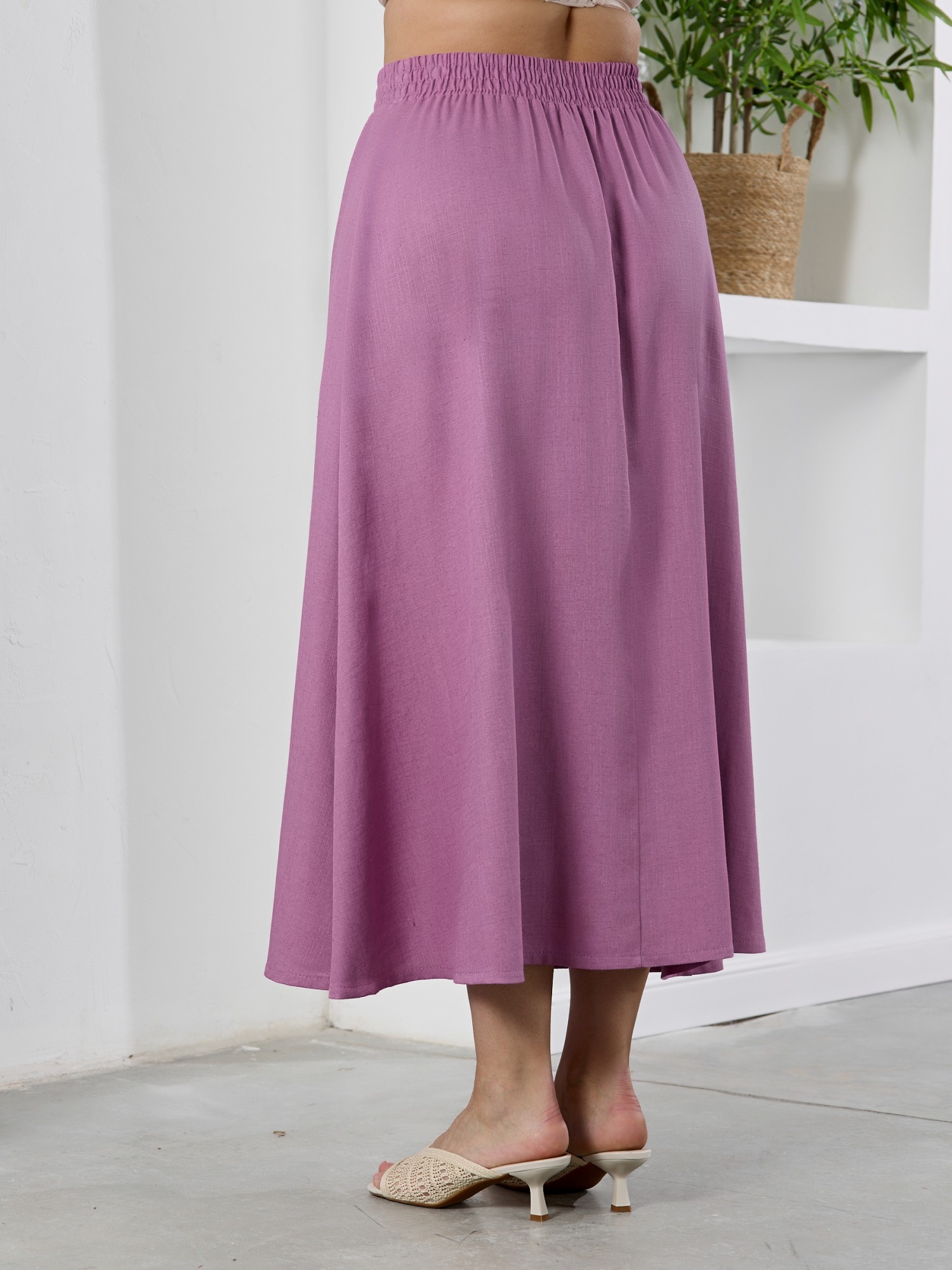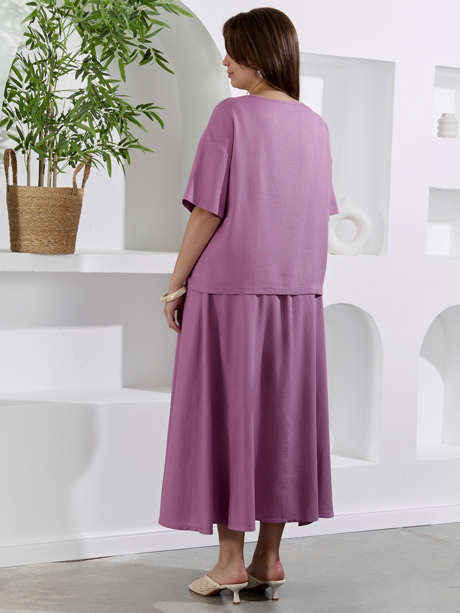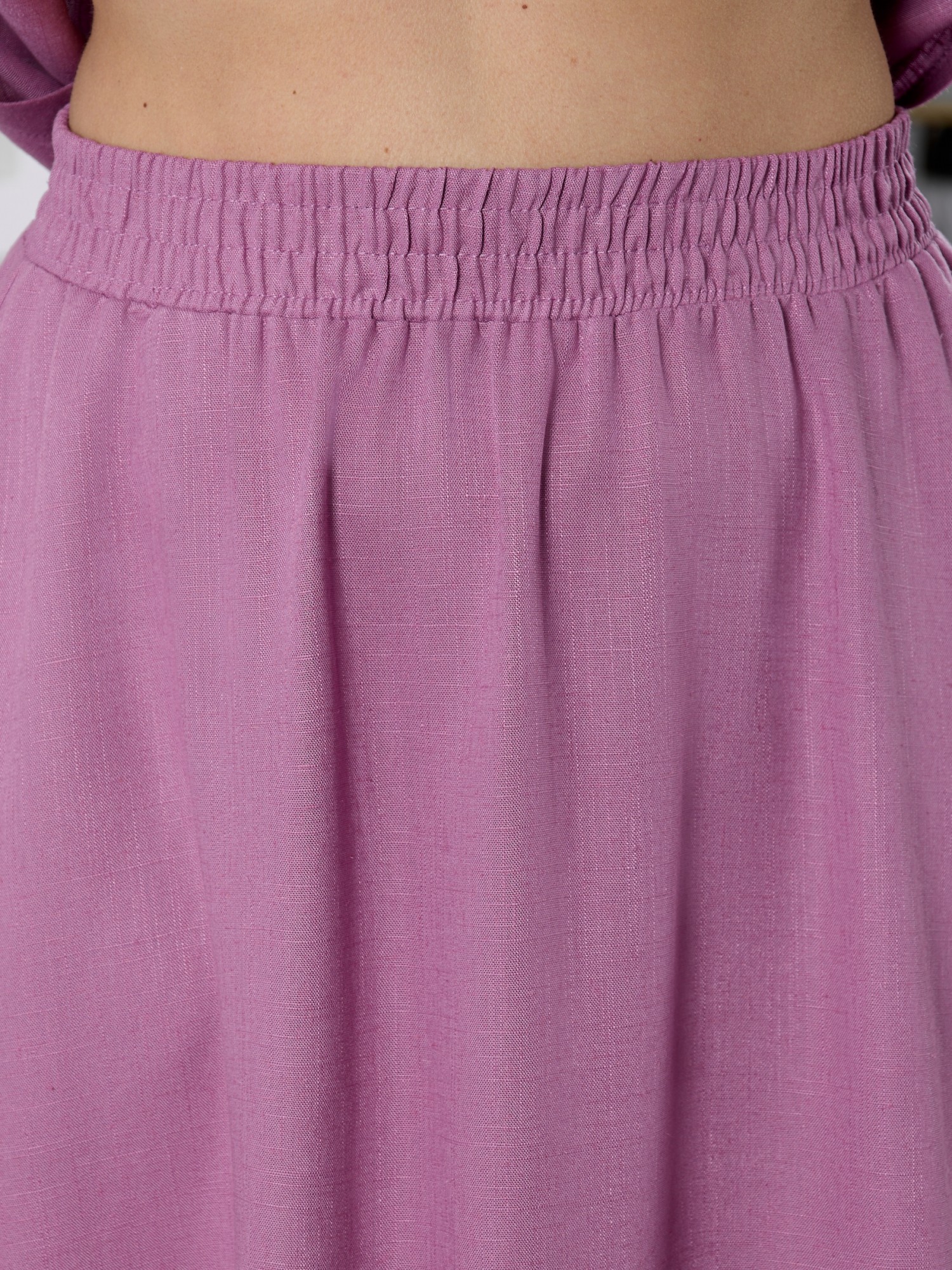 Юбка женская из гладкокрашеного тканого полотна, удлиненная, свободная, с карманами в боковых швах, на притачном поясе с эластичной тесьмой внутри.