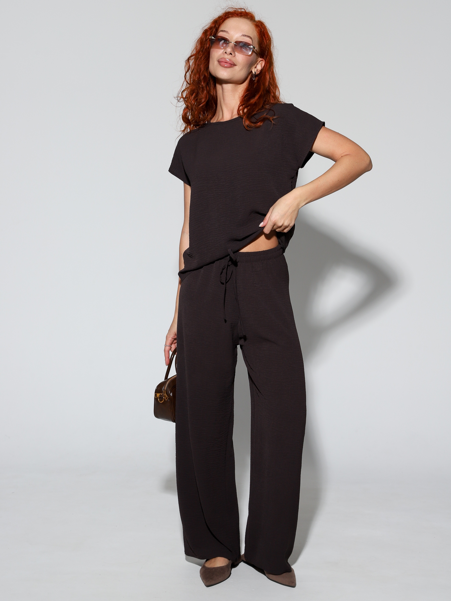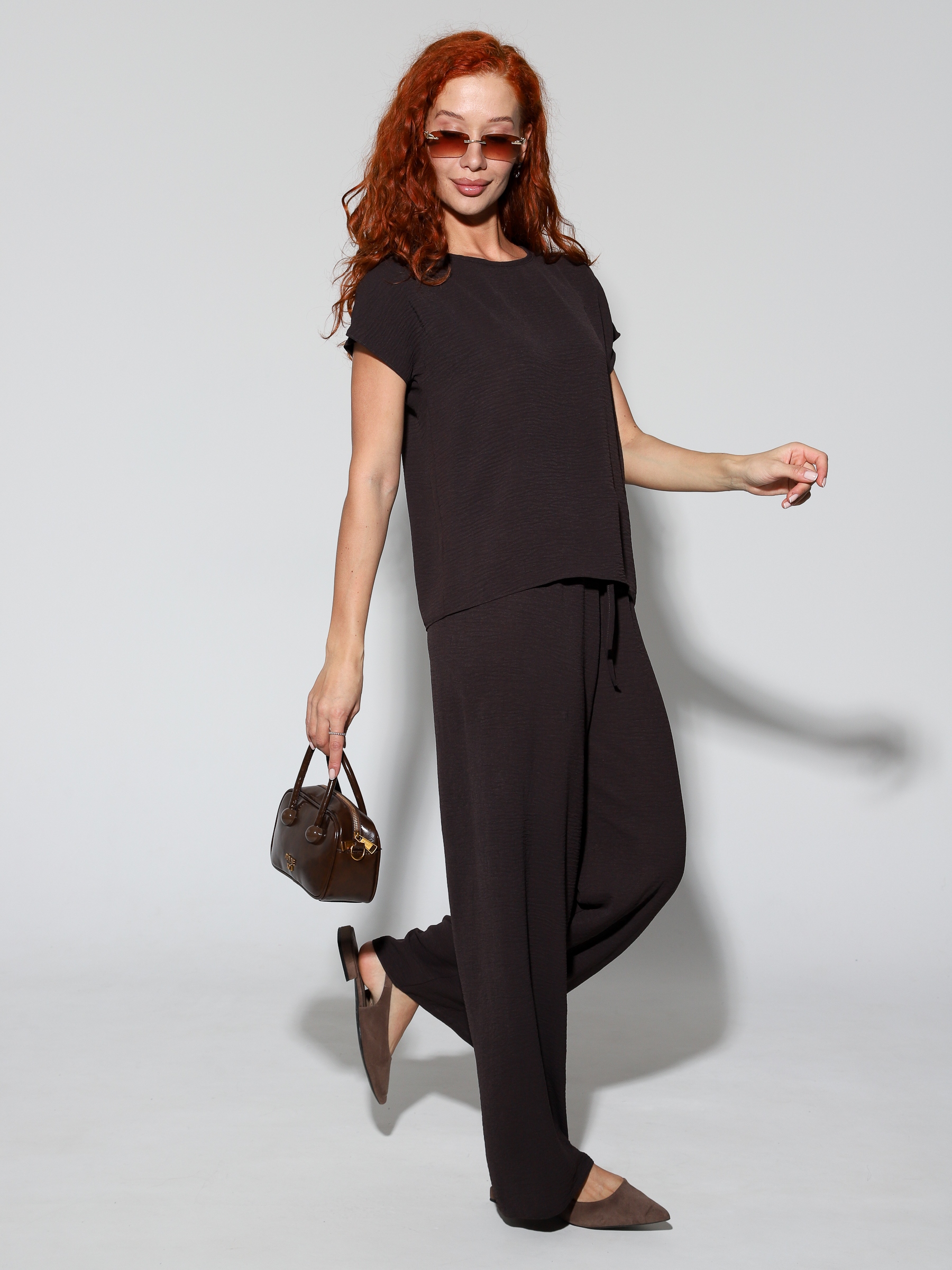 Женские свободные брюки из жатки — это модель с характерным «мятым» эффектом, который придаёт изделию особый стиль и практичность. Жатка — это ткань с рельефной поверхностью, созданной за счёт специального промышленного сжатия волокон. Такой материал не мнётся, не требует глажки и сохраняет форму после стирок.