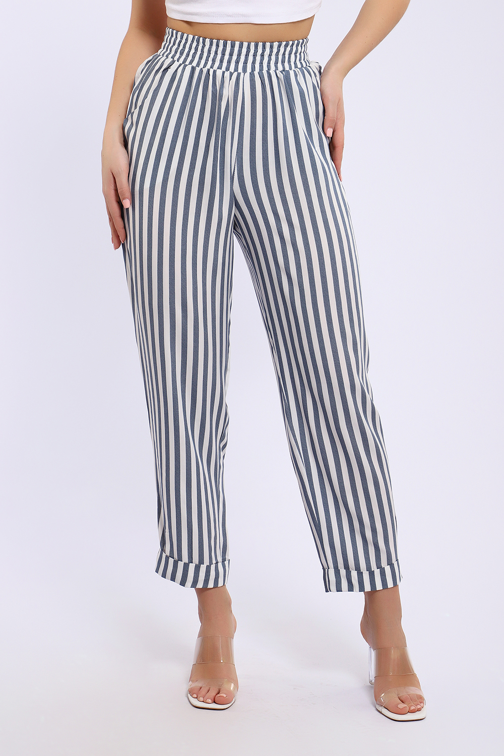Брюки имеют два боковых внутренних кармана. Длина их 7/8, снизу притачаны манжеты, которые можно подвернуть наверх или отвернуть вниз, чтобы удлинить штаны. В замерах указана длина брюк с подвернутыми наверх манжетами. Рост модели 167см. Обхват талии в замерах соответствует длине резинки в растянутом виде.