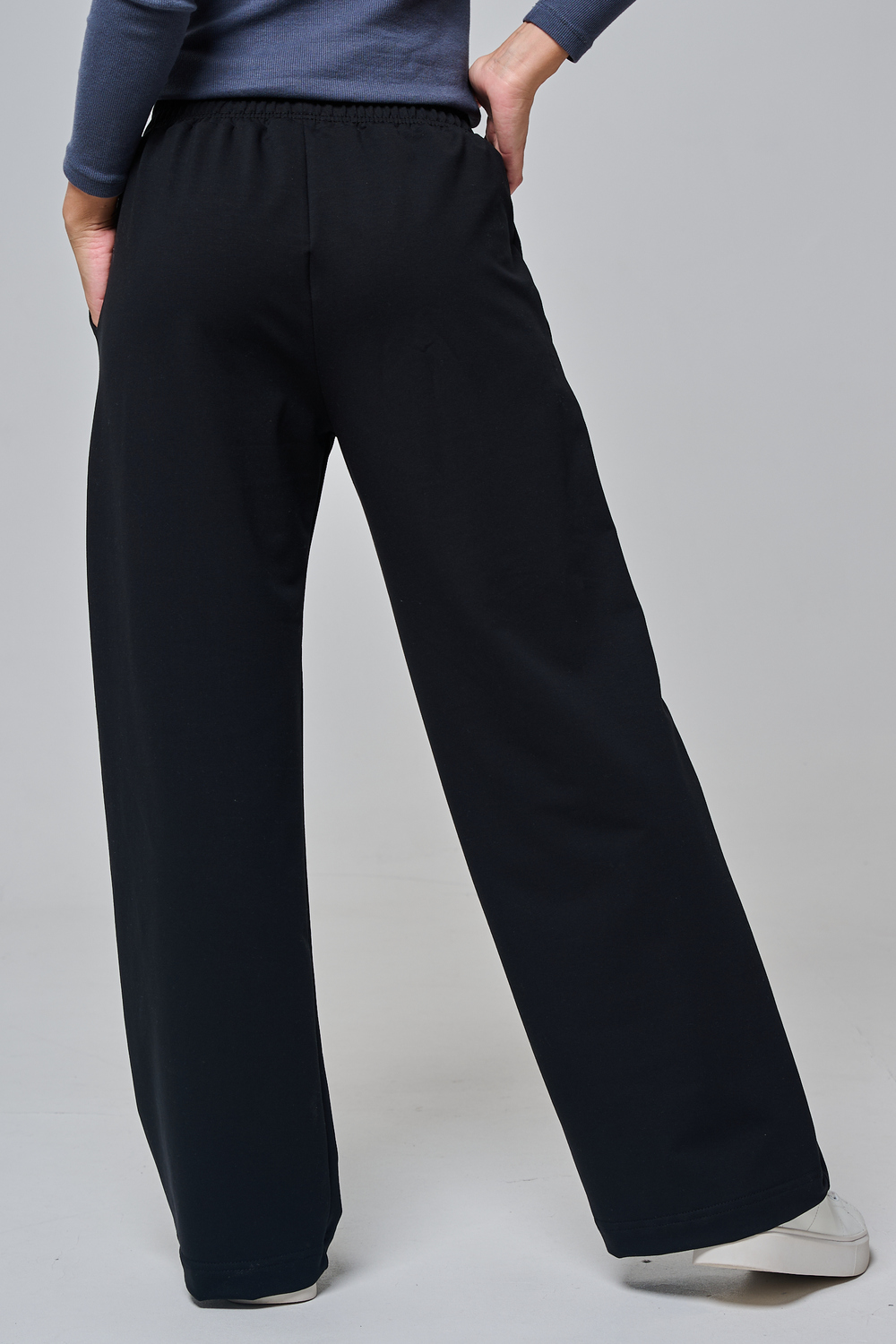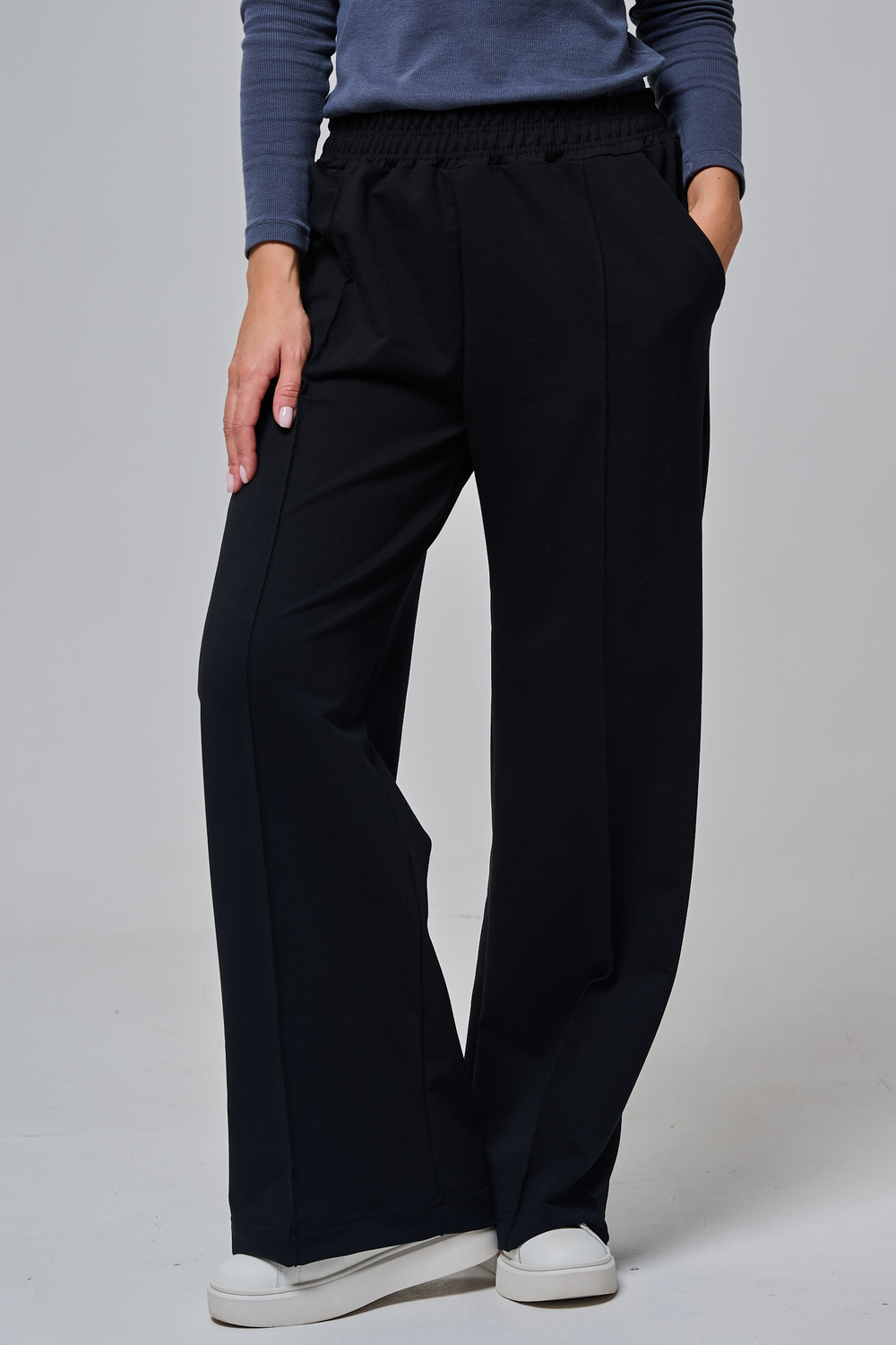 Дизайн подчеркивает женственность: высокая посадка с удобным эластичным поясом на шнуровке позволяет легко регулировать посадку, а объемные, струящиеся штанины от бедра до щиколотки создают эффектный силуэт, визуально удлиняющий ноги. Практичные боковые карманы добавляют функциональности, не нарушая минималистичный вид.