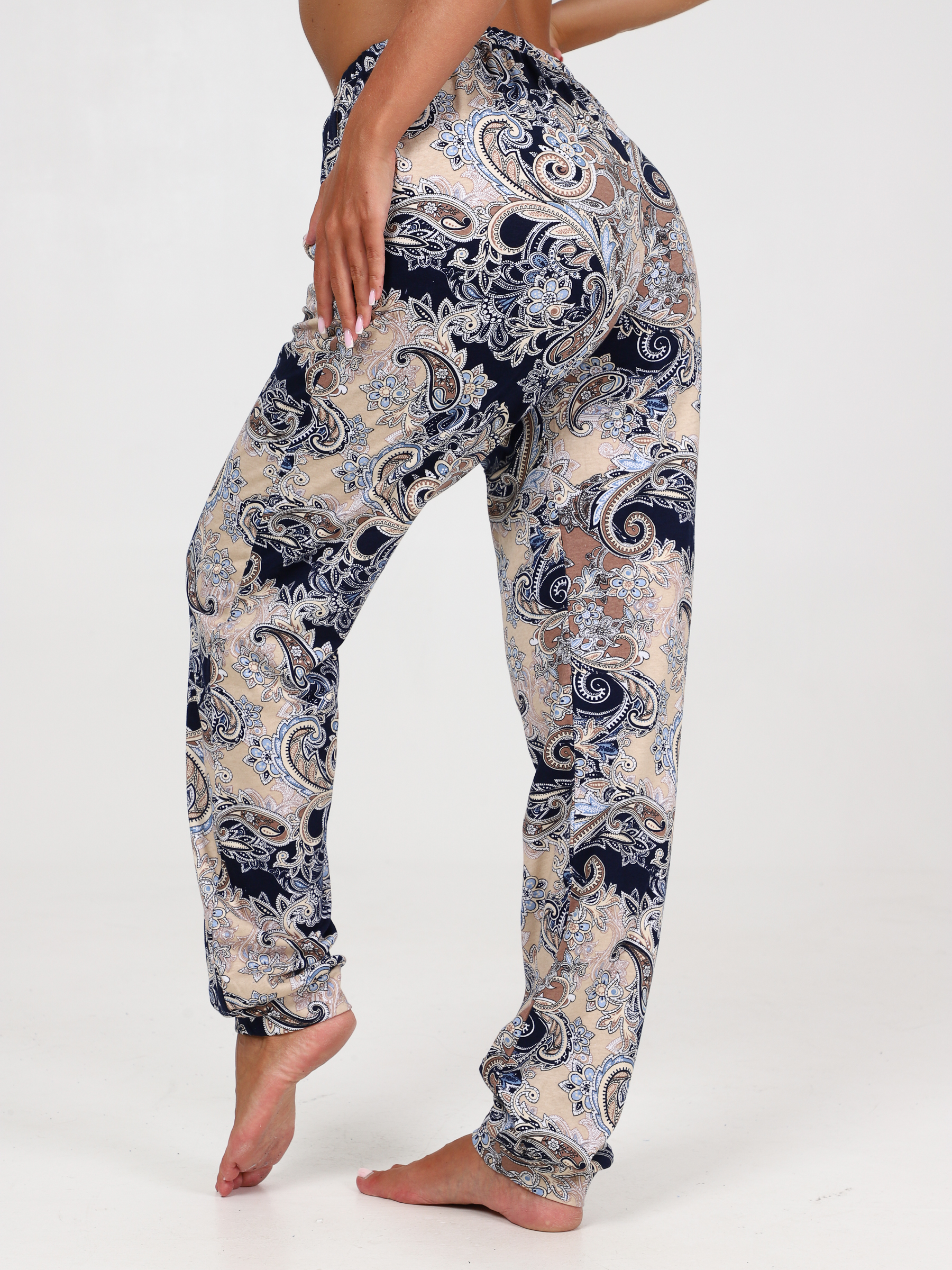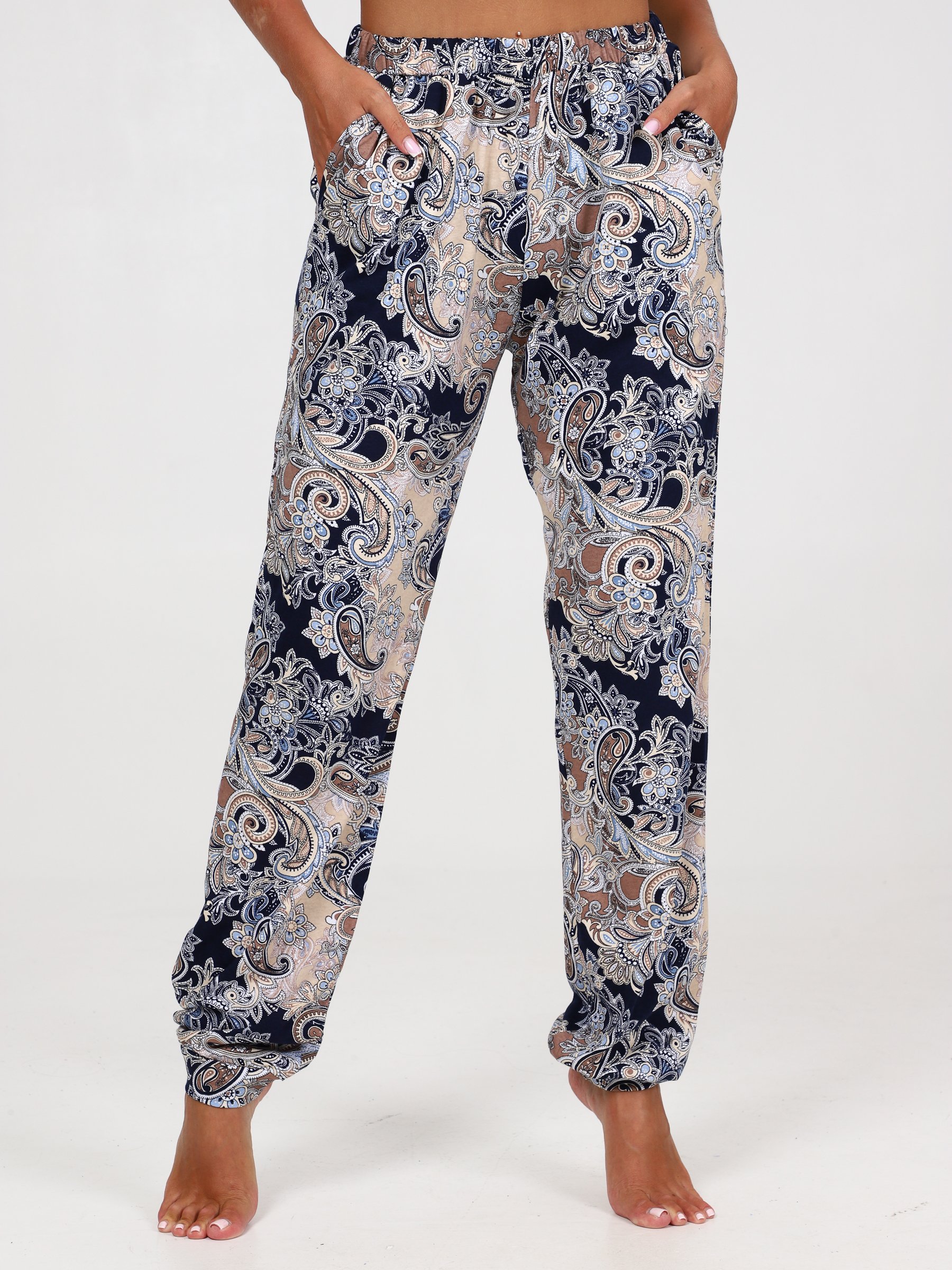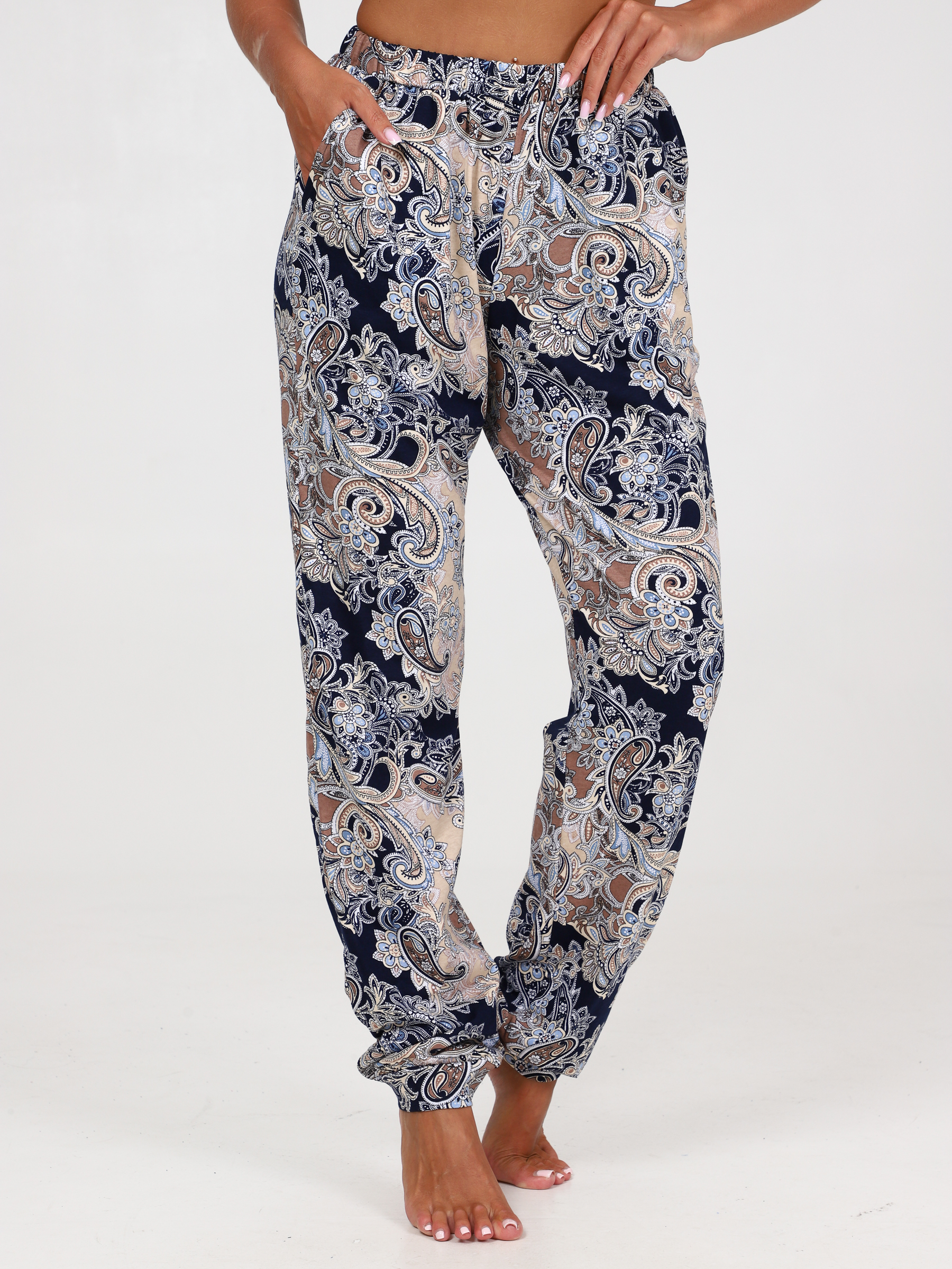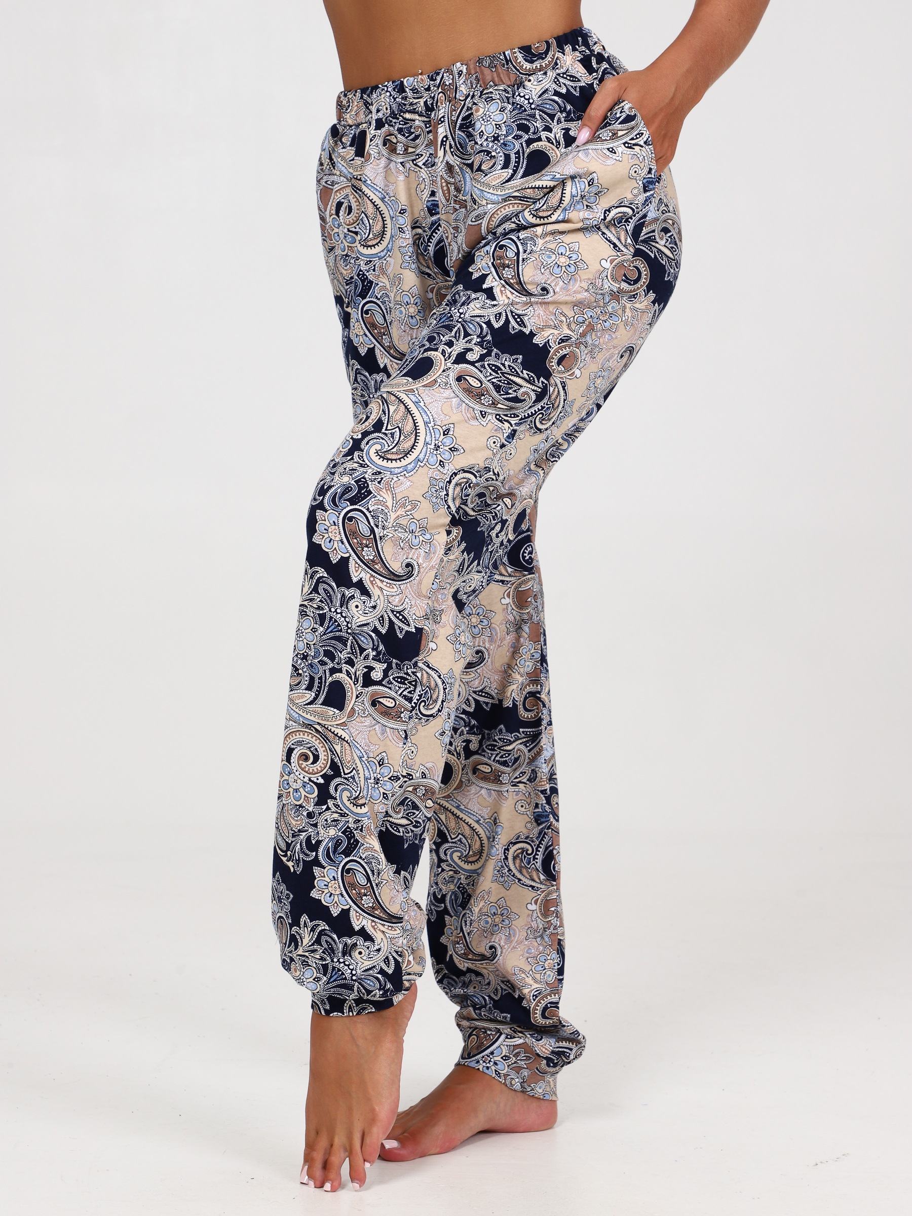 Женские трикотажные брюки свободного кроя, слегка зауженные к низу на манжете, предназначенные для повседневной носки. Домашние брюки с высокой посадкой, пояс на широкой резинке, без шнура, что делает их удобными и комфортными в носке. Трикотажные брюки сшиты из 100% хлопка, что позволяет коже дышать. По бокам брюк имеются глубокие внутренние карманы.