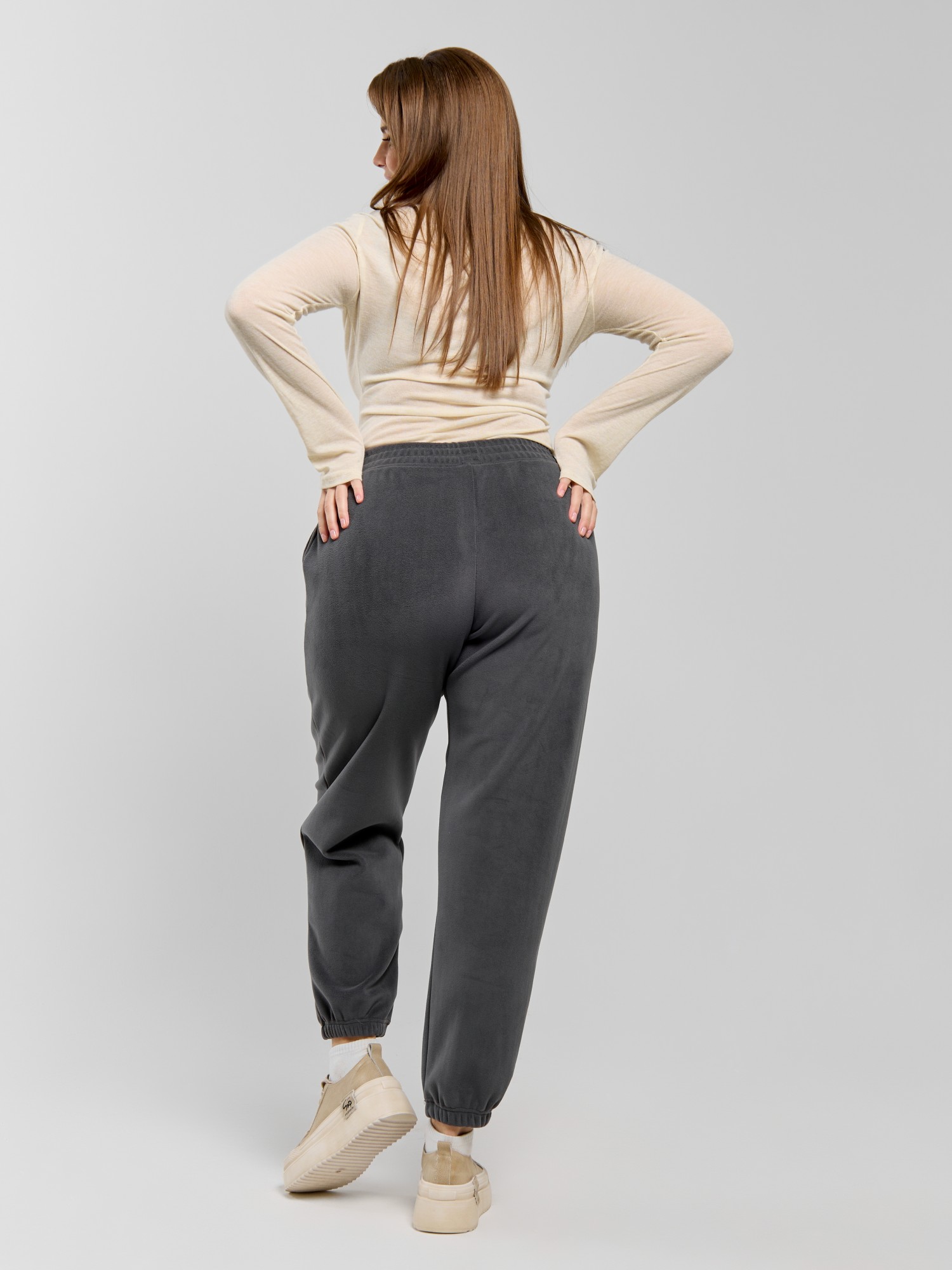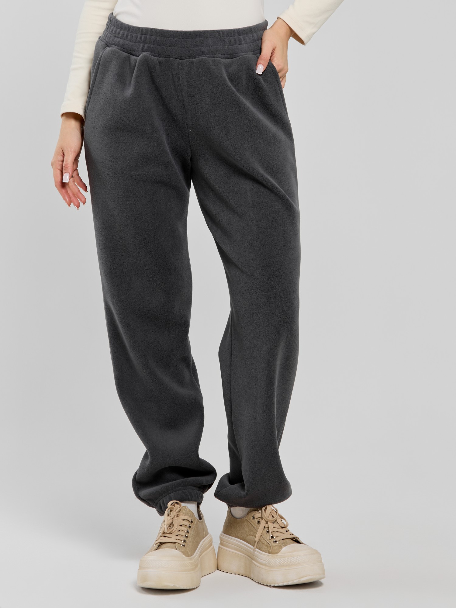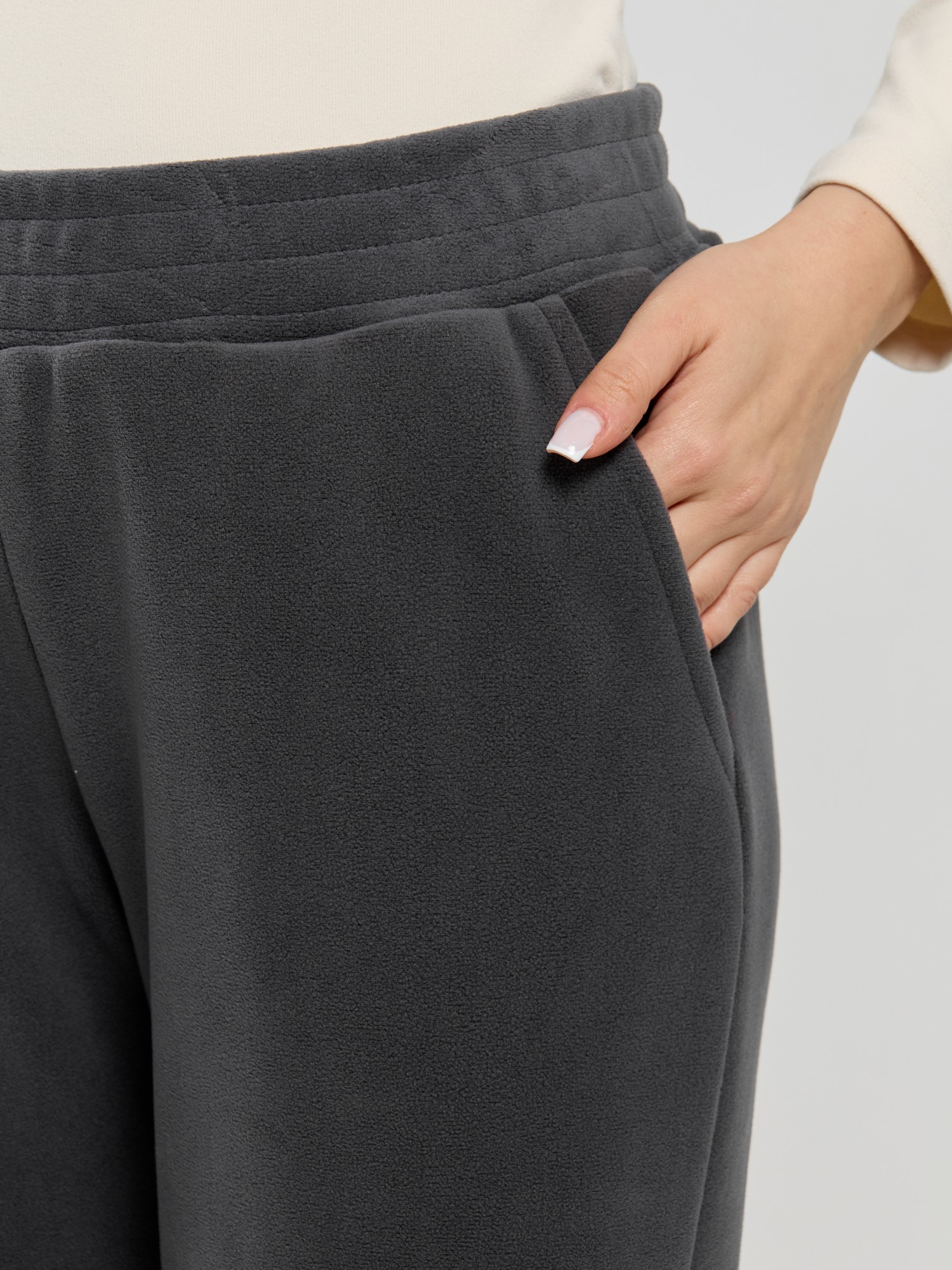Брюки молодежные из гладкокрашенного трикотажного полотна« дабл-флис» (двухсторонний флис), длинные, с карманами в боковыхшвах, на поясе с эластичной тесьмой внутри. Подгибка нижних срезов выполнена с эластичной тесьмой.