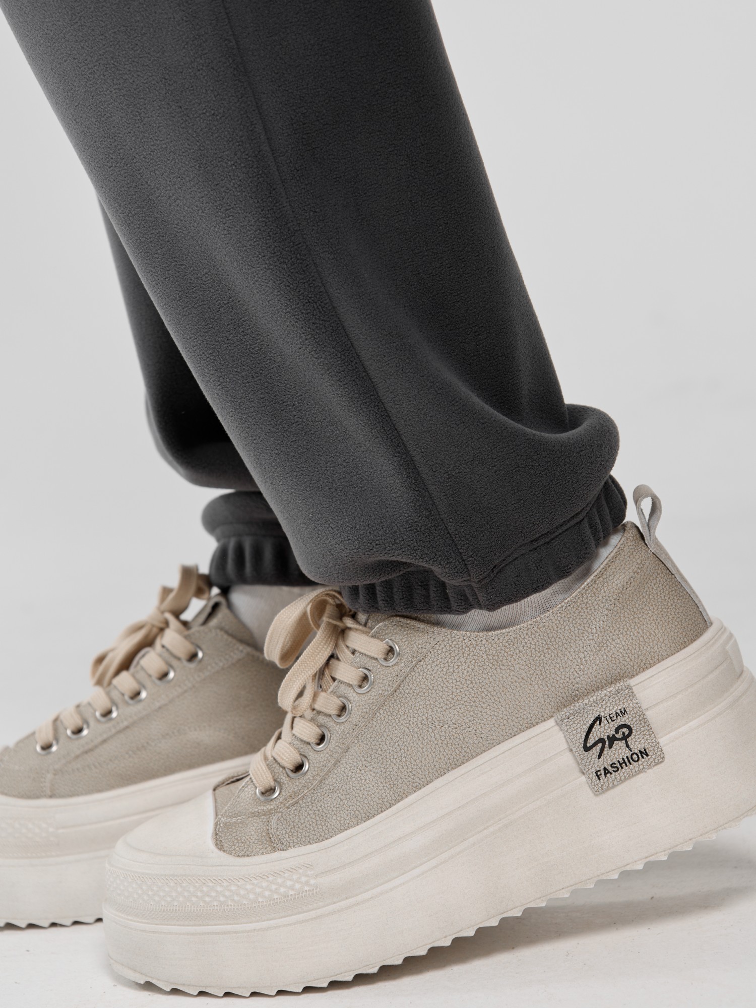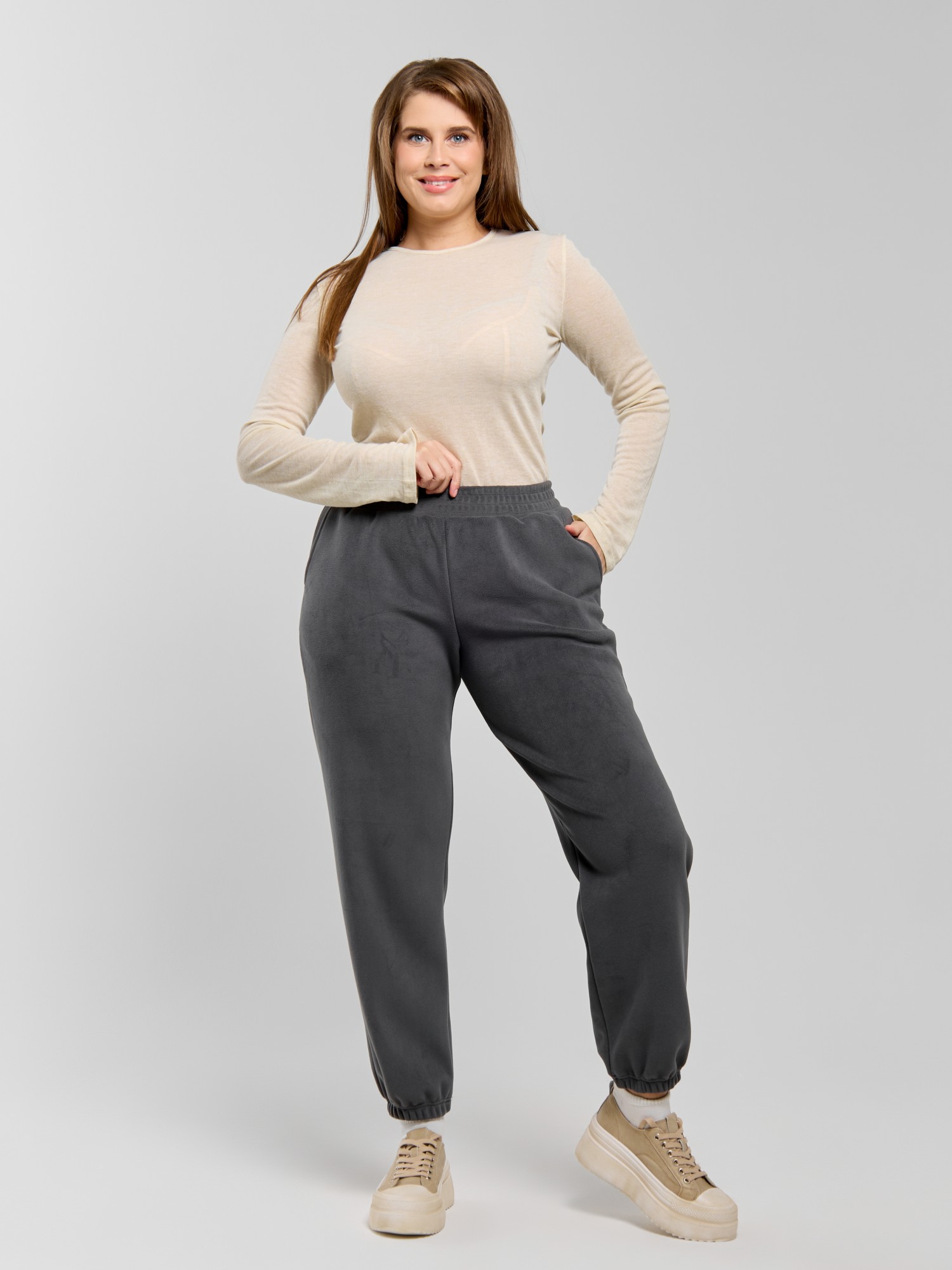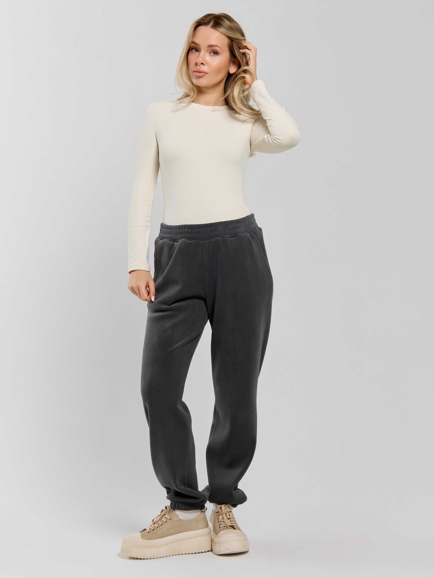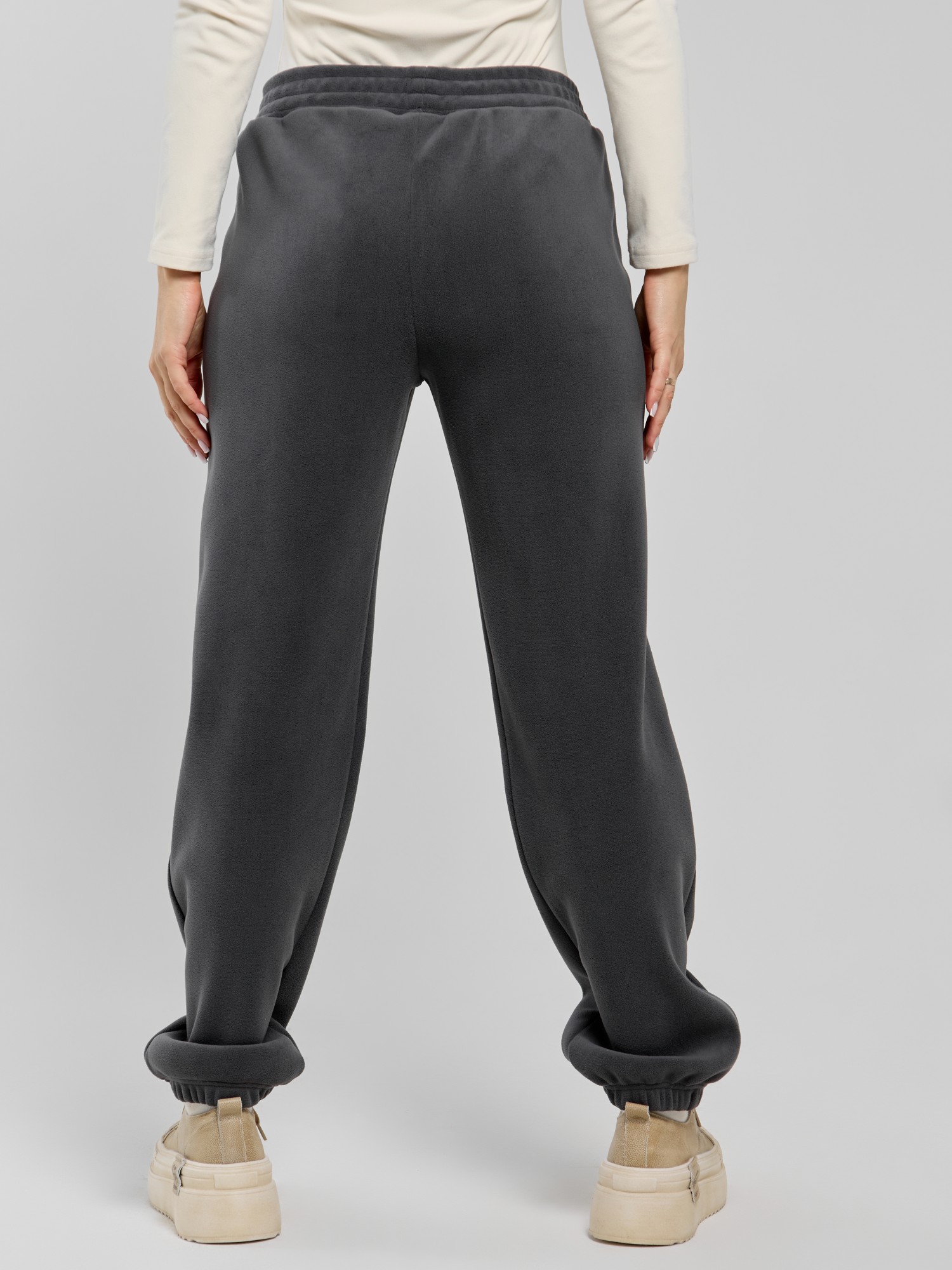 Брюки молодежные из гладкокрашенного трикотажного полотна« дабл-флис» (двухсторонний флис), длинные, с карманами в боковыхшвах, на поясе с эластичной тесьмой внутри. Подгибка нижних срезов выполнена с эластичной тесьмой.