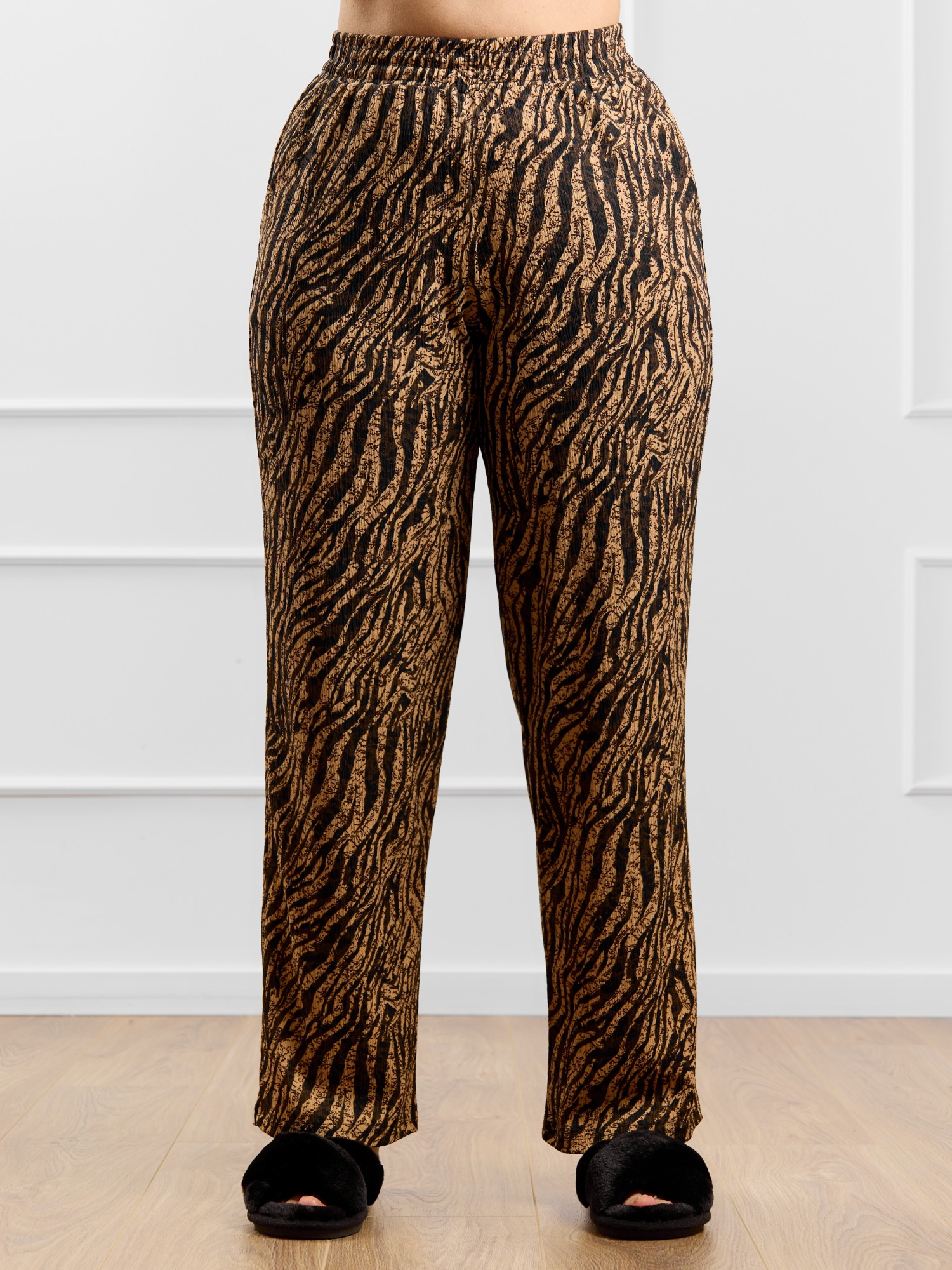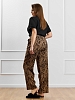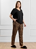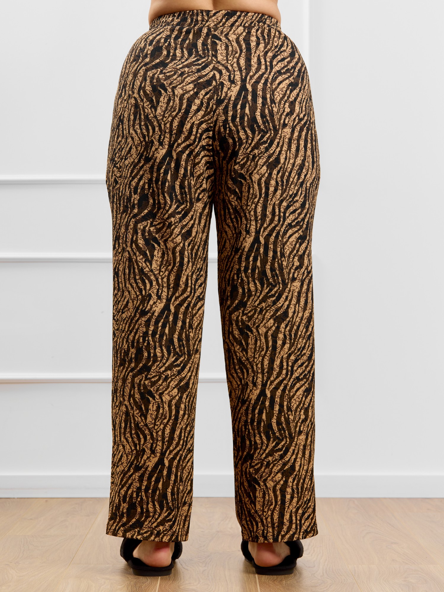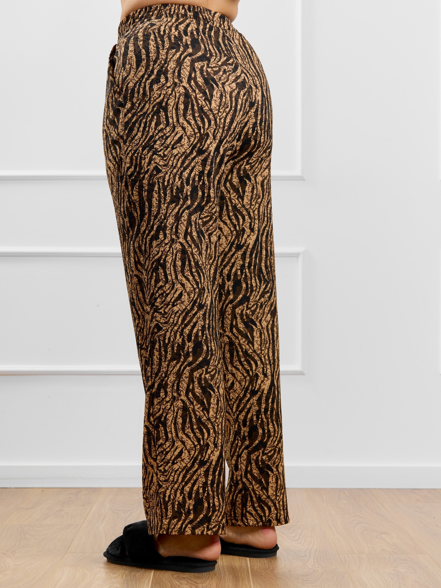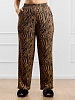Брюки женские из трикотажного полотна «бурумчук» (шелковый креп) с набивным рисунком, прямого кроя, свободные, с карманами в боковых швах, на притачном поясе с эластичной тесьмой внутри.