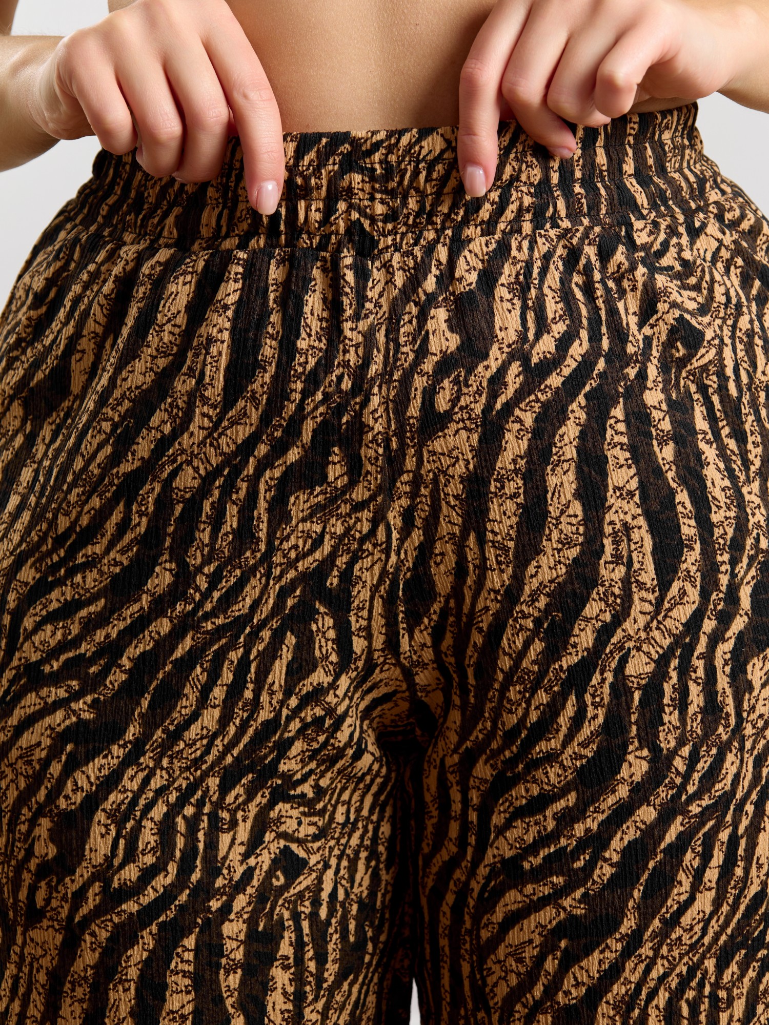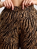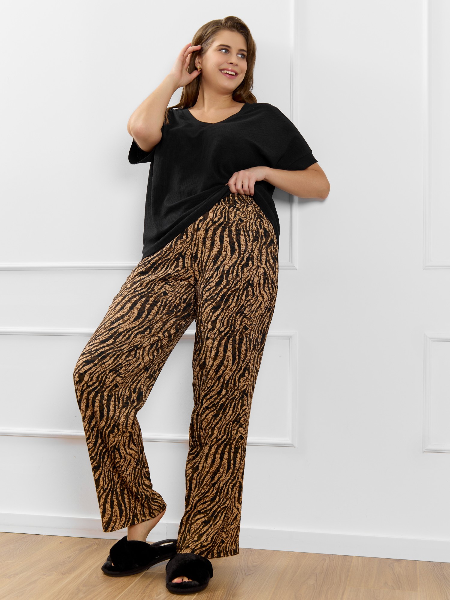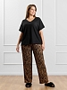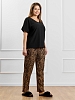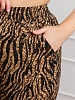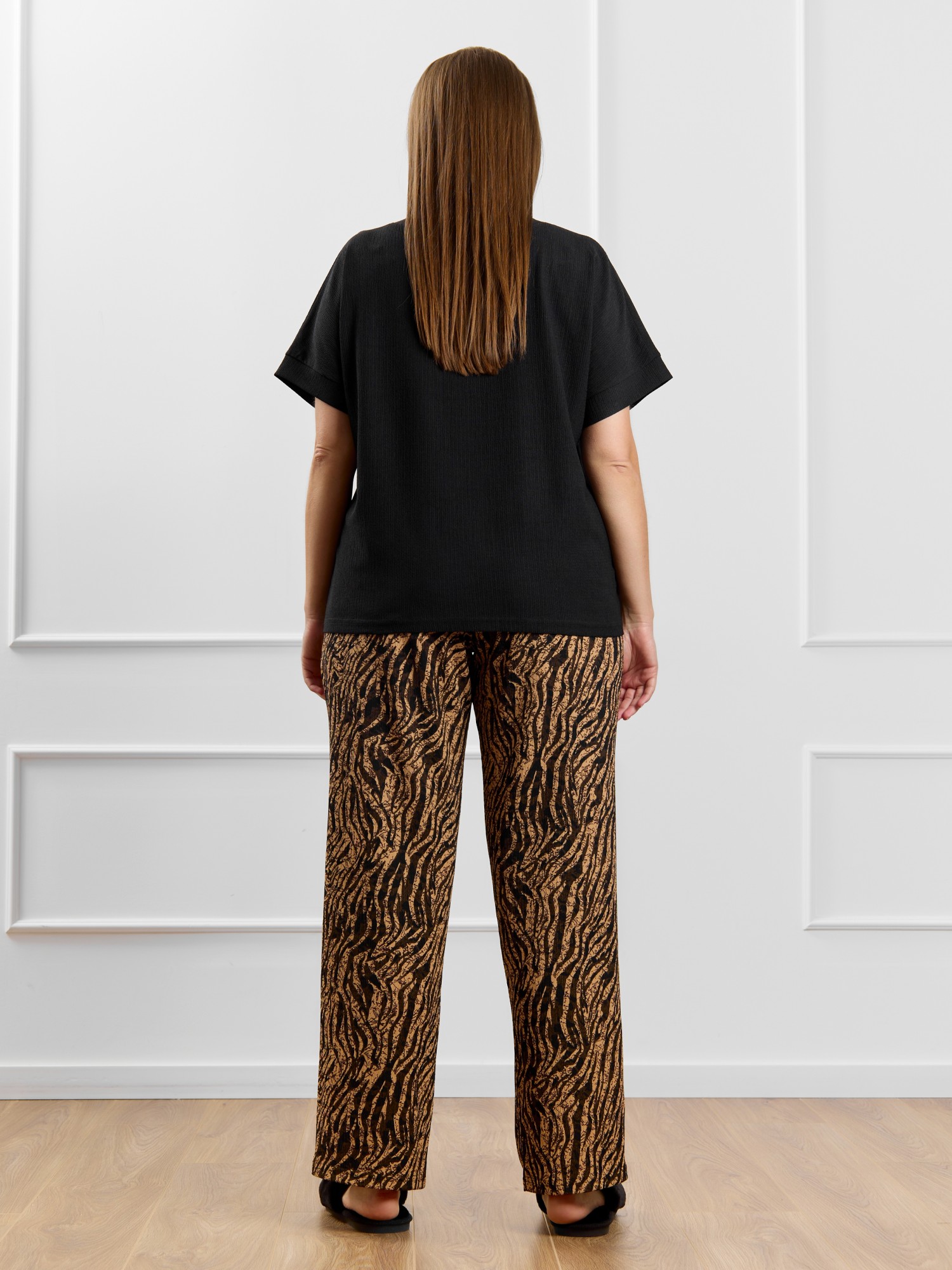 Брюки женские из трикотажного полотна «бурумчук» (шелковый креп) с набивным рисунком, прямого кроя, свободные, с карманами в боковых швах, на притачном поясе с эластичной тесьмой внутри.