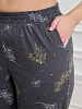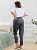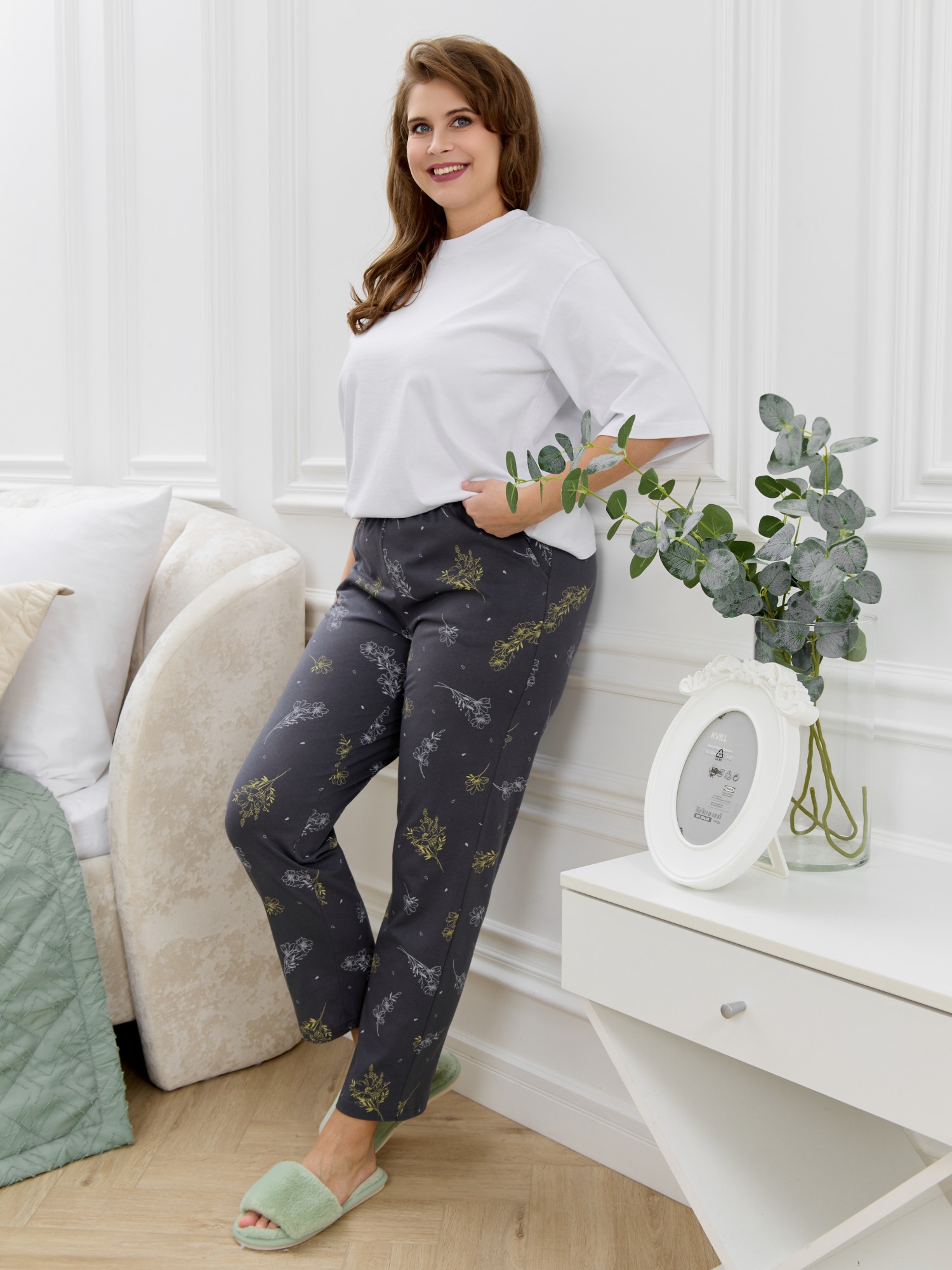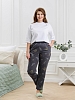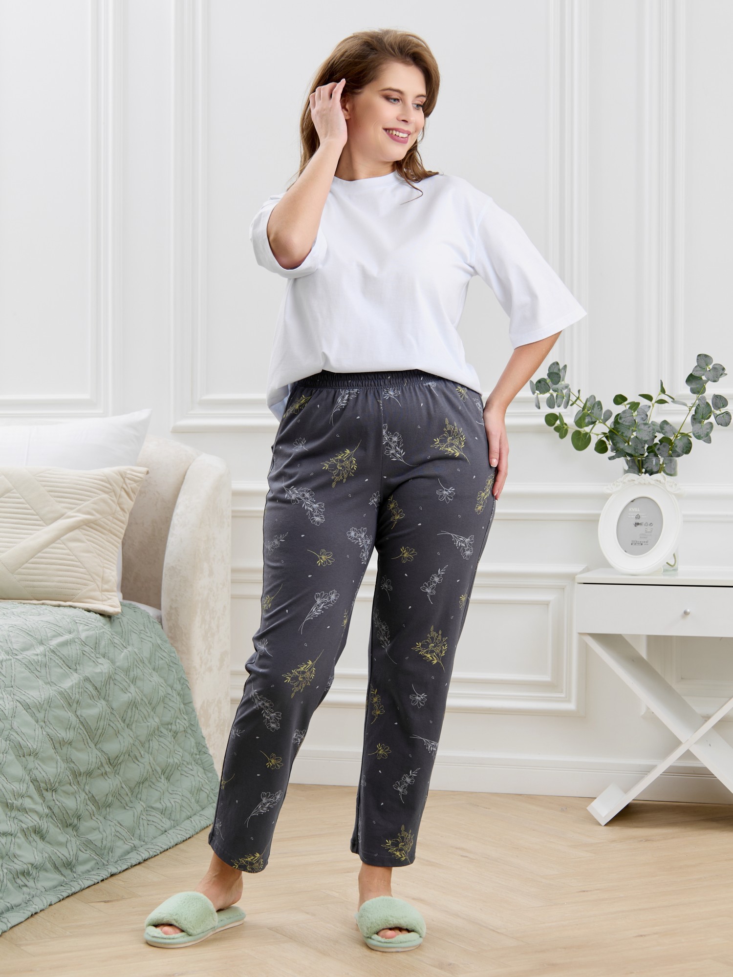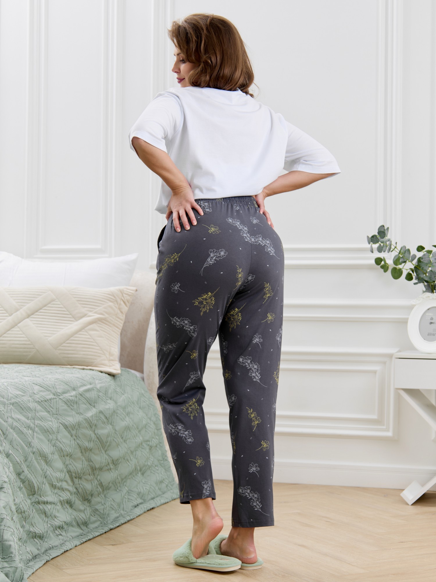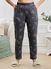 Брюки женские из трикотажного полотна «кулирка» с набивным рисунком, прямого кроя слегка зауженные книзу, с карманами в боковых швах, на притачном поясе с эластичной тесьмой внутри.