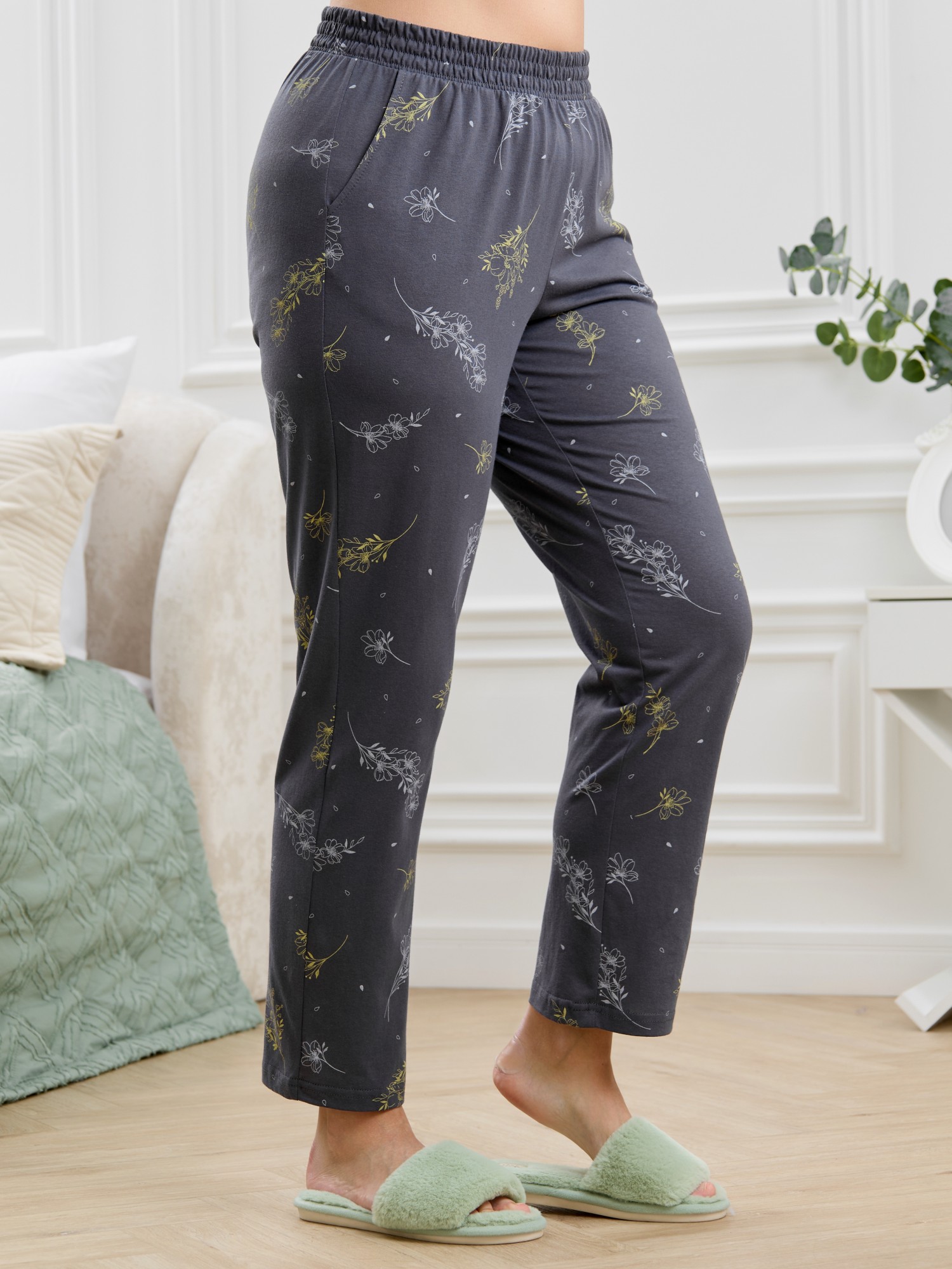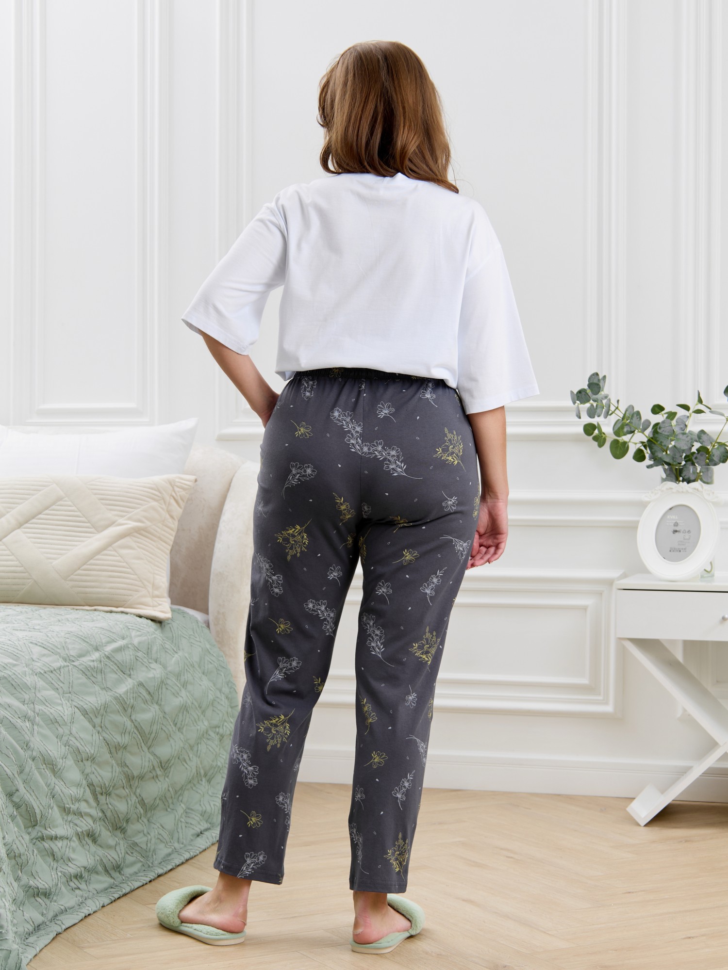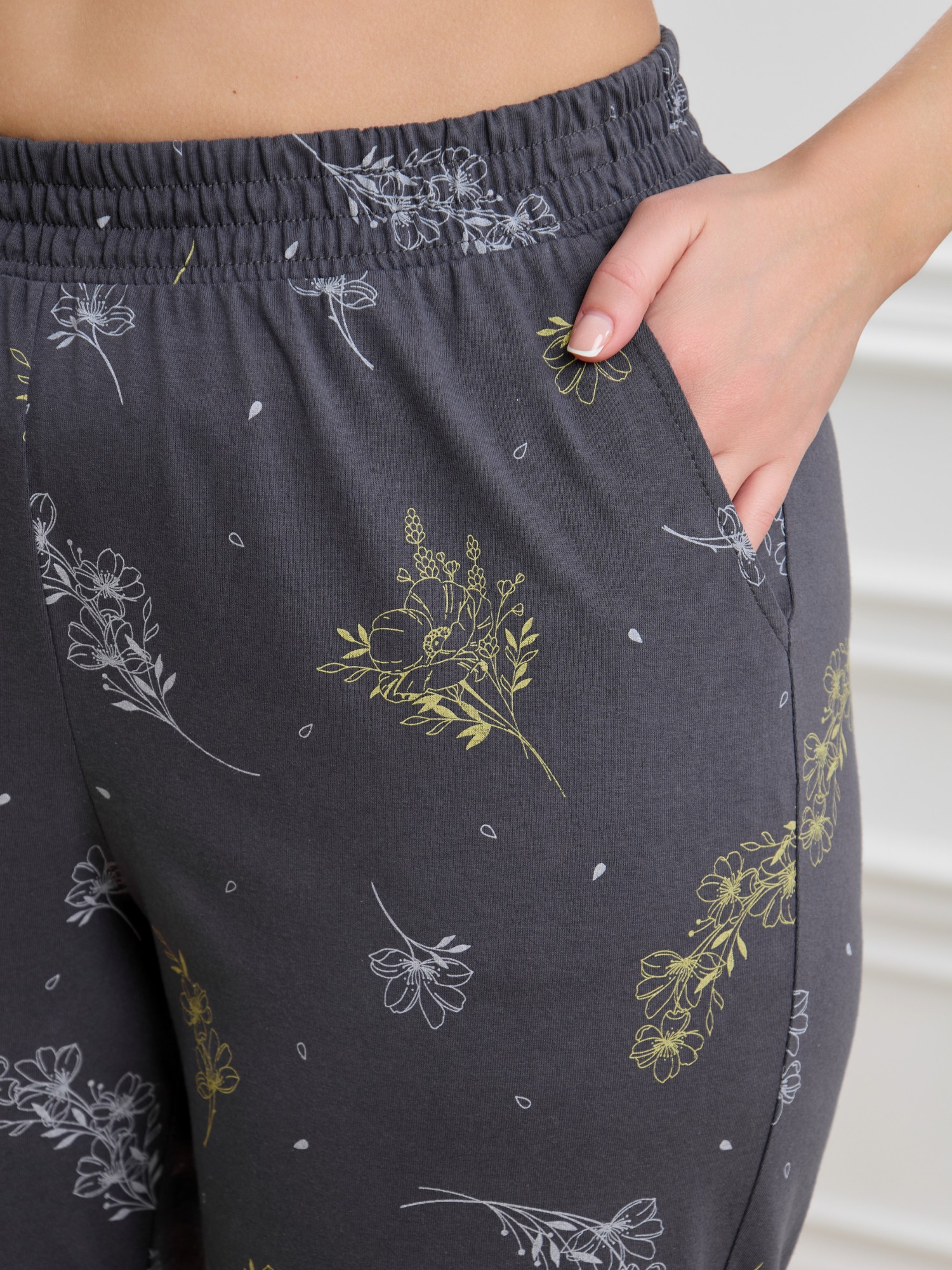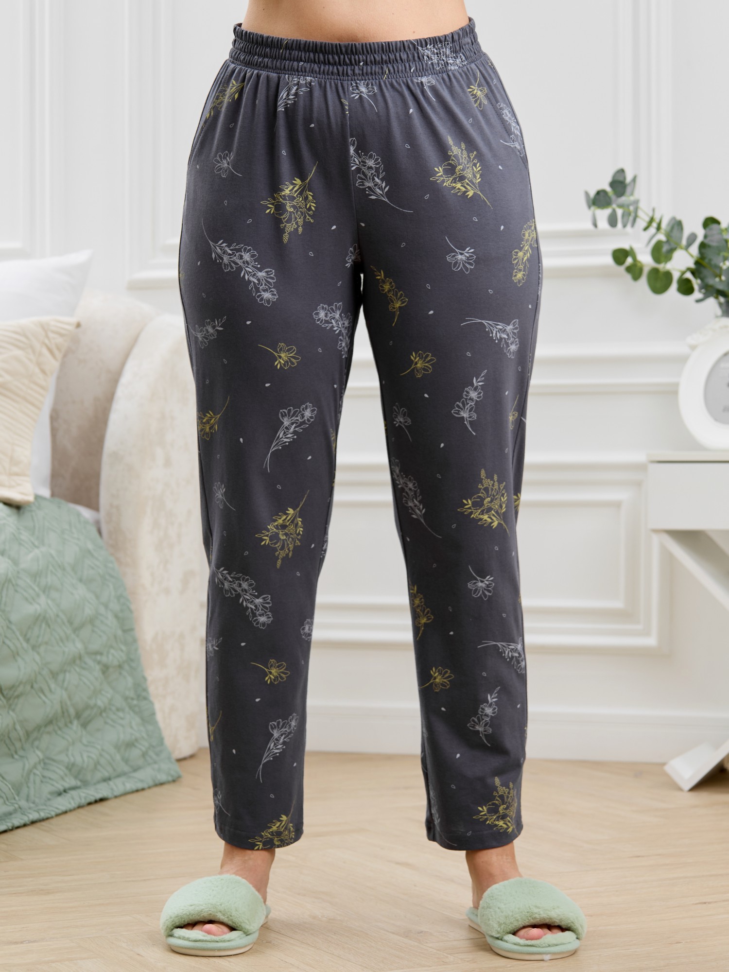 Брюки женские из трикотажного полотна «кулирка» с набивным рисунком, прямого кроя слегка зауженные книзу, с карманами в боковых швах, на притачном поясе с эластичной тесьмой внутри.