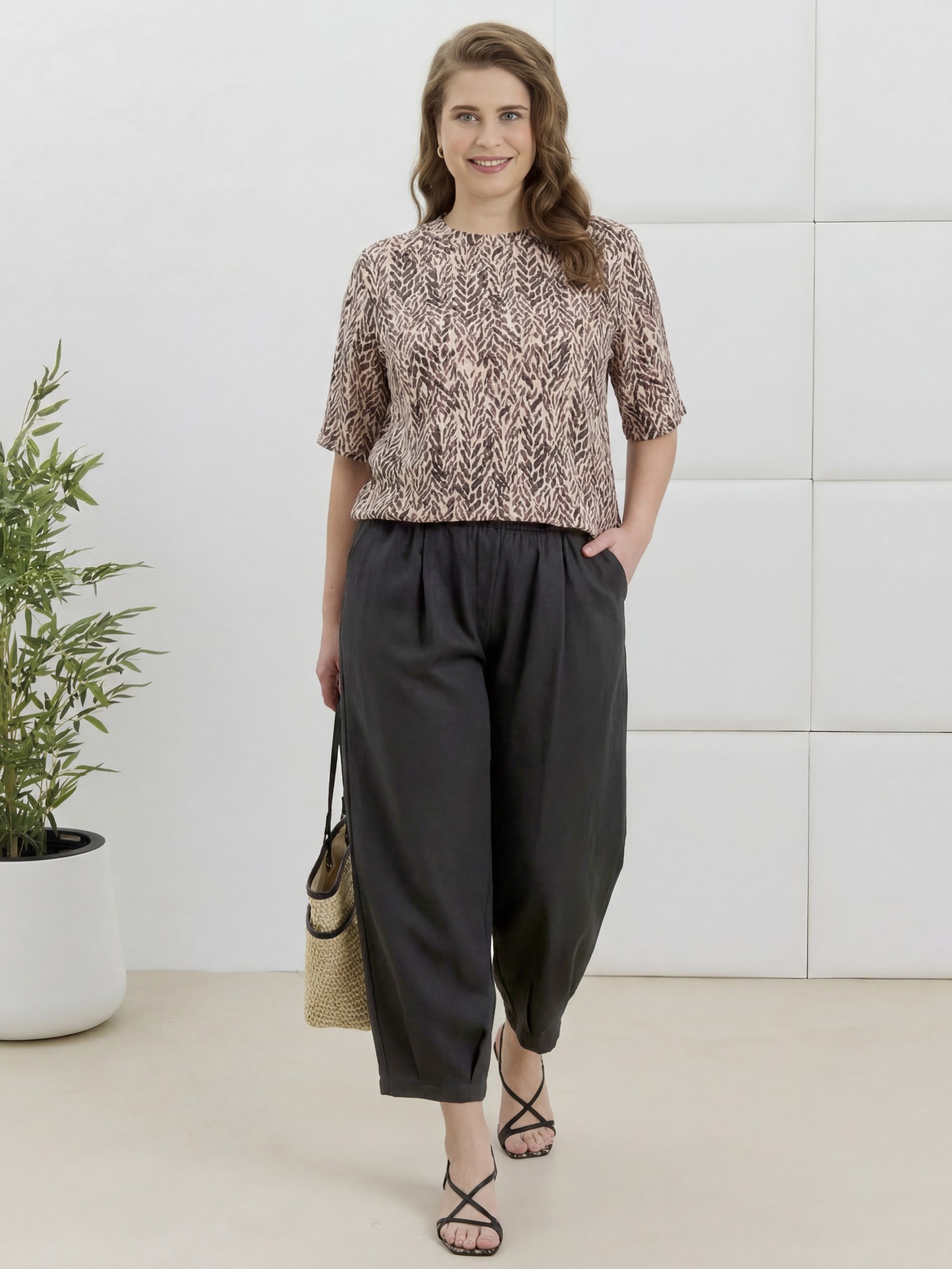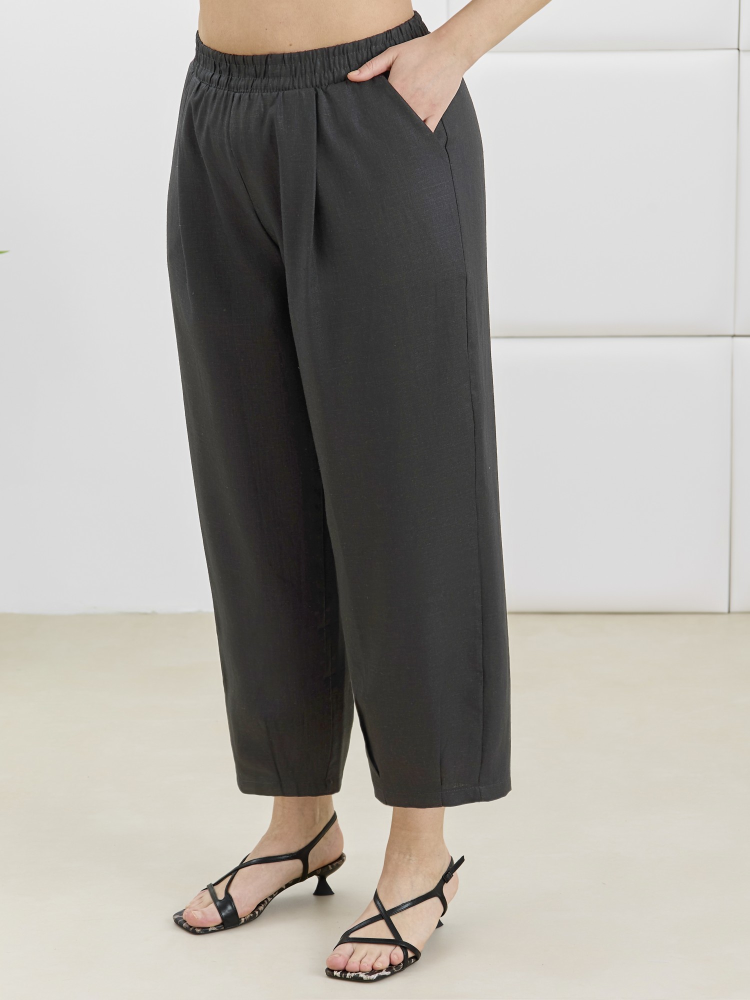Брюки женские «бананы» из гладкокрашеной плательной ткани, стандартной длины, с заложенными складками по талии, на притачном поясе с эластичной тесьмой внутри, с карманами в боковых швах, зауженные к низу. На нижних частях передних и задних половин застрочены складки-защипы.