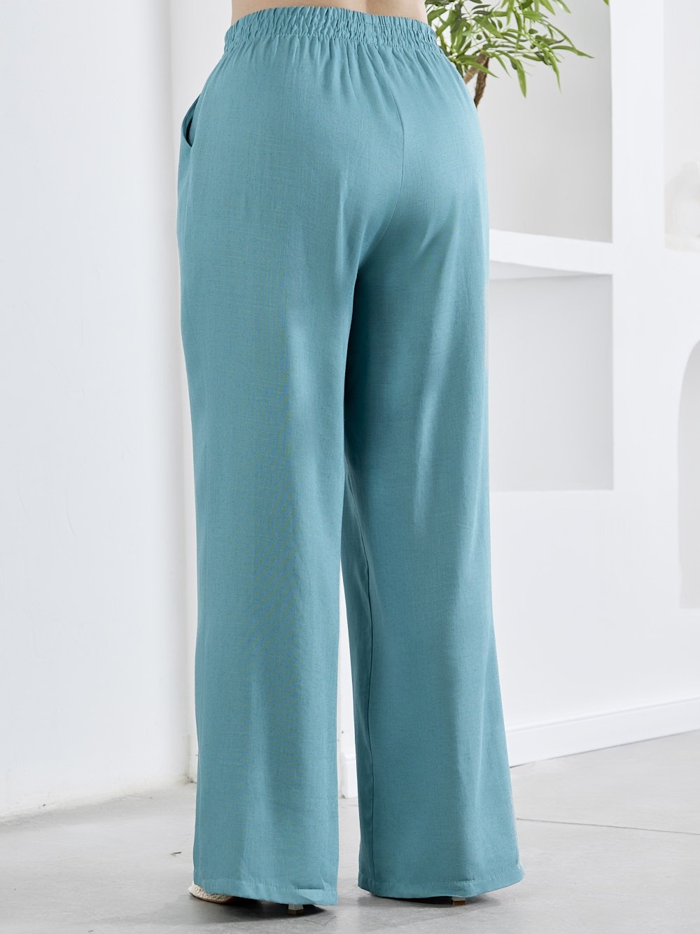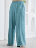 Брюки женские из гладкокрашеного тканого полотна, свободного кроя, удлиненные, с карманами в боковых швах, на притачном поясе с эластичной тесьмой внутри. Передние половины застрочены по центральным линиям.