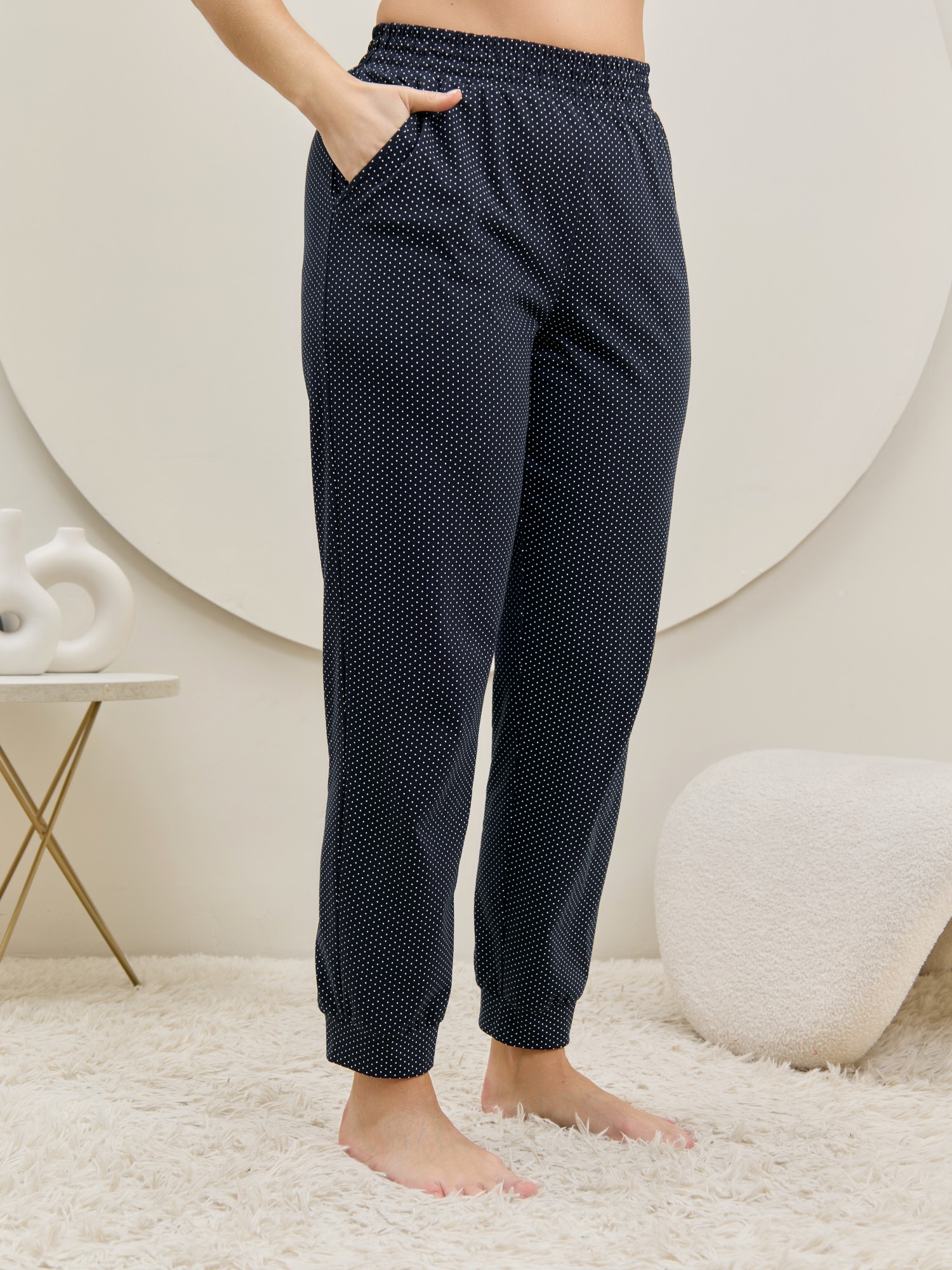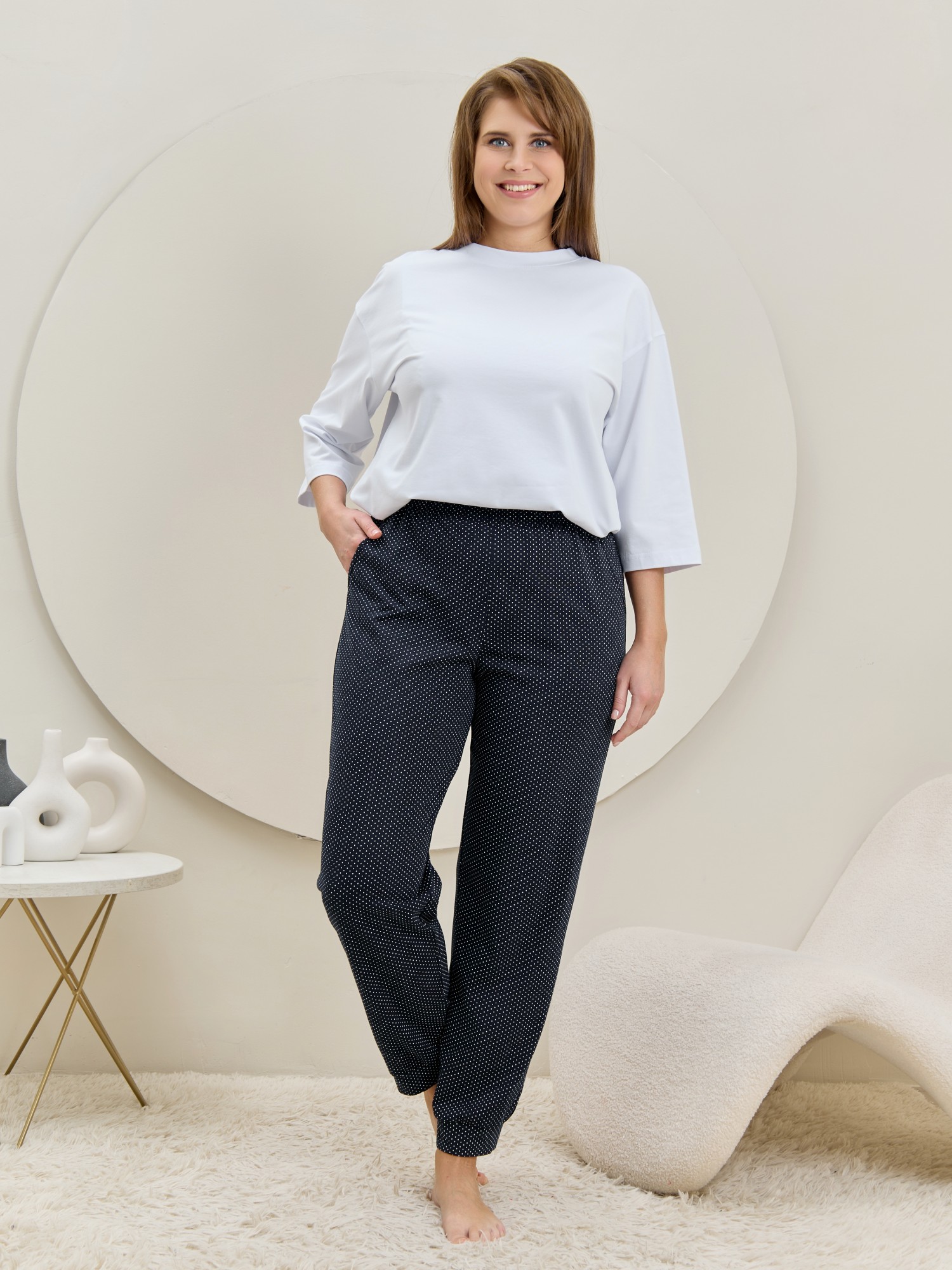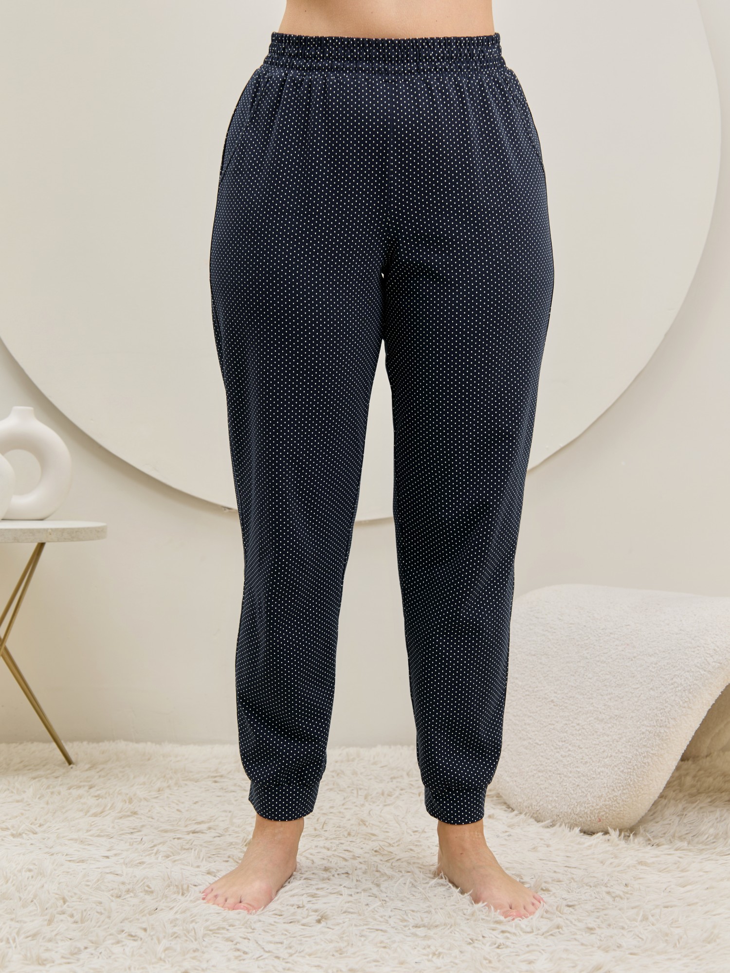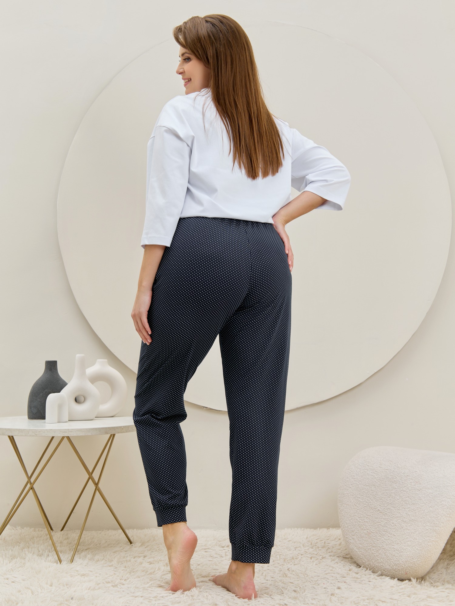 Брюки – женские из трикотажного полотна «кулирка» с набивным рисунком, полуприлегающего силуэта, длинные, с карманами в боковых швах, на притачном поясе с эластичной тесьмой внутри. Нижние срезы обработаны манжетами.