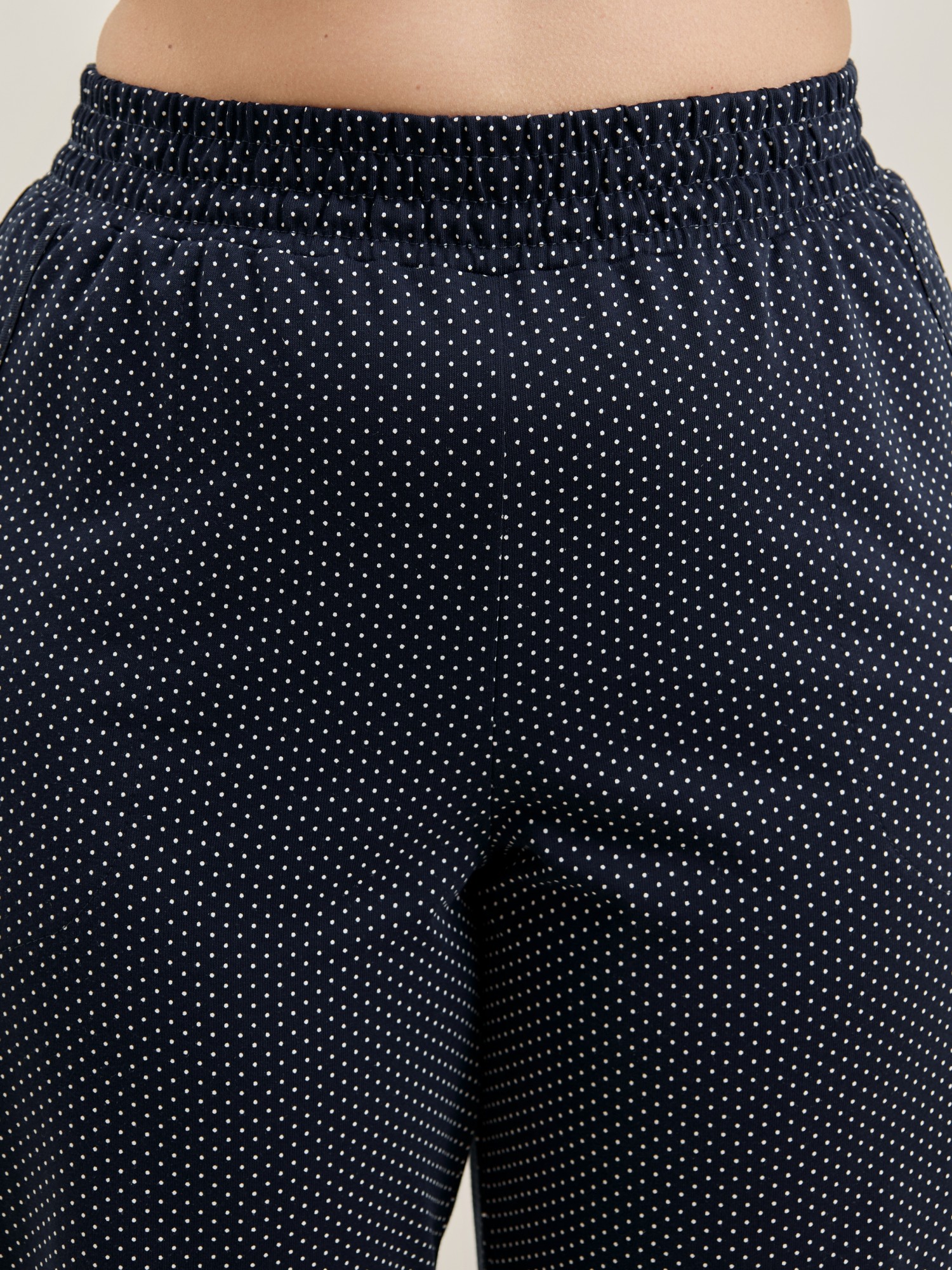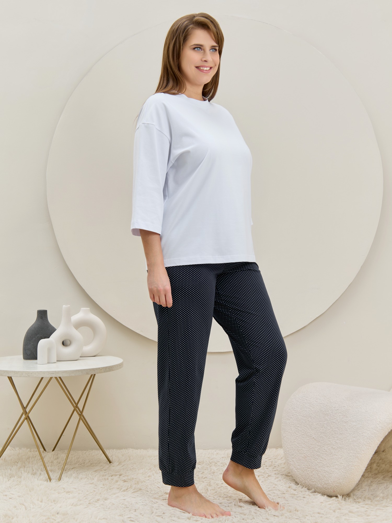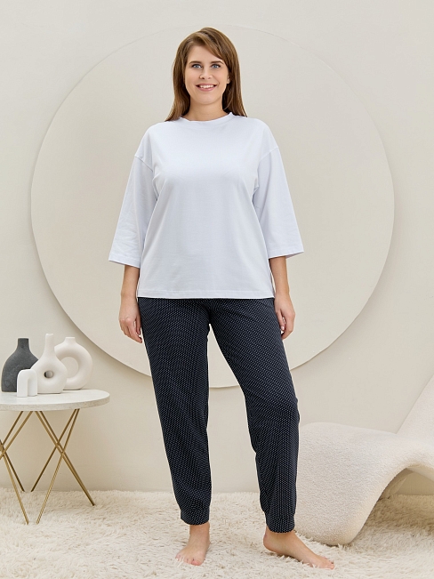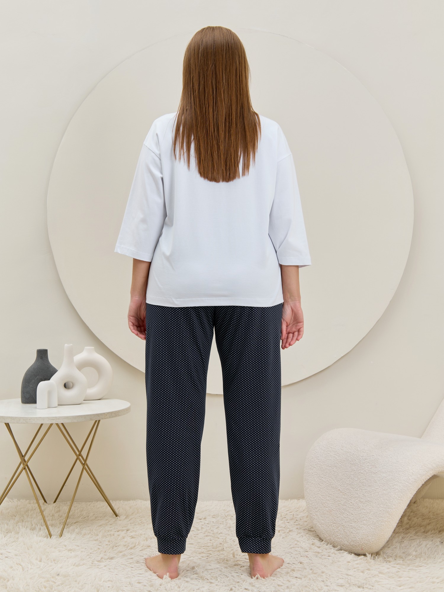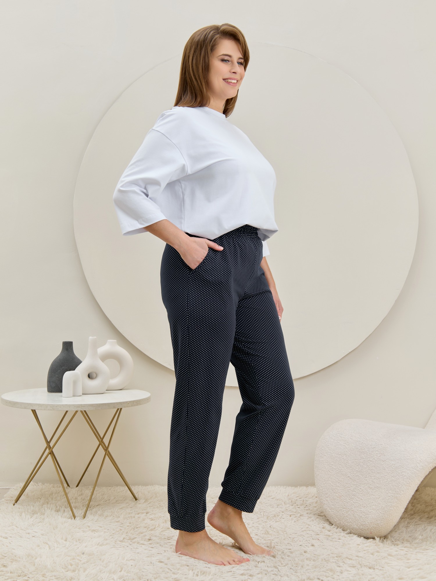 Брюки – женские из трикотажного полотна «кулирка» с набивным рисунком, полуприлегающего силуэта, длинные, с карманами в боковых швах, на притачном поясе с эластичной тесьмой внутри. Нижние срезы обработаны манжетами.