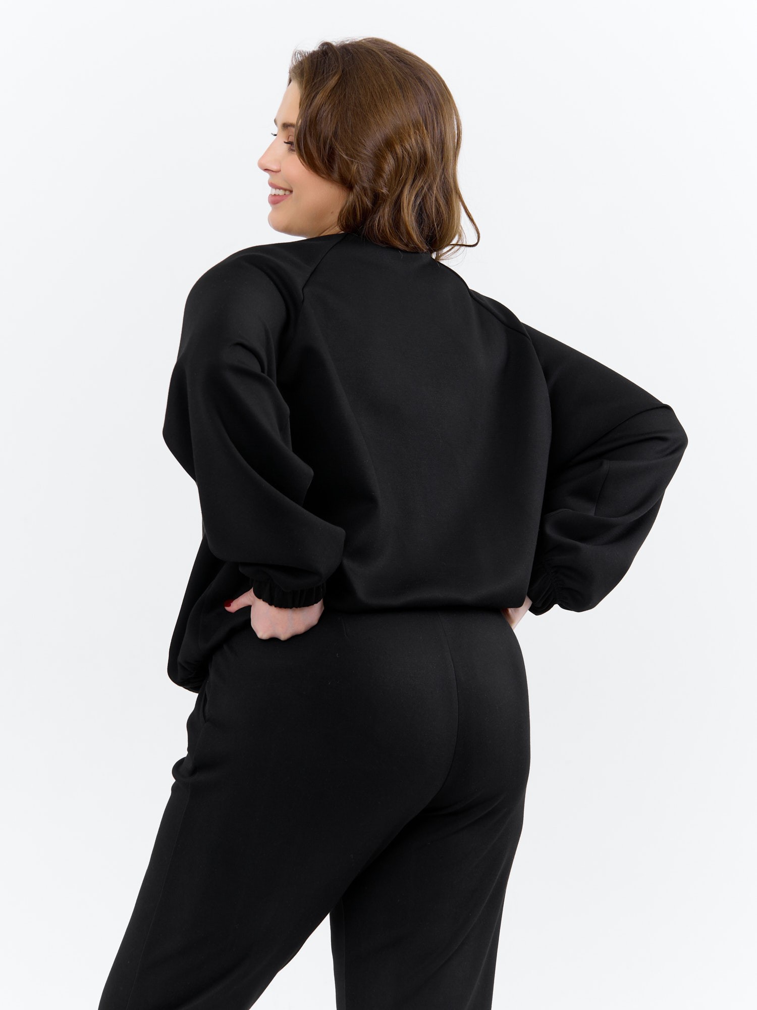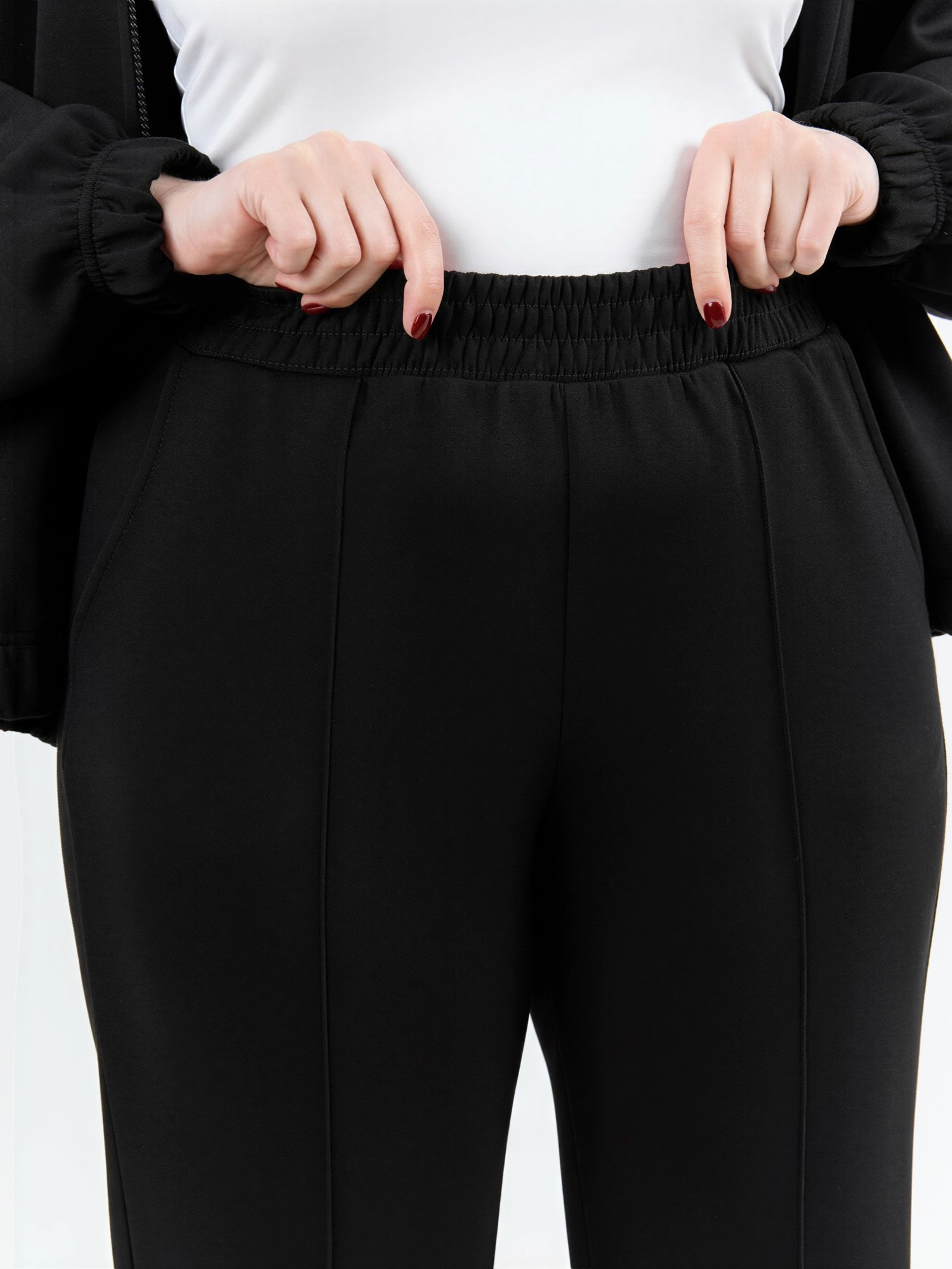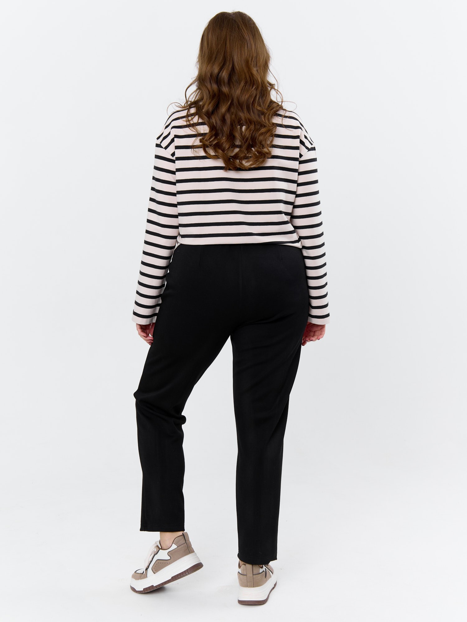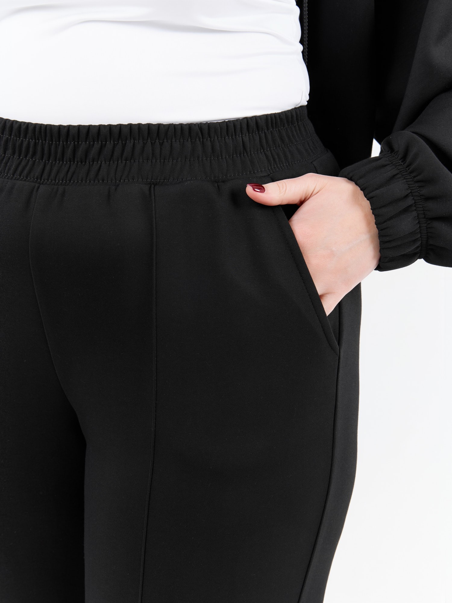 Брюки женские из трикотажного гладкокрашеного полотна «скуба», длинные, полуприлегающего силуэта, на притачном поясе с эластичной тесьмой внутри и карманами в боковых швах. Передние половины застрочены по центральным линиям, на задних половинах обработаны две вытачки в области талии.