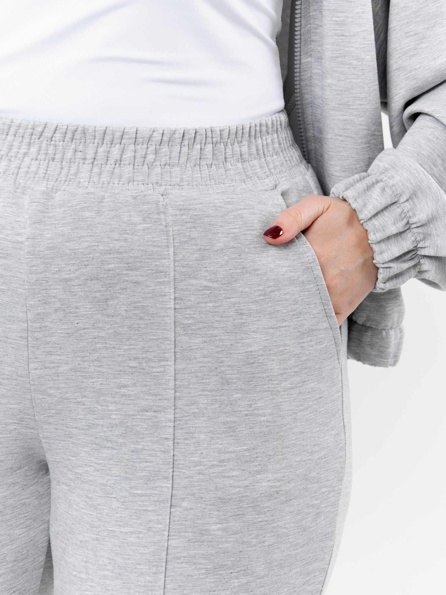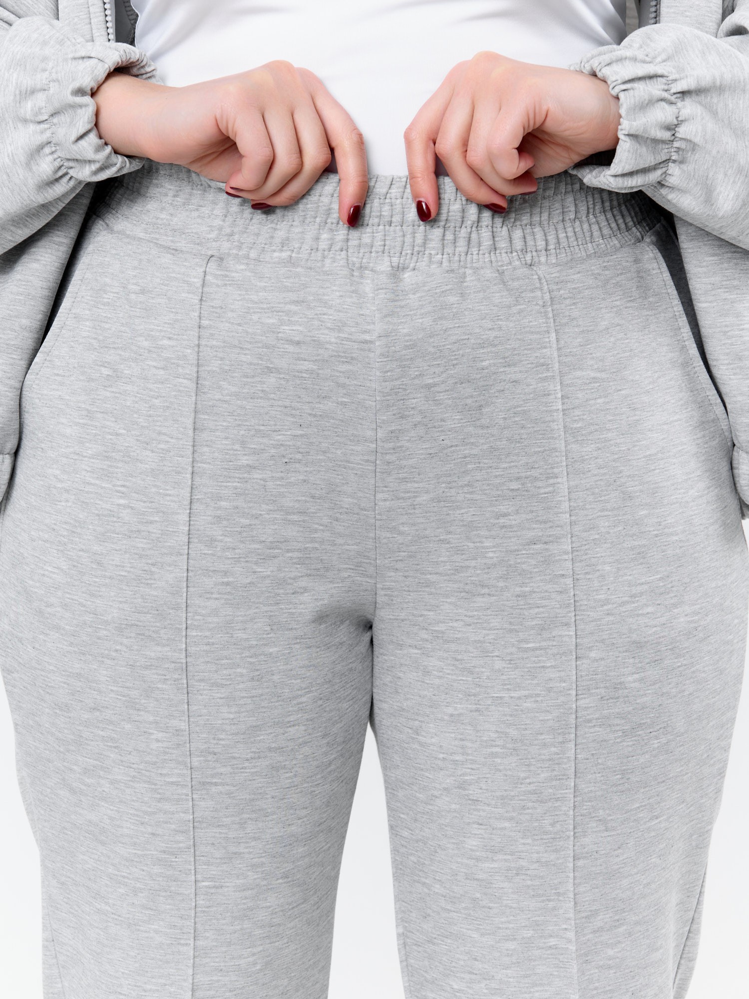 Брюки женские из трикотажного гладкокрашеного полотна «скуба», длинные, полуприлегающего силуэта, на притачном поясе с эластичной тесьмой внутри и карманами в боковых швах. Передние половины застрочены по центральным линиям, на задних половинах обработаны две вытачки в области талии.