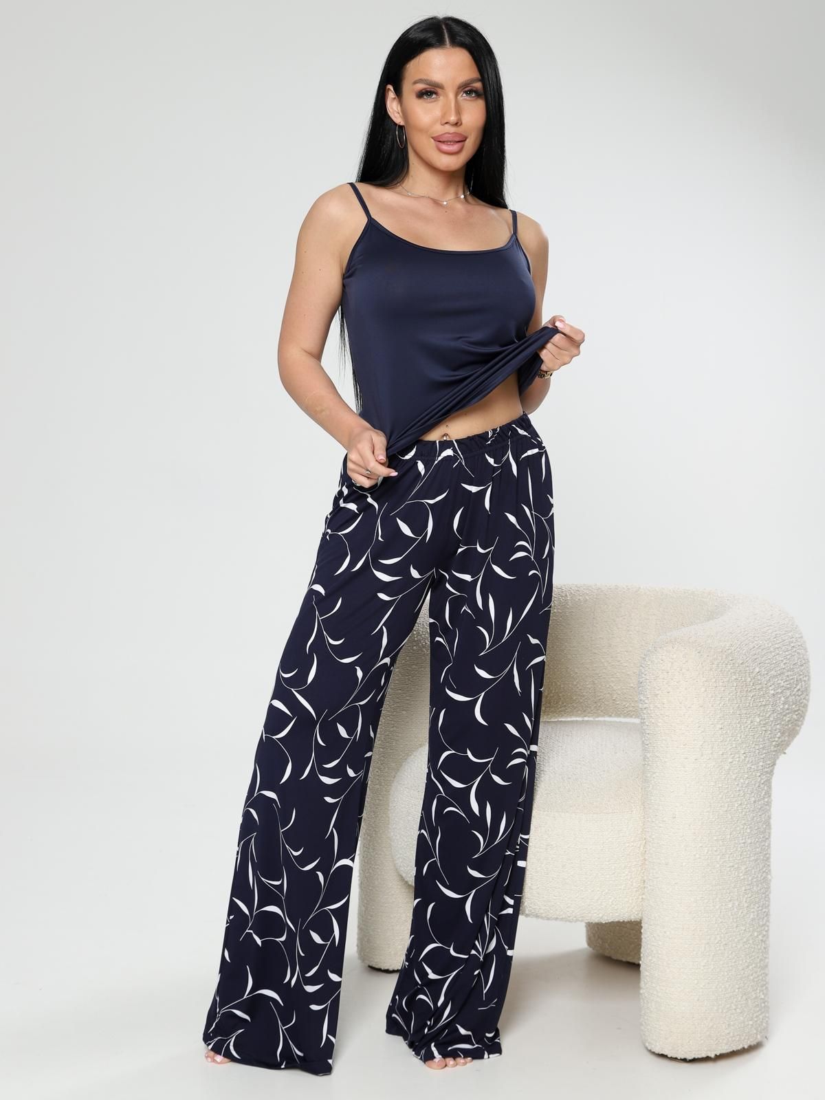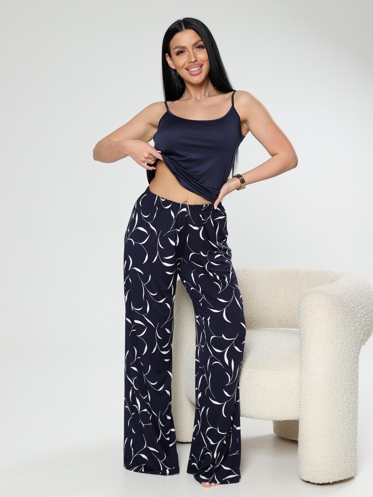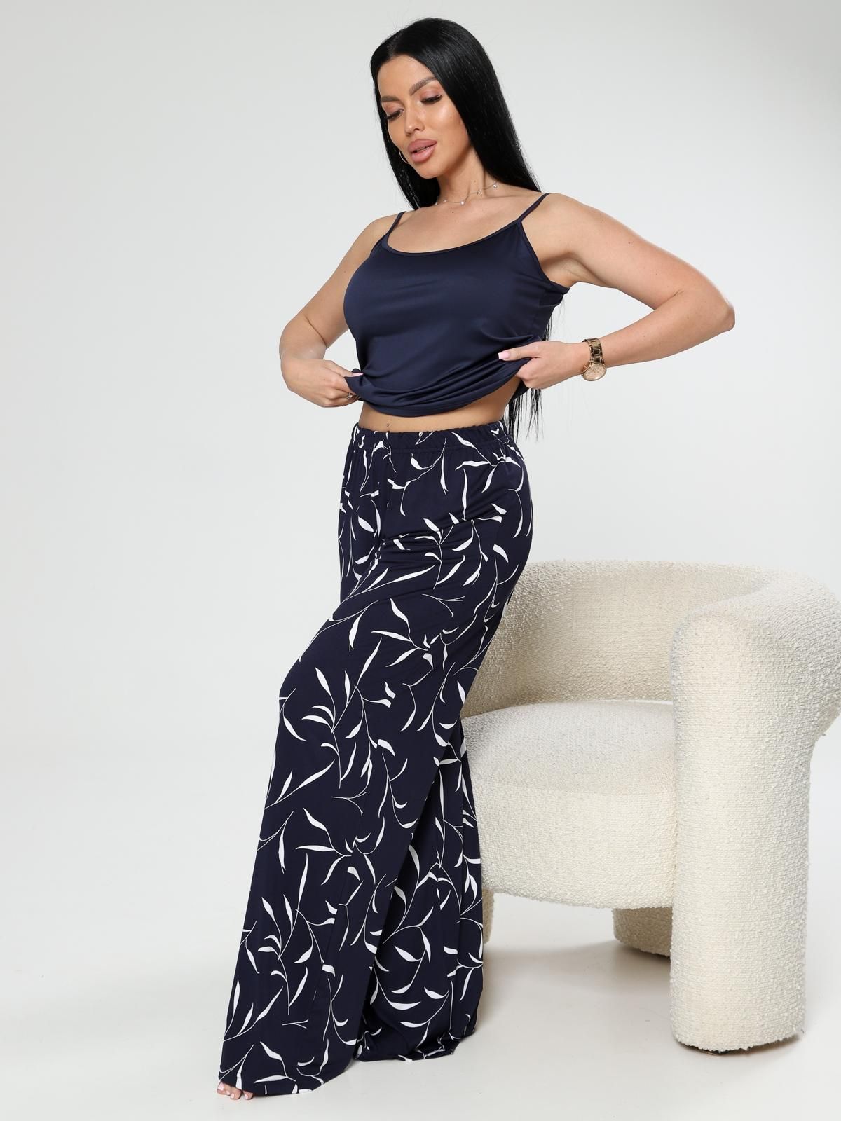 Женские брюки из ткани масло — это модель из эластичного трикотажа, который сочетает мягкость, струящуюся текстуру и хорошую растяжимость. Такая ткань обеспечивает комфорт, свободу движений и часто используется для повседневной носки, домашних образов или прогулок.