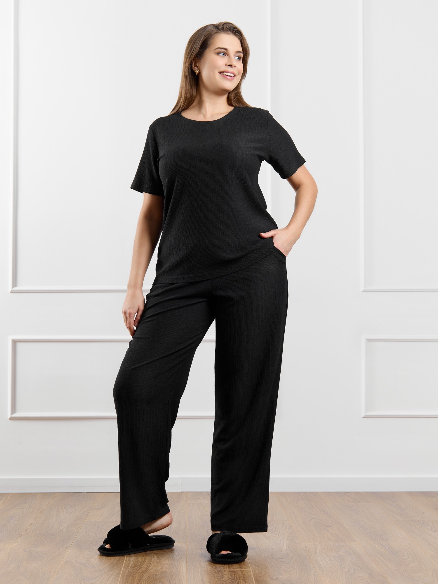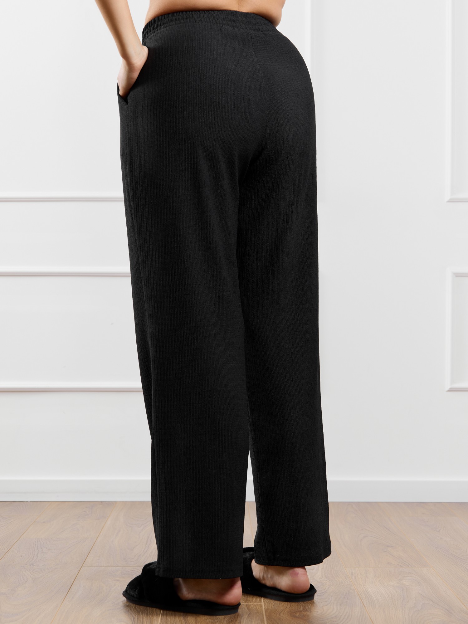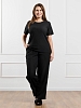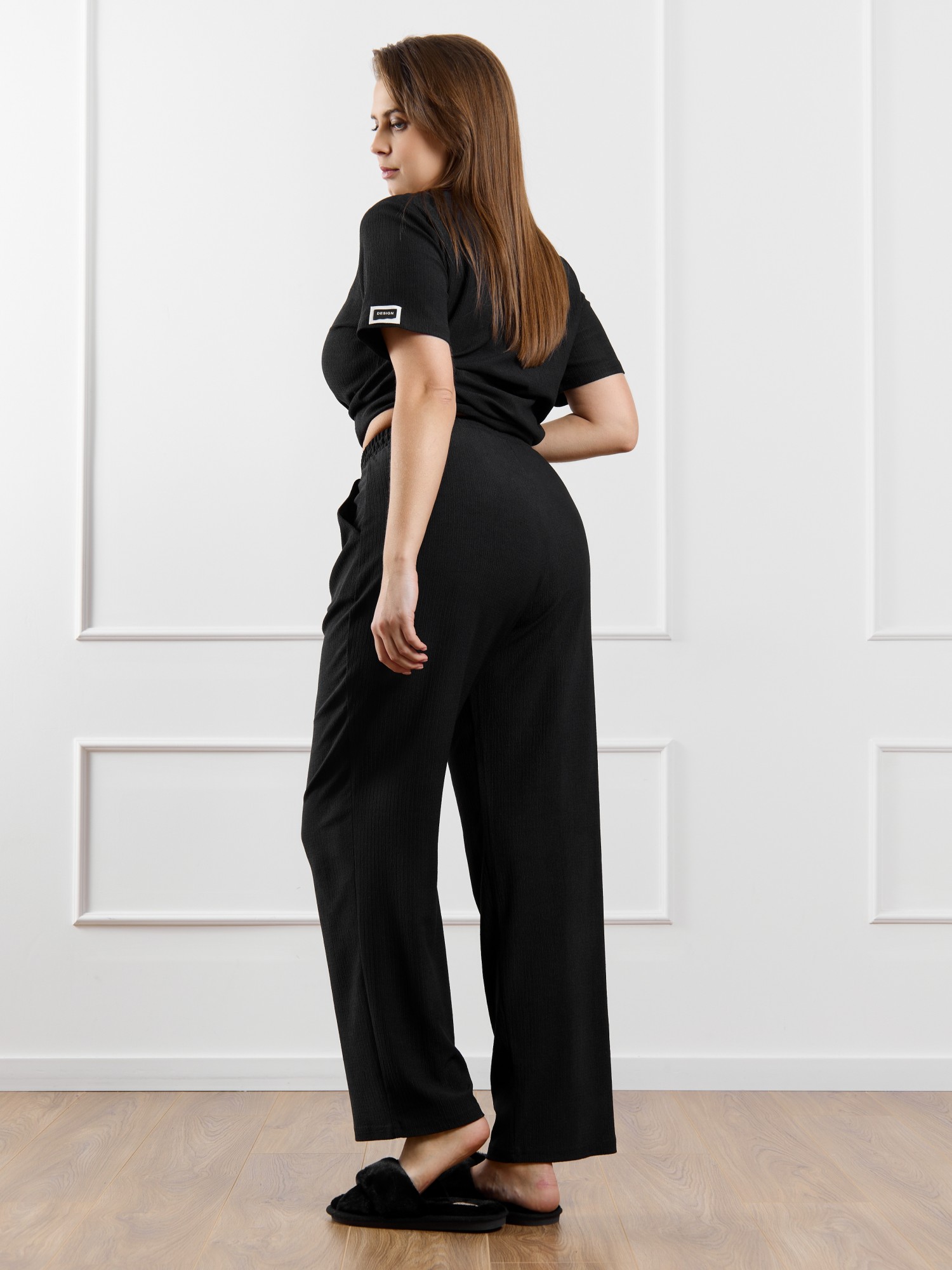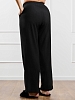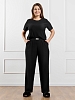 Брюки женские из гладкокрашенного трикотажного полотна «бурумчук», свободного покроя, с карманами в боковых швах, на притачном поясе с эластичной тесьмой внутри.