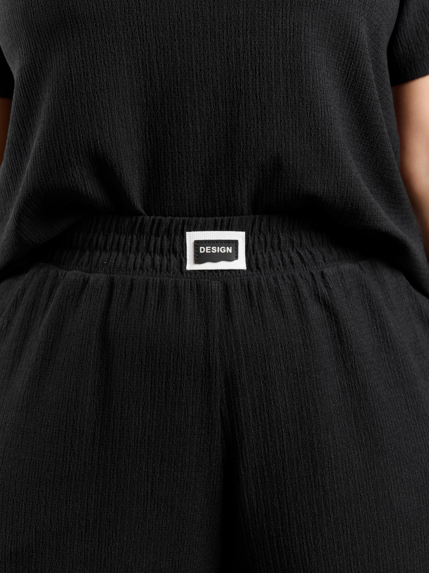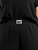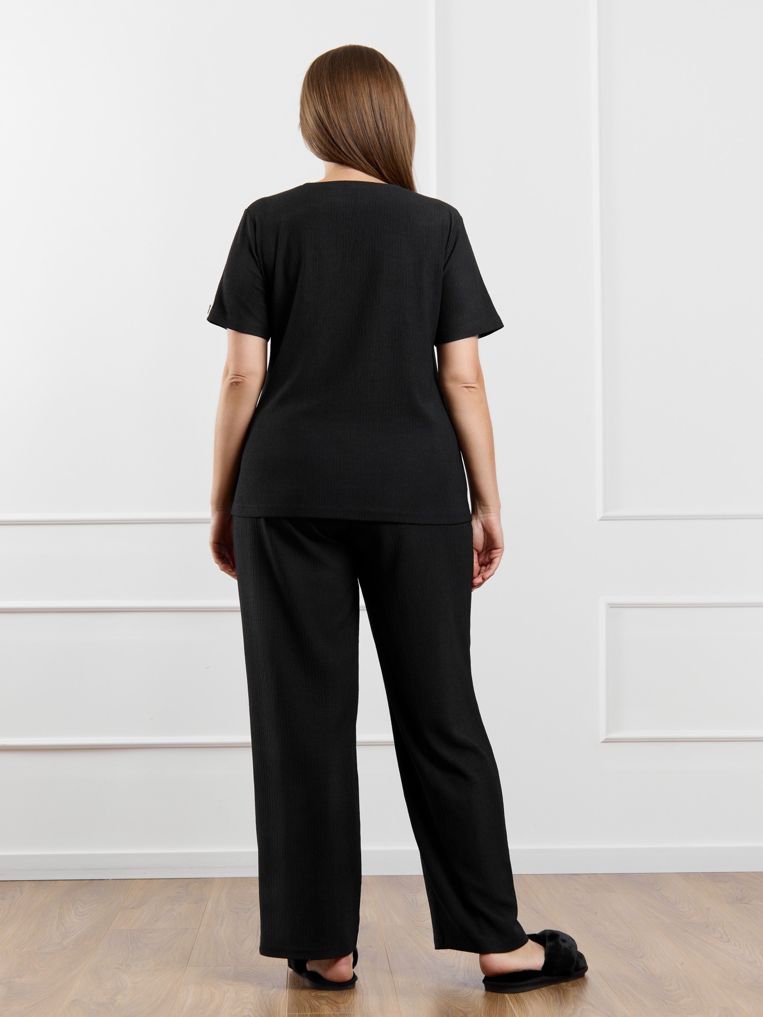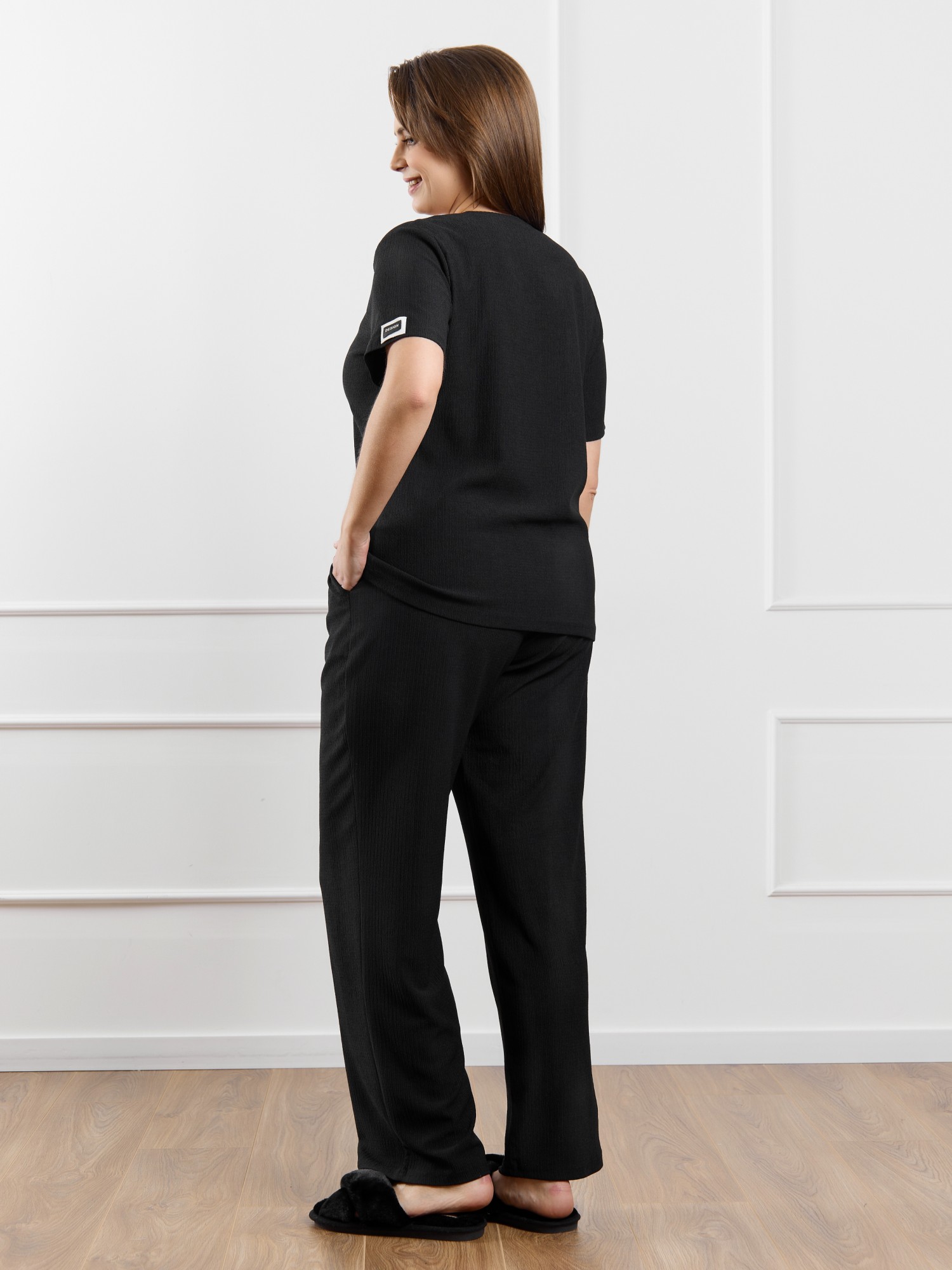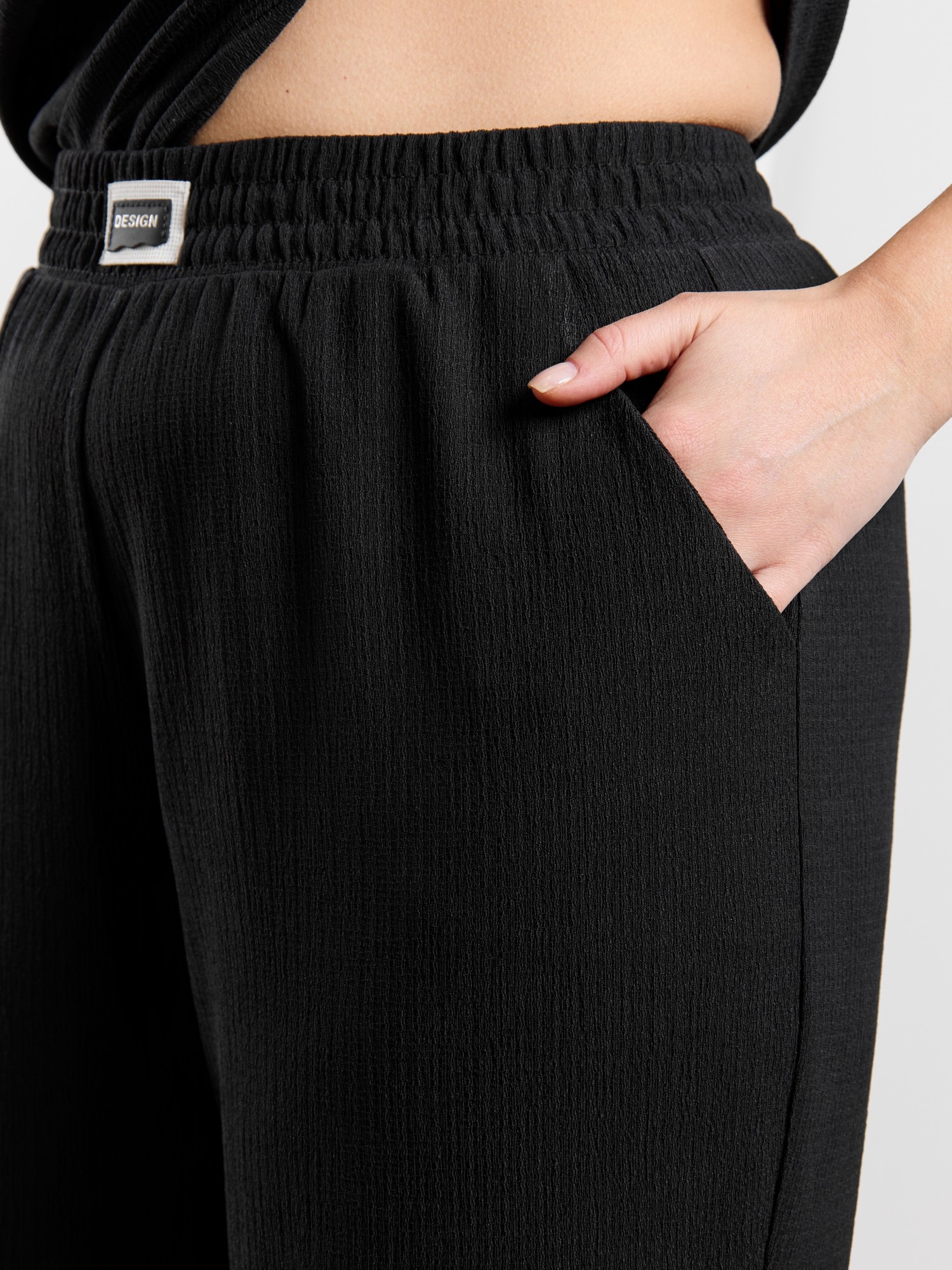 Брюки женские из гладкокрашенного трикотажного полотна «бурумчук», свободного покроя, с карманами в боковых швах, на притачном поясе с эластичной тесьмой внутри.