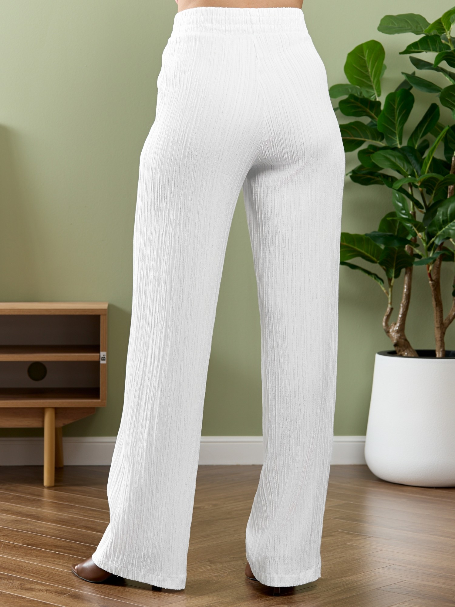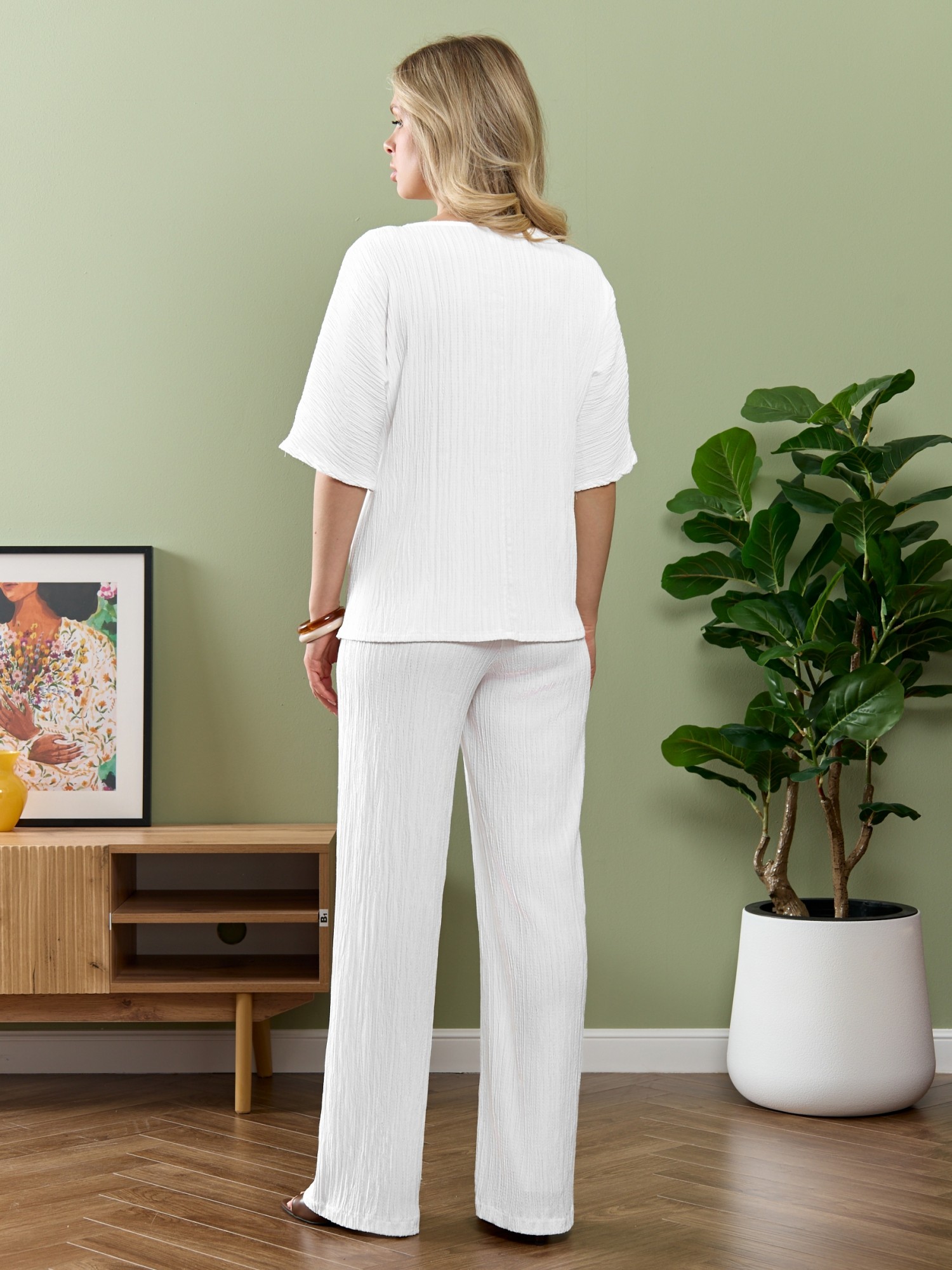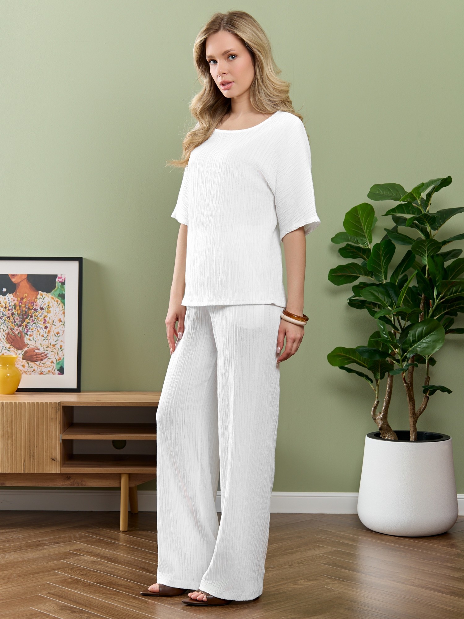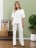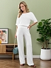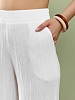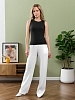 Брюки женские из гладкокрашеного тканого полотна, свободного покроя, с карманами в боковых швах, на притачном поясе с эластичной тесьмой внутри. При выборе изделия в белом цвете идеальным решением будет выбор белья нейтральных оттенков.